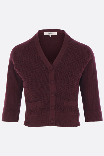 Cardigan di Chloé realizzato in maglia di lana color viola. Caratterizzato da scollatura a V, chiusura frontale con bottoni tono su tono, maniche a 3/4, bordi a costine e fondo dritto.