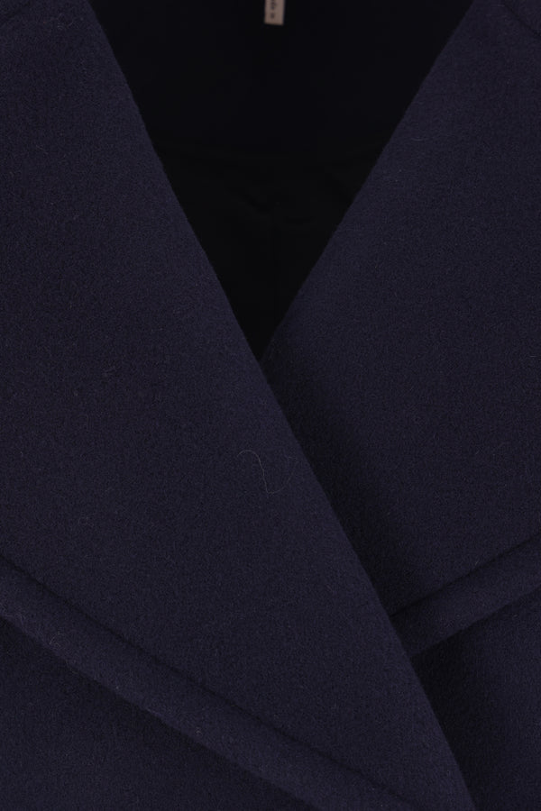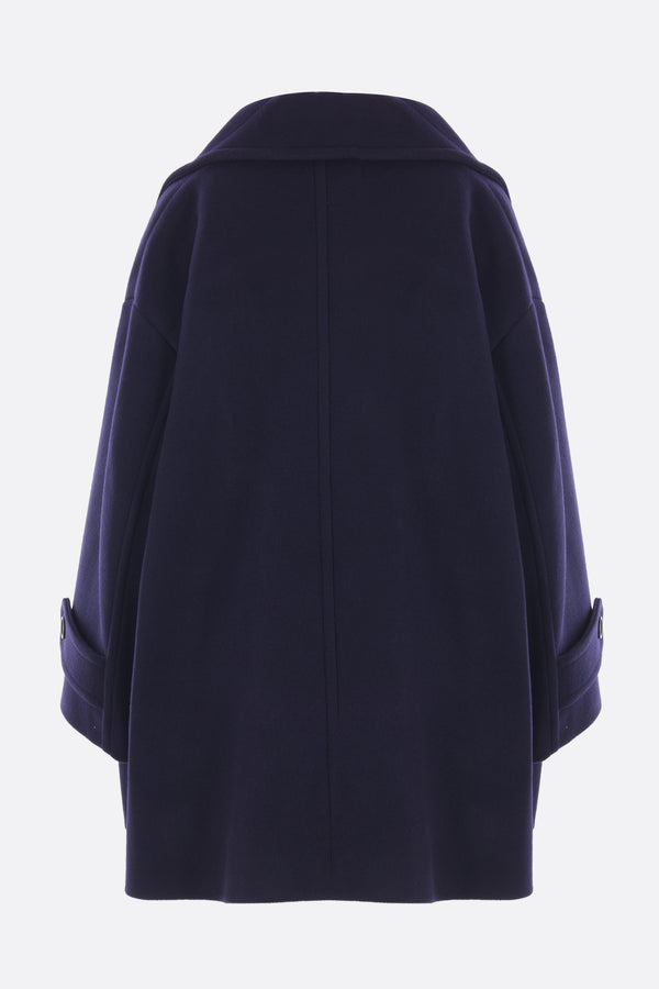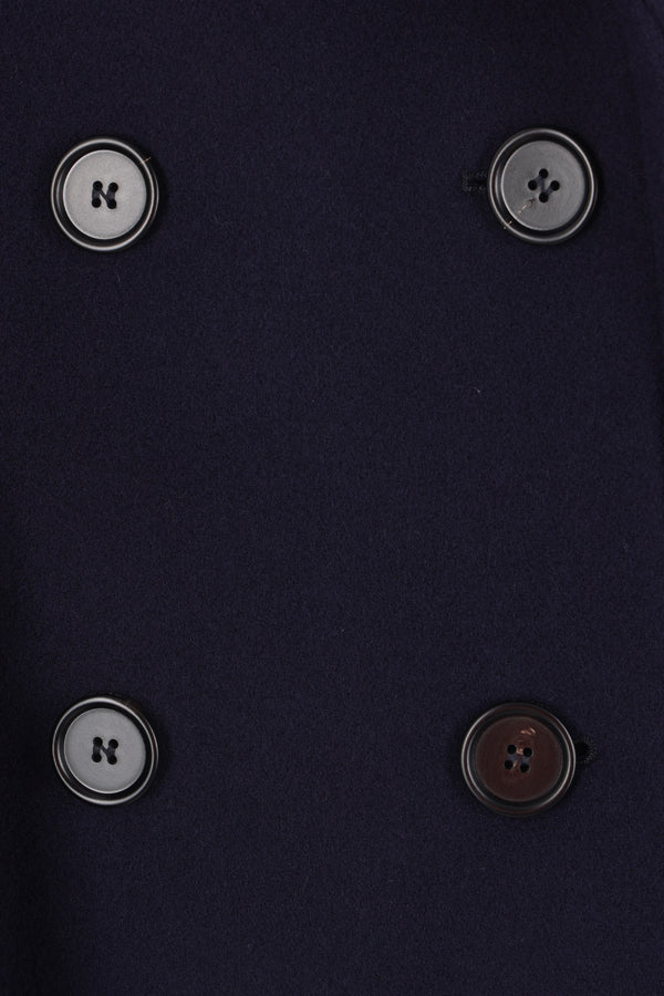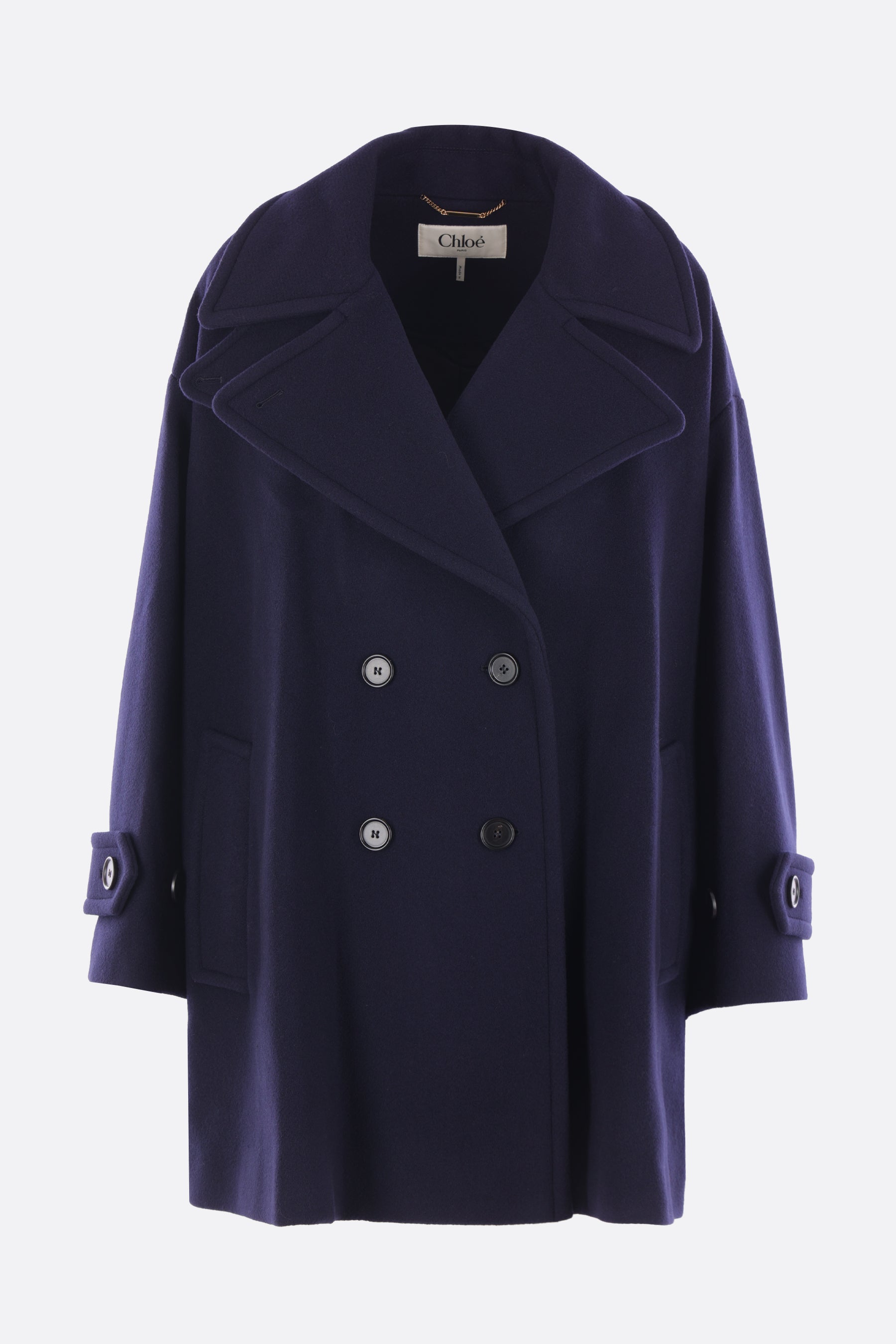 Cappotto oversize di Chloé realizzato in panno di misto lana color blu. Caratterizzato da ampi revers, chiusura doppiopetto con bottoni, tasche a filetto, maniche lunghe con mostrine sui polsi e interno foderato.