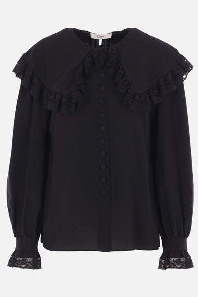 Camicia di Chloé realizzata in crepe di seta color nero. Caratterizzata da colletto oversize bordato in pizzo, chiusura frontale con bottoni tono su tono, maniche lunghe con polsini a corolla e fondo dritto.