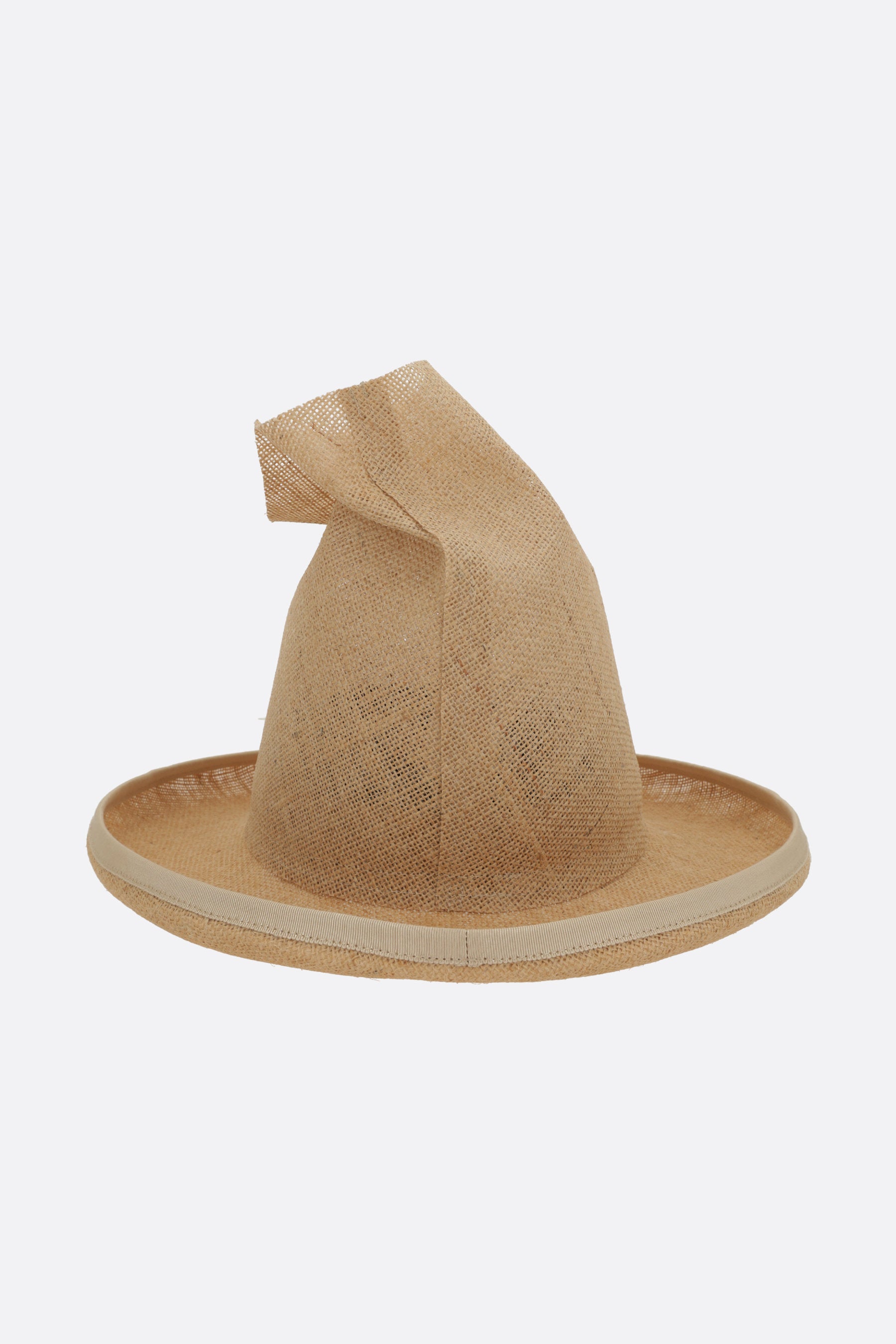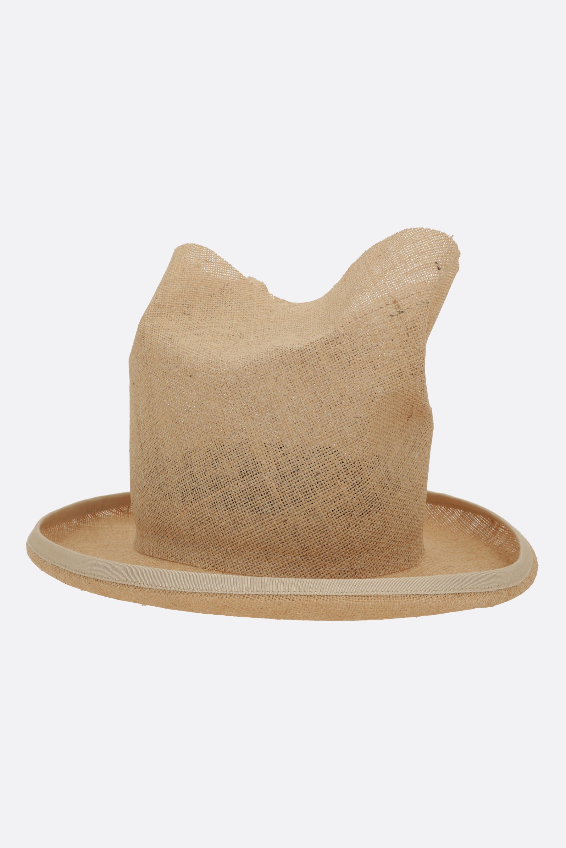 Cappello di Comme Des Garçons disegnato in collaborazione con Hizume e realizzato in juta color naturale. Caratterizzato da forma sagomata e aperta sulla parte superiore e falda arrotondata con profilo in gros grain.