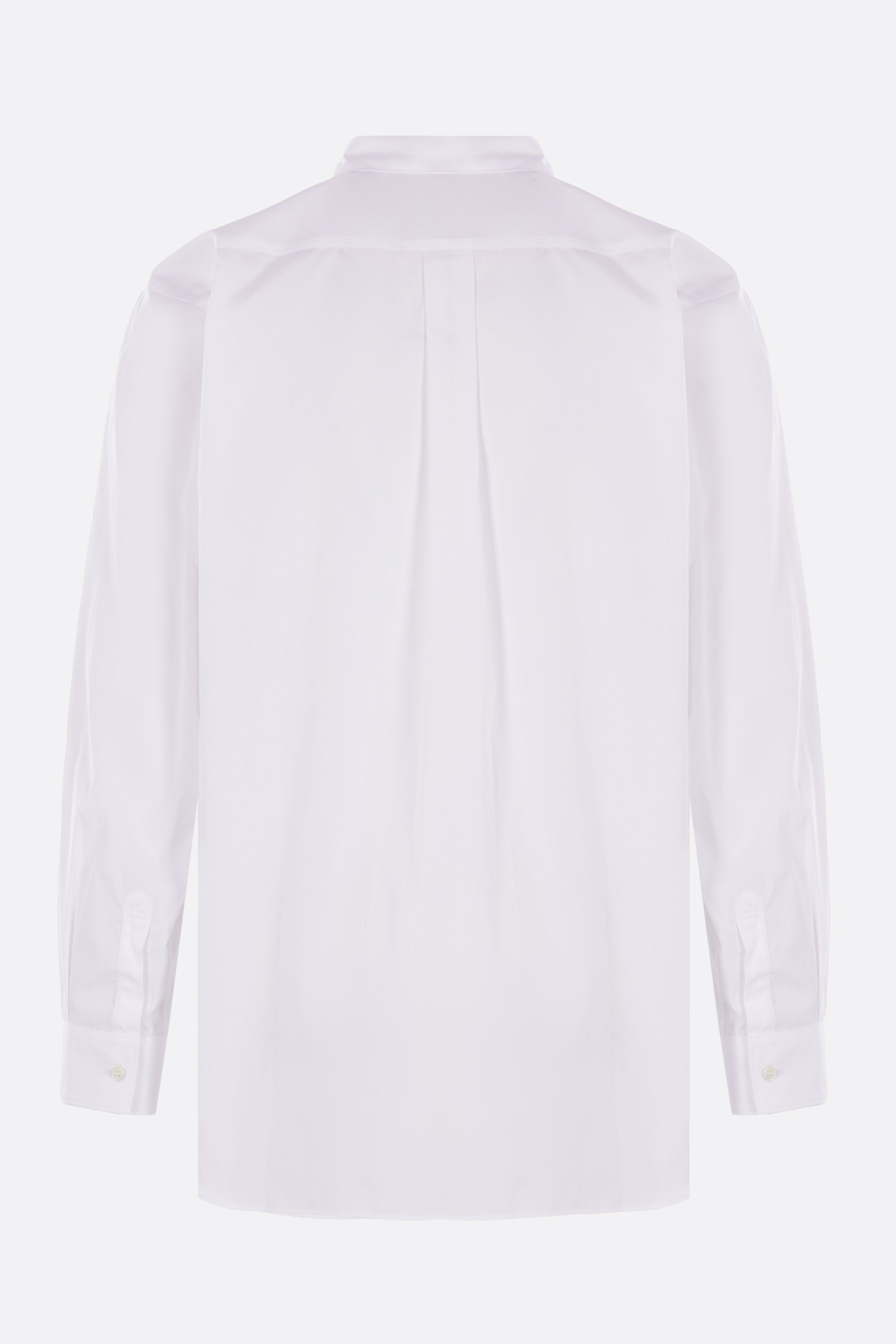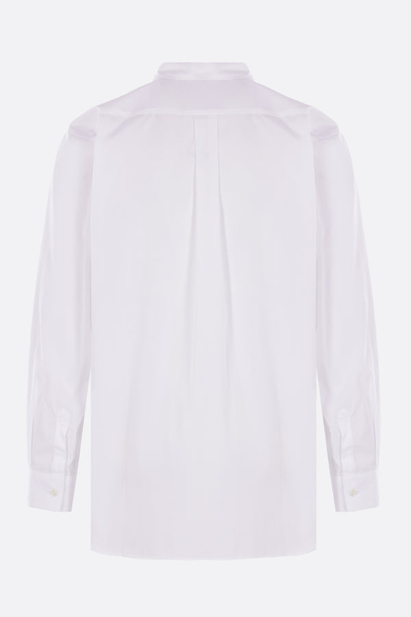 Camicia di Comme des Garçons Shirt realizzata in popeline di cotone color bianco con stampa grafica sul davanti. Caratterizzata da colletto classico, chiusura frontale con bottoni, tasca applicata sul petto, maniche lunghe con polsini abbottonati e fondo arrotondato.