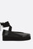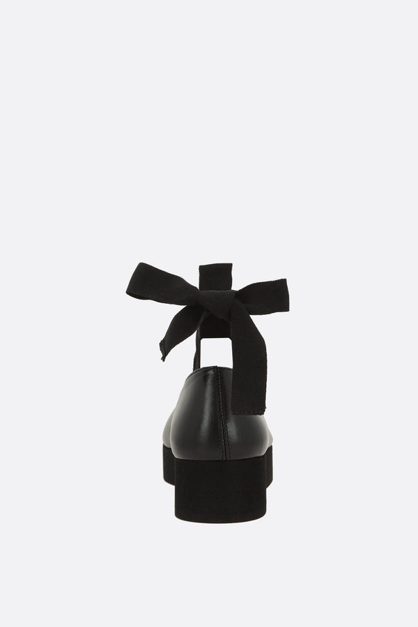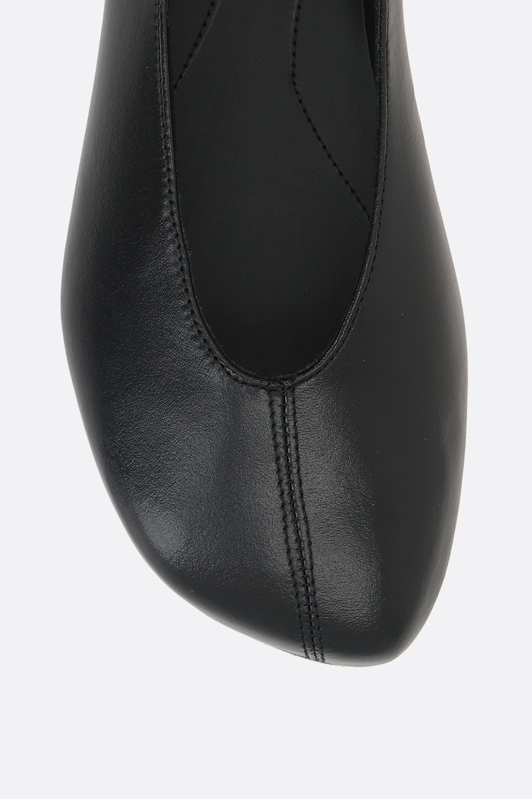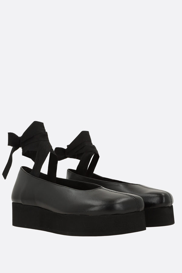 Ballerina di PHILEO disegnata in collaborazione con Comme des Garçons e realizzata in pelle liscia color nero. Caratterizzata da punta squadrata con angoli smussati, cinturino incrociato alla caviglia, fodere in pelle e suola in gomma.