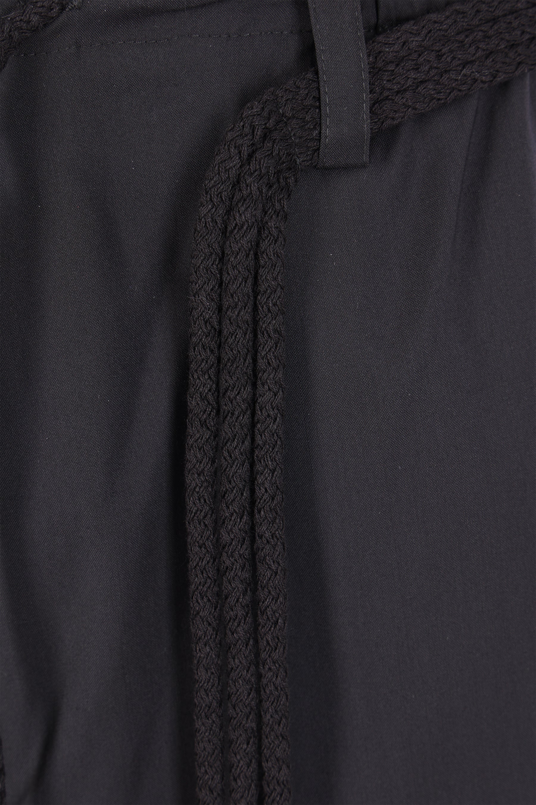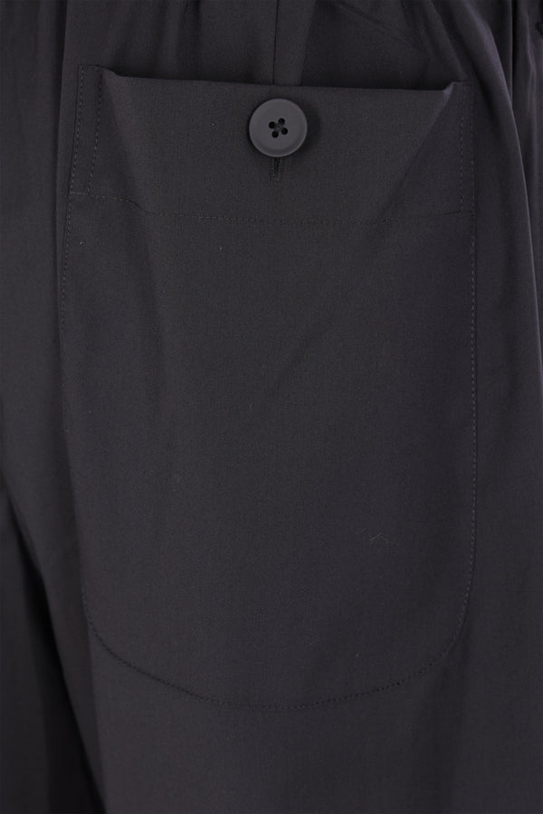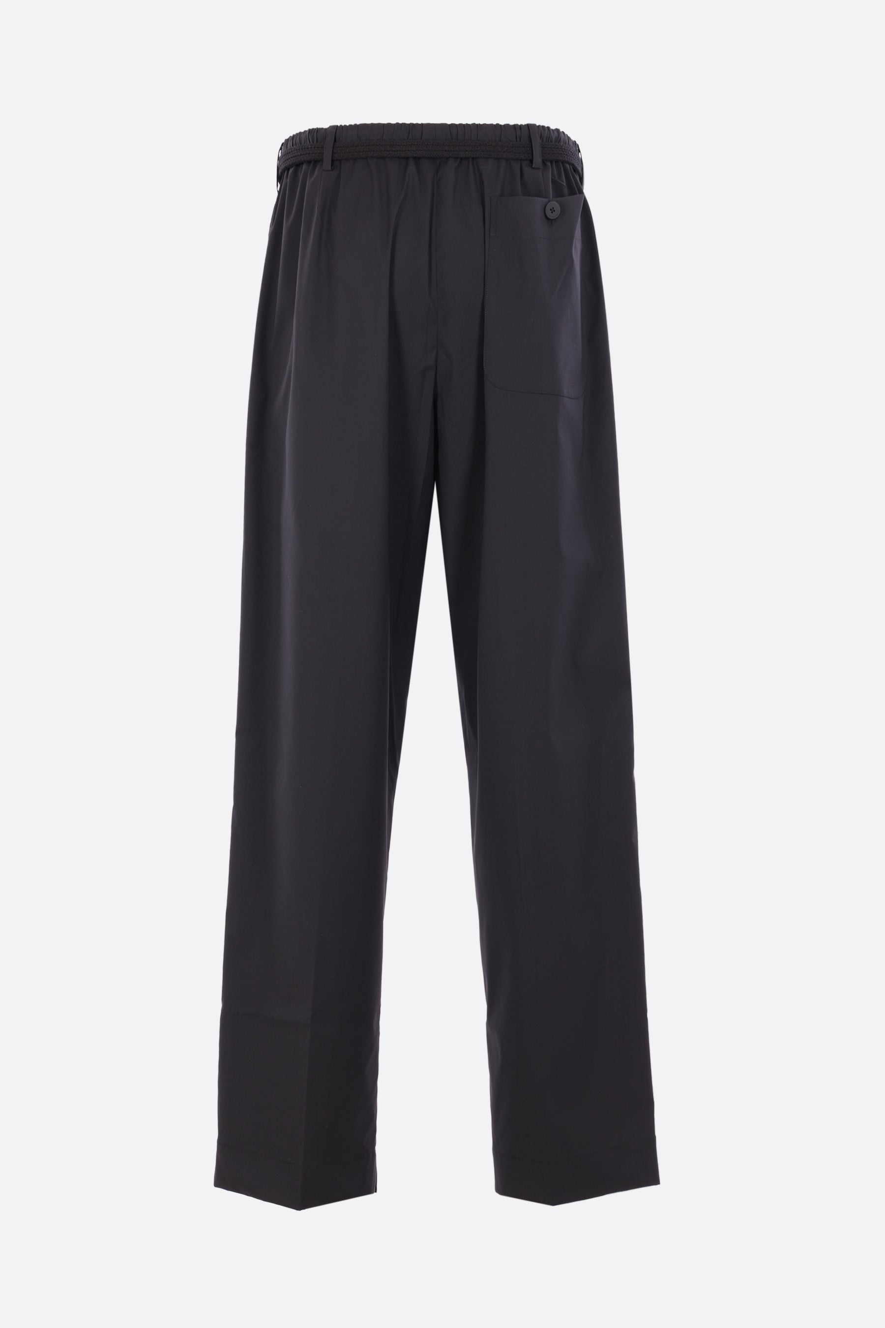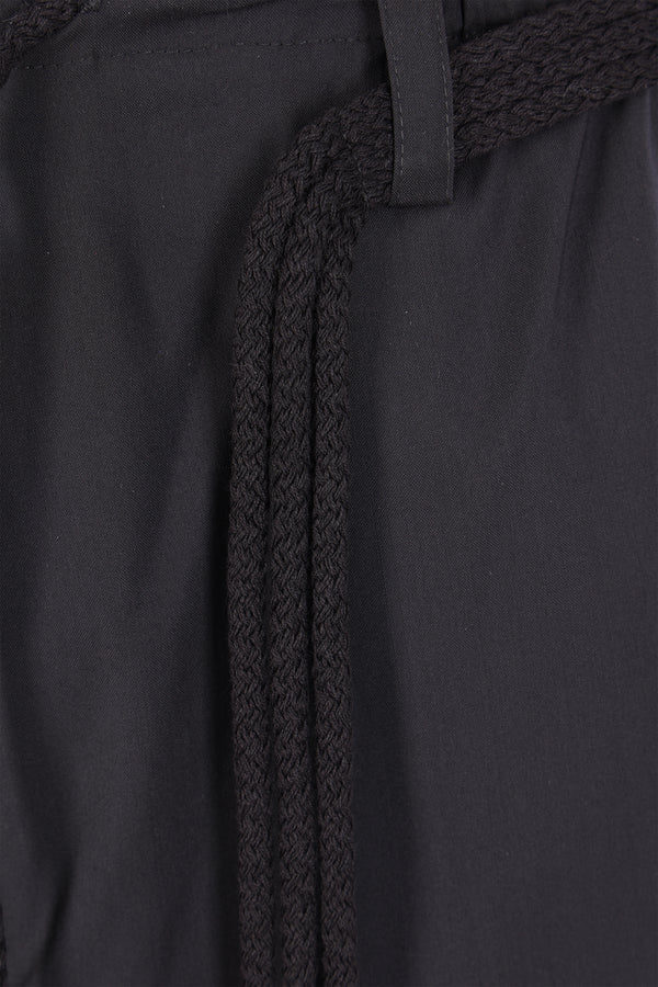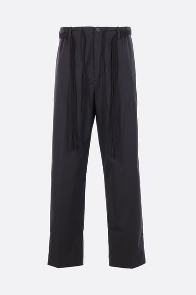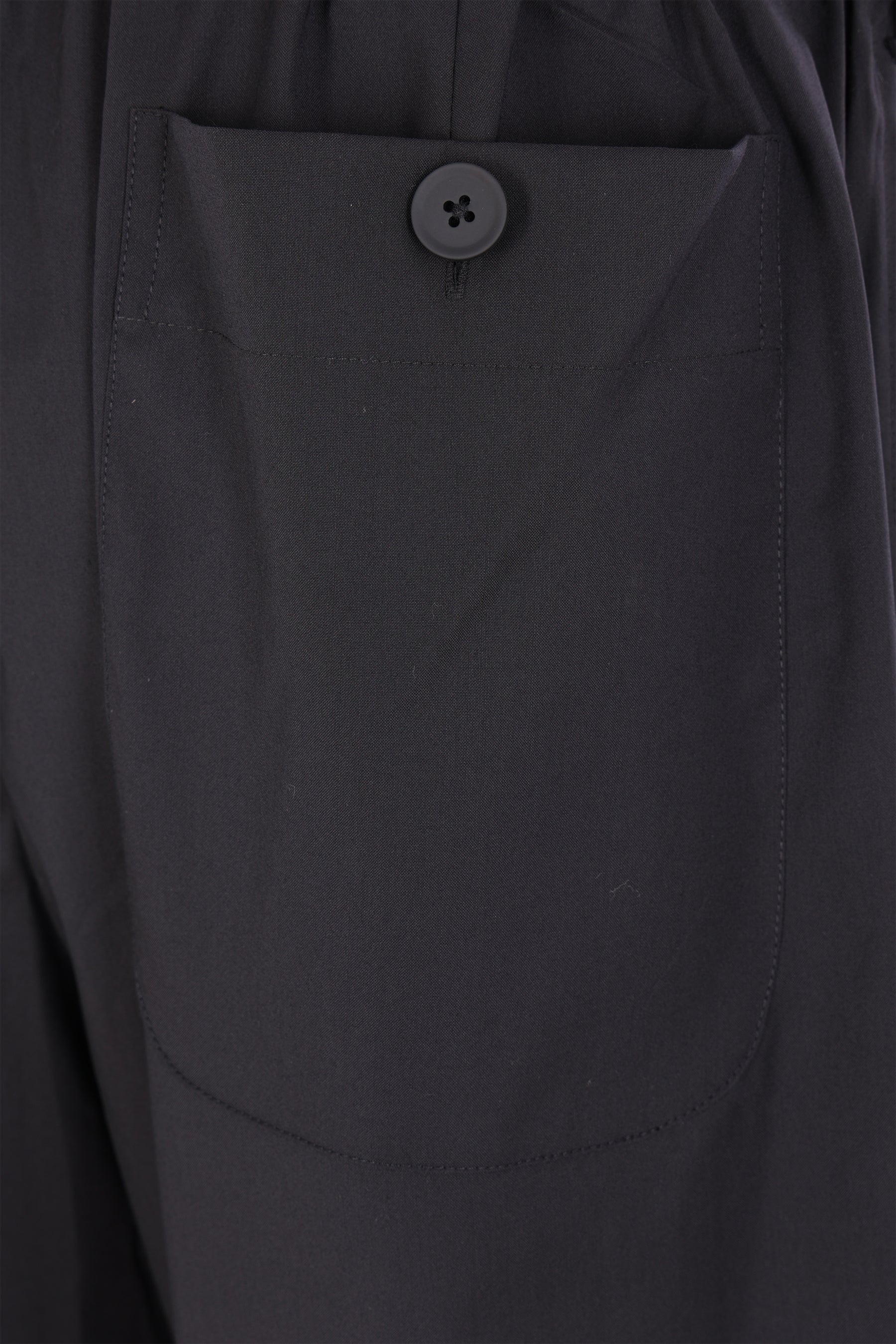 Pantalone worker di Craig Green realizzato in lana tecnica color nero. Caratterizzato da fascia elasticizzata in vita con coulisse, chiusura frontale con bottone / zip, passanti con cintura in corda, tasche multiple e interno sfoderato.