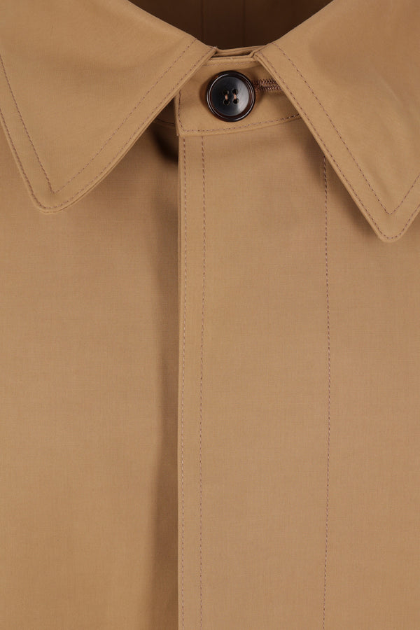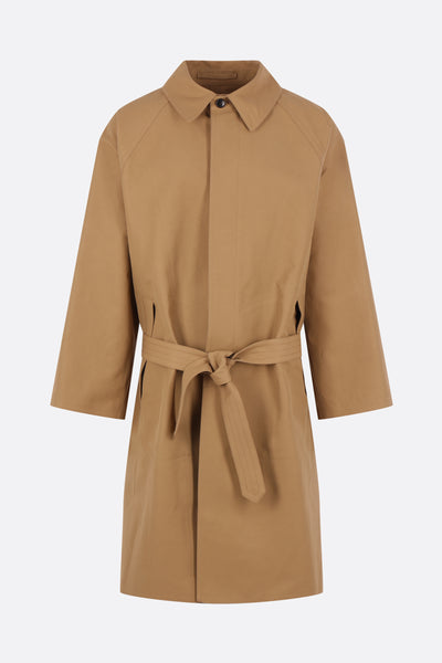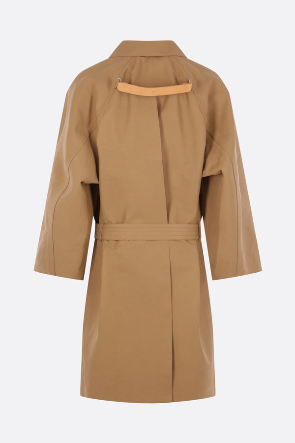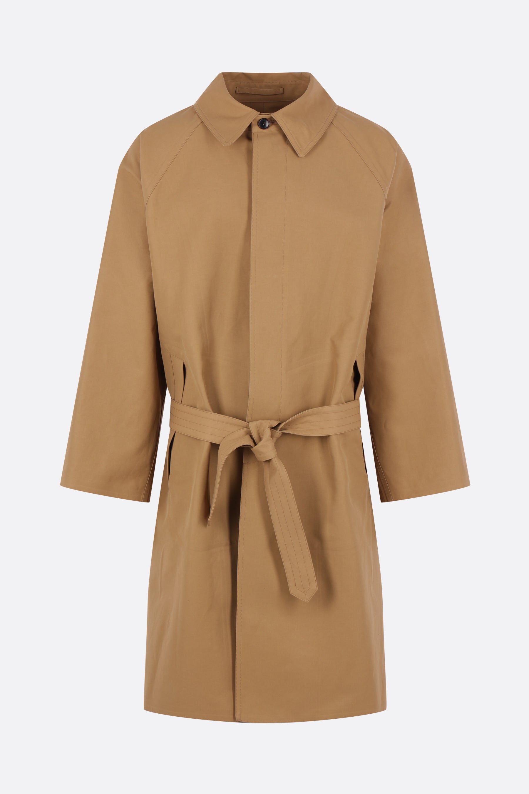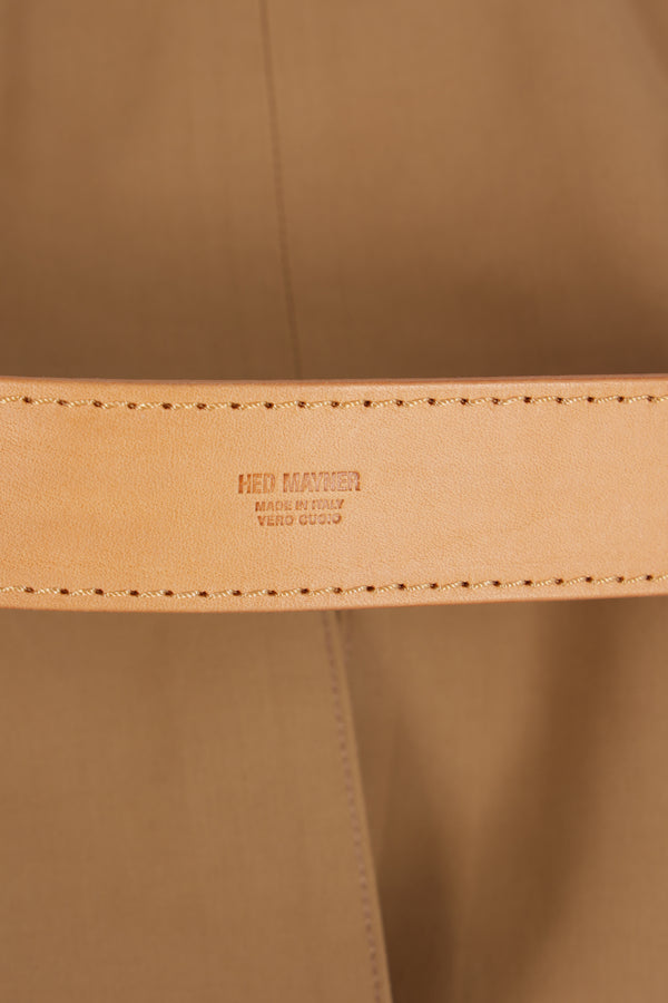 Soprabito destrutturato dalla linea oversize di Hed Mayner realizzato in cotone tecnico color cammello. Caratterizzato da colletto a punta, chiusura frontale nascosta con bottoni, tasche a filetto, cintura coordinata, maniche lunghe con dettagli cut-out sul giromanica, sfondo piega aperto sul retro e interno parzialmente foderato. Completa il design in cinturino in pelle con logo lettering impresso sulla schiena.