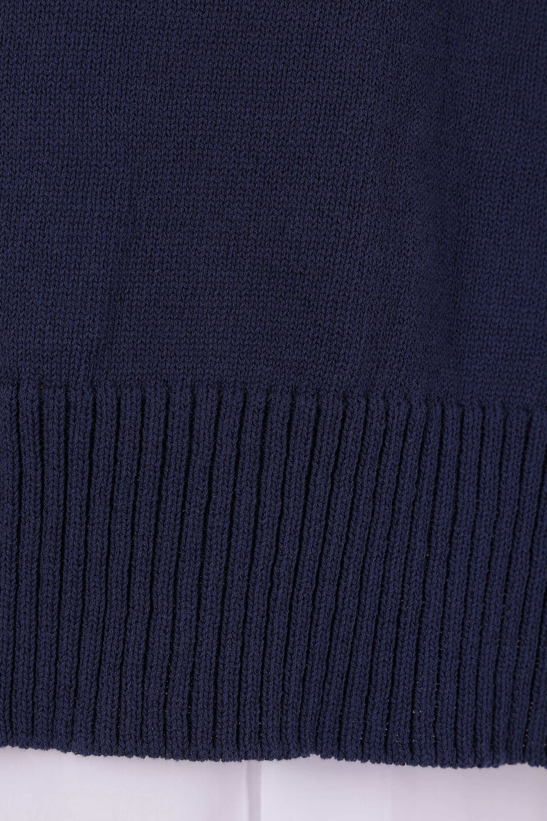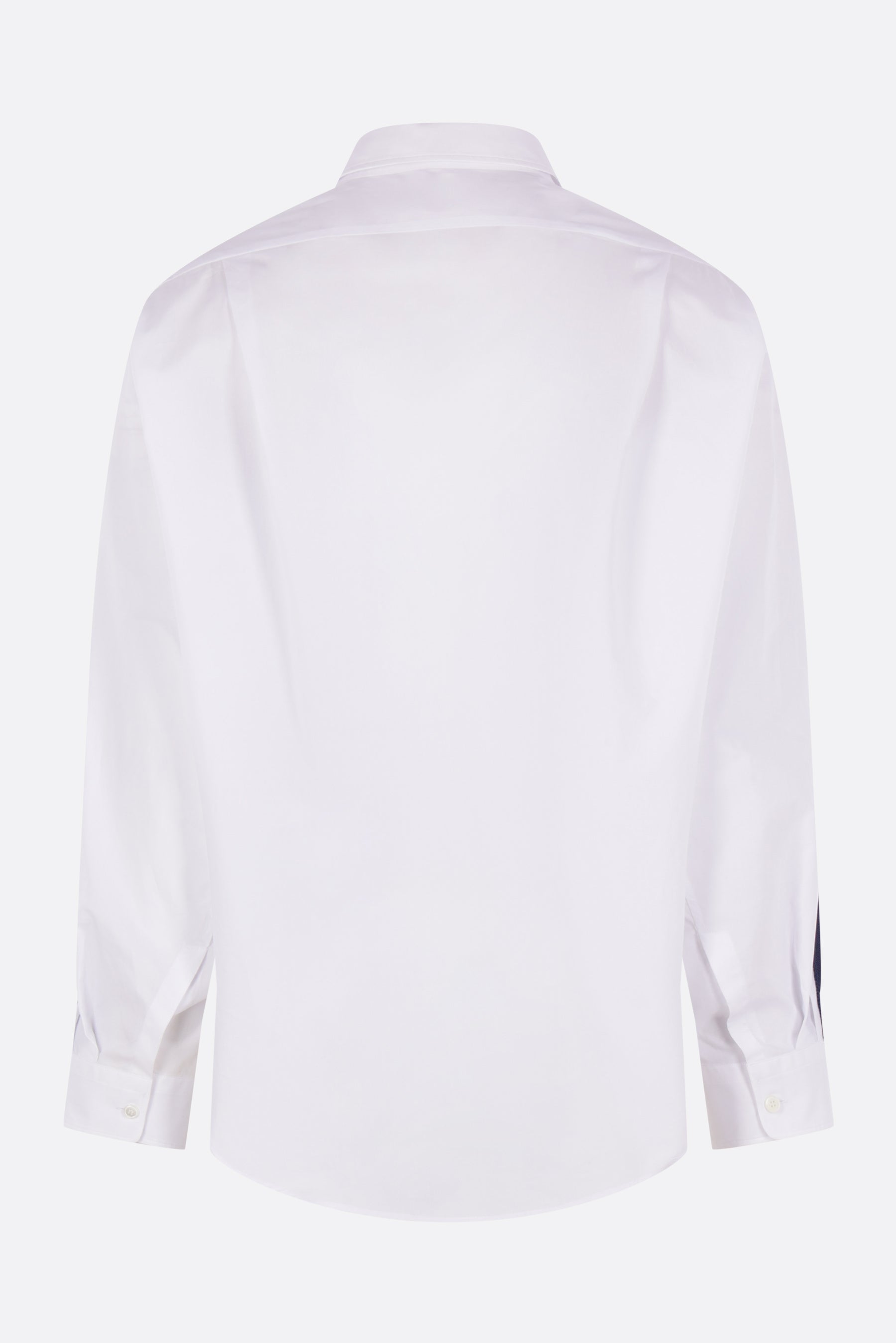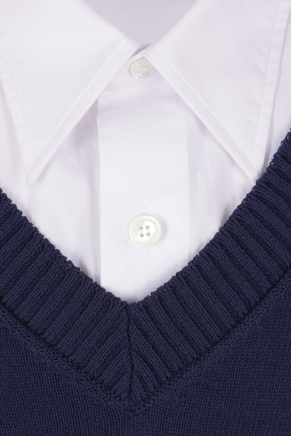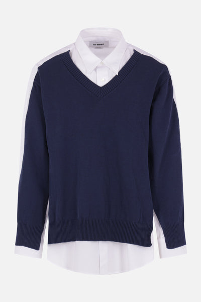 Camicia di Hed Mayner realizzata in popeline di cotone color bianco con finto pullover a V sovrapposto sulla parte frontale in maglia di cotone color blu. Caratterizzato da colletto classico, chiusura frontale con bottoni, maniche lunghe con polsini abbottonati e fondo arrotondato.