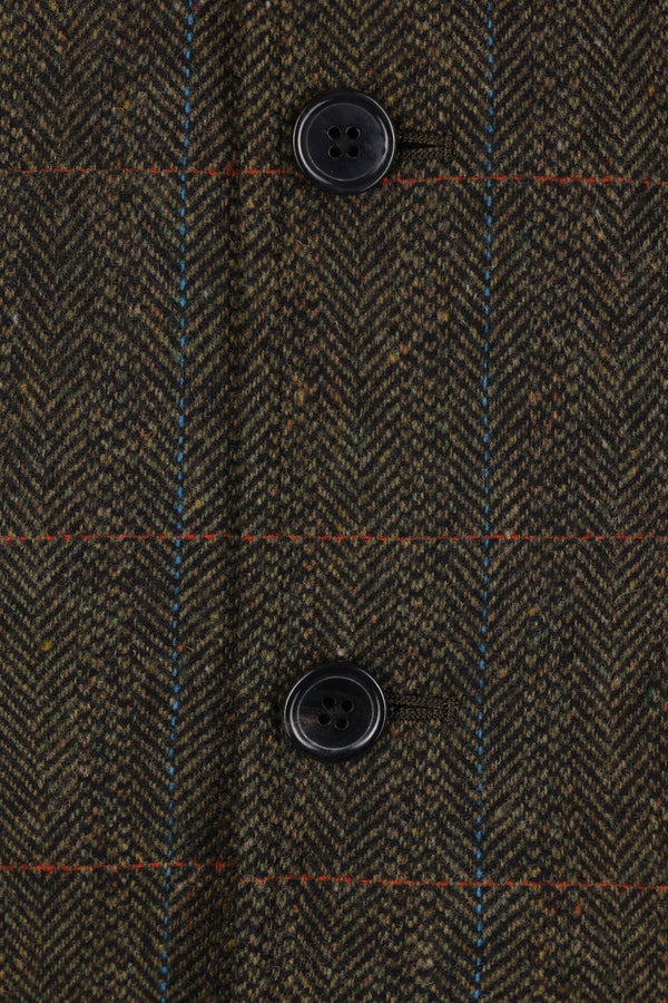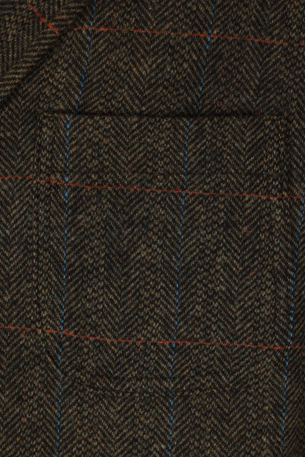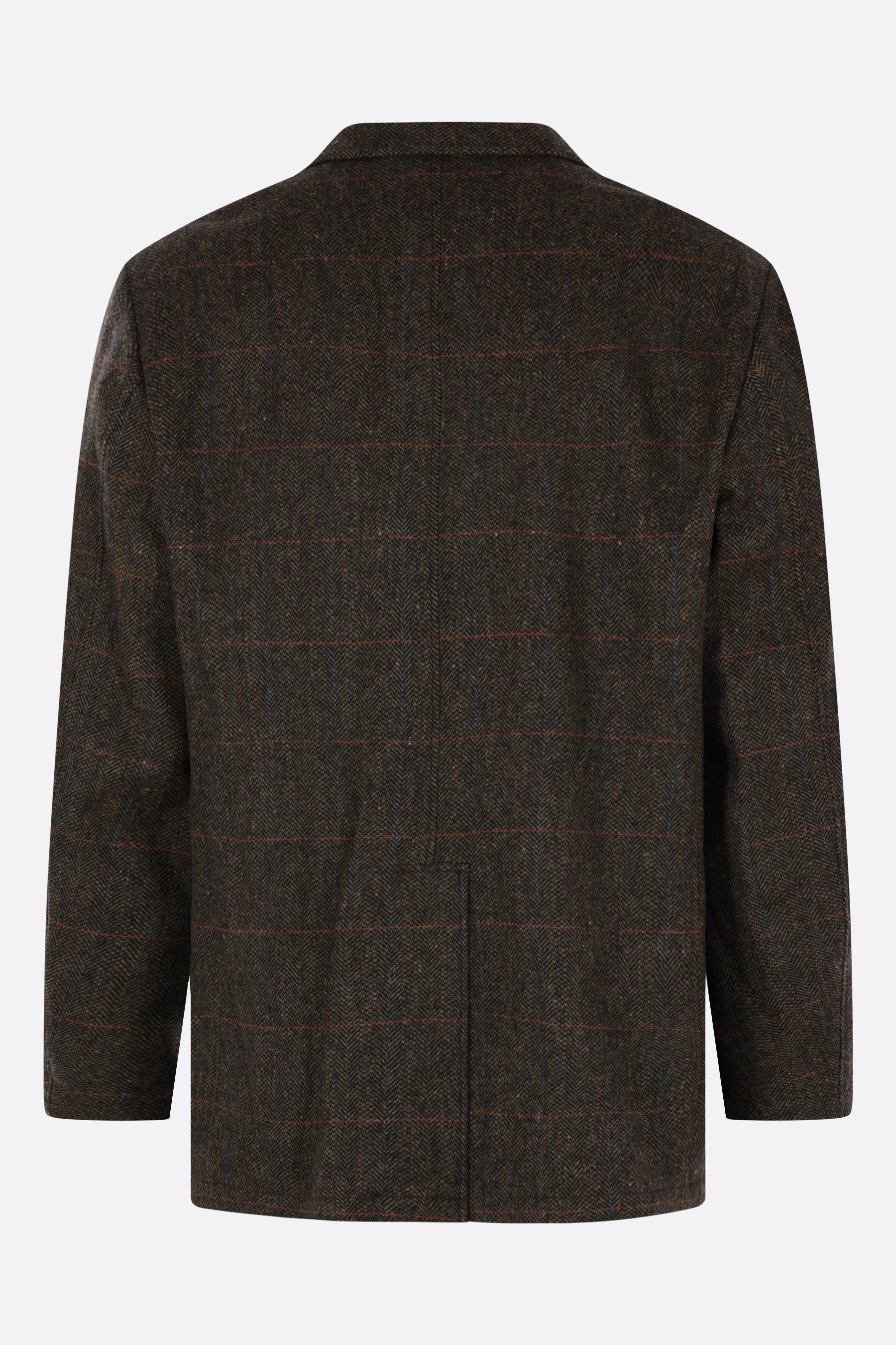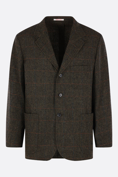 Giacca monopetto di J. Press realizzata in lana color verde oliva a motivo spigato con quadri a contrasto. Caratterizzata da rever classico, chiusura frontale con bottoni, tasche multiple, maniche lunghe e spacco centrale sul retro. Interno sfoderato.