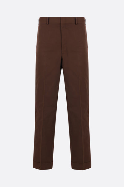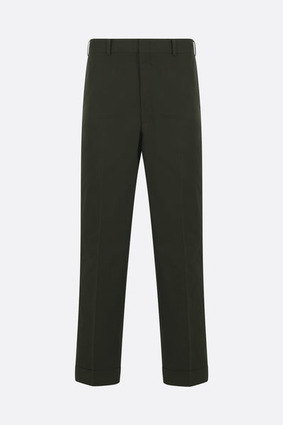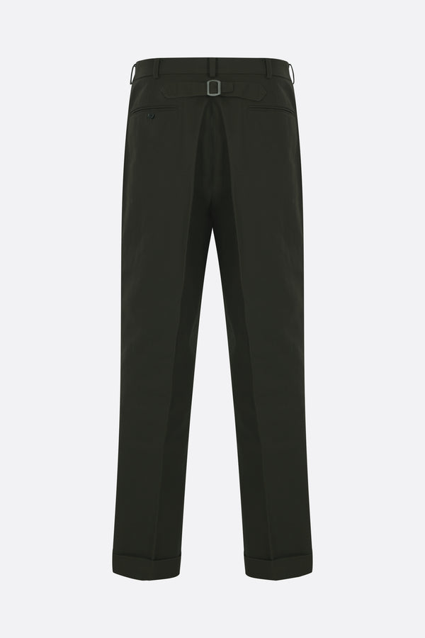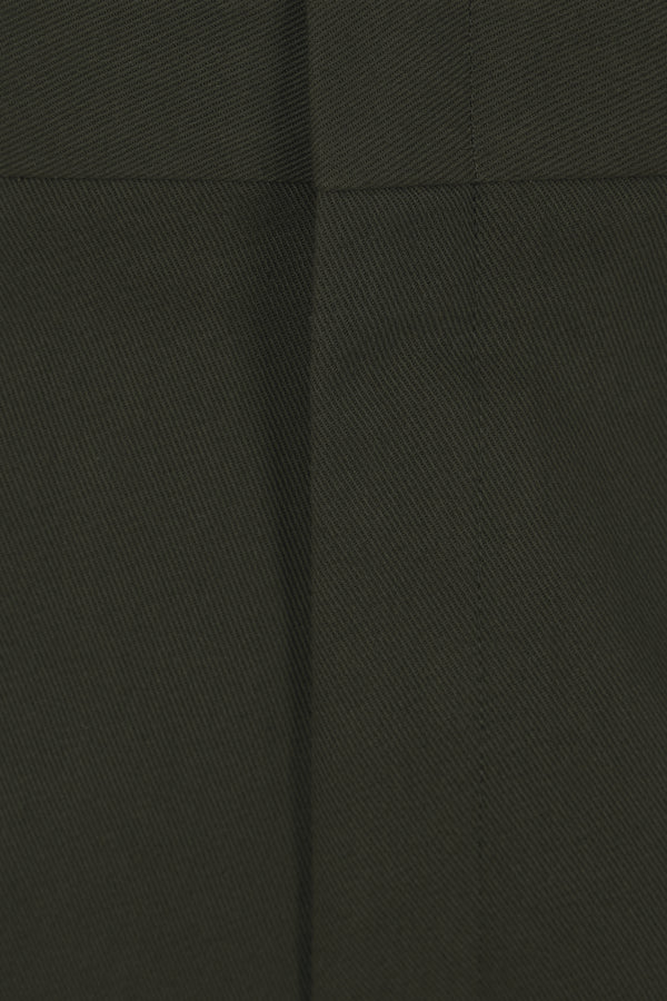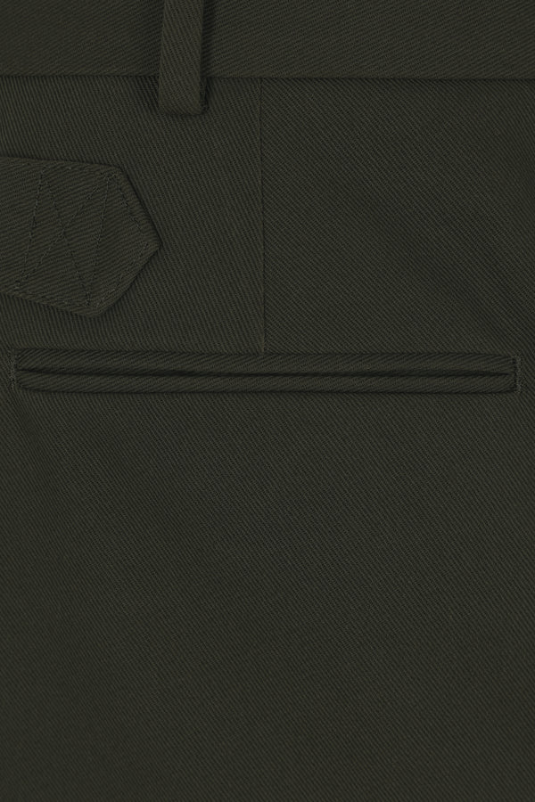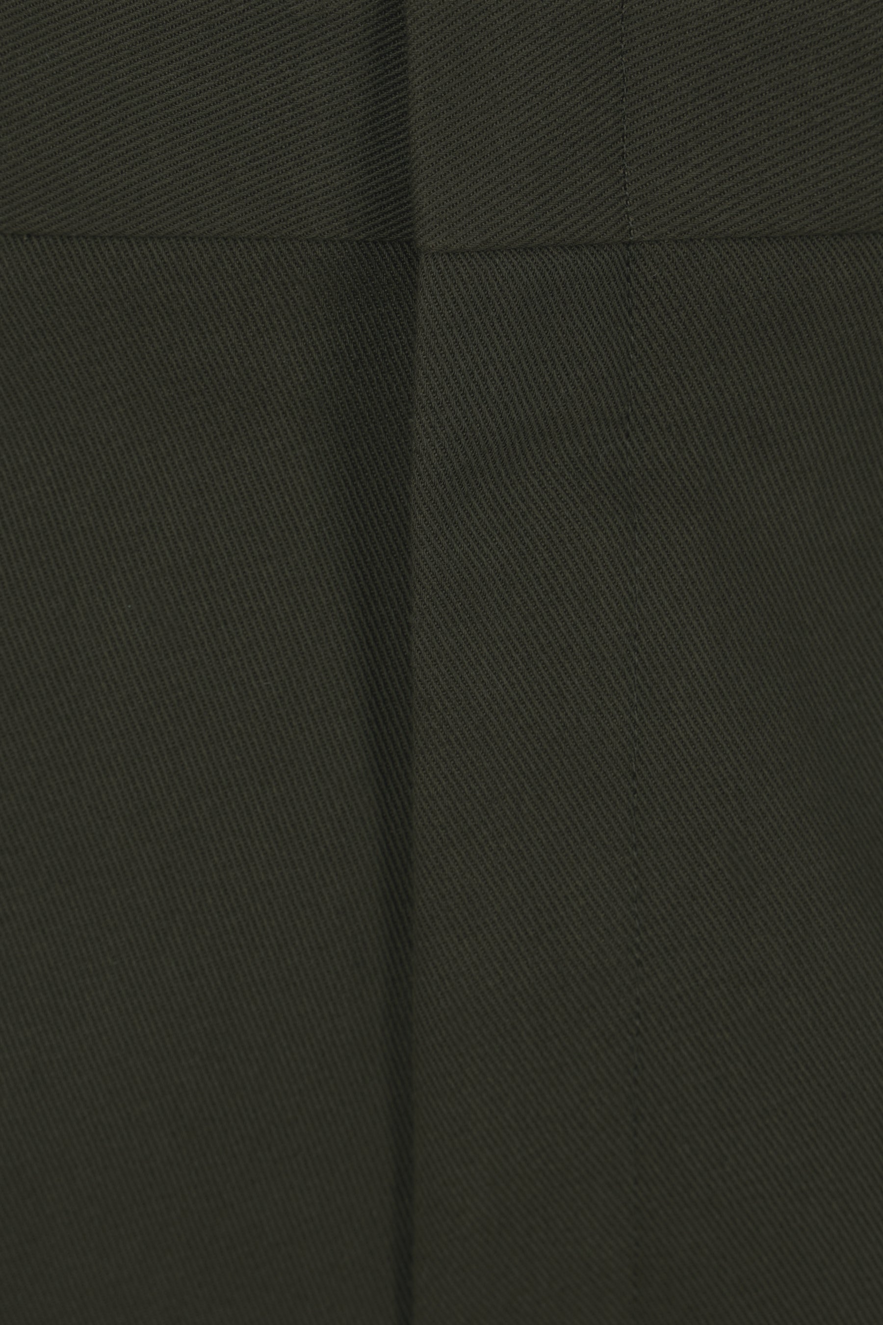 Pantalone di J. Press realizzato in gabardine di misto cotone color verde scuro. Caratterizzato da chiusura frontale con gancio / bottone / zip, passanti per cintura, tasche multiple, piega centrale, martingala sul retro e risvolto sul fondo. Interno sfoderato.
