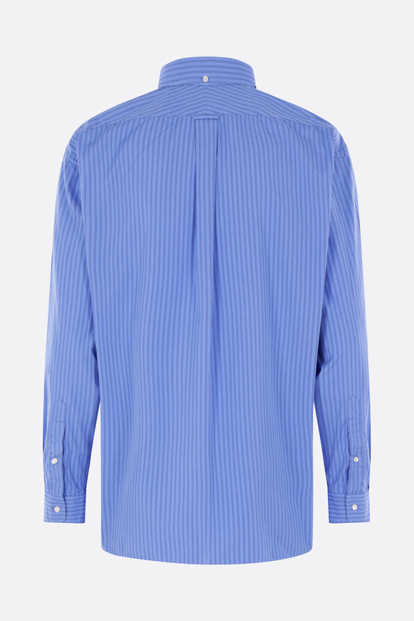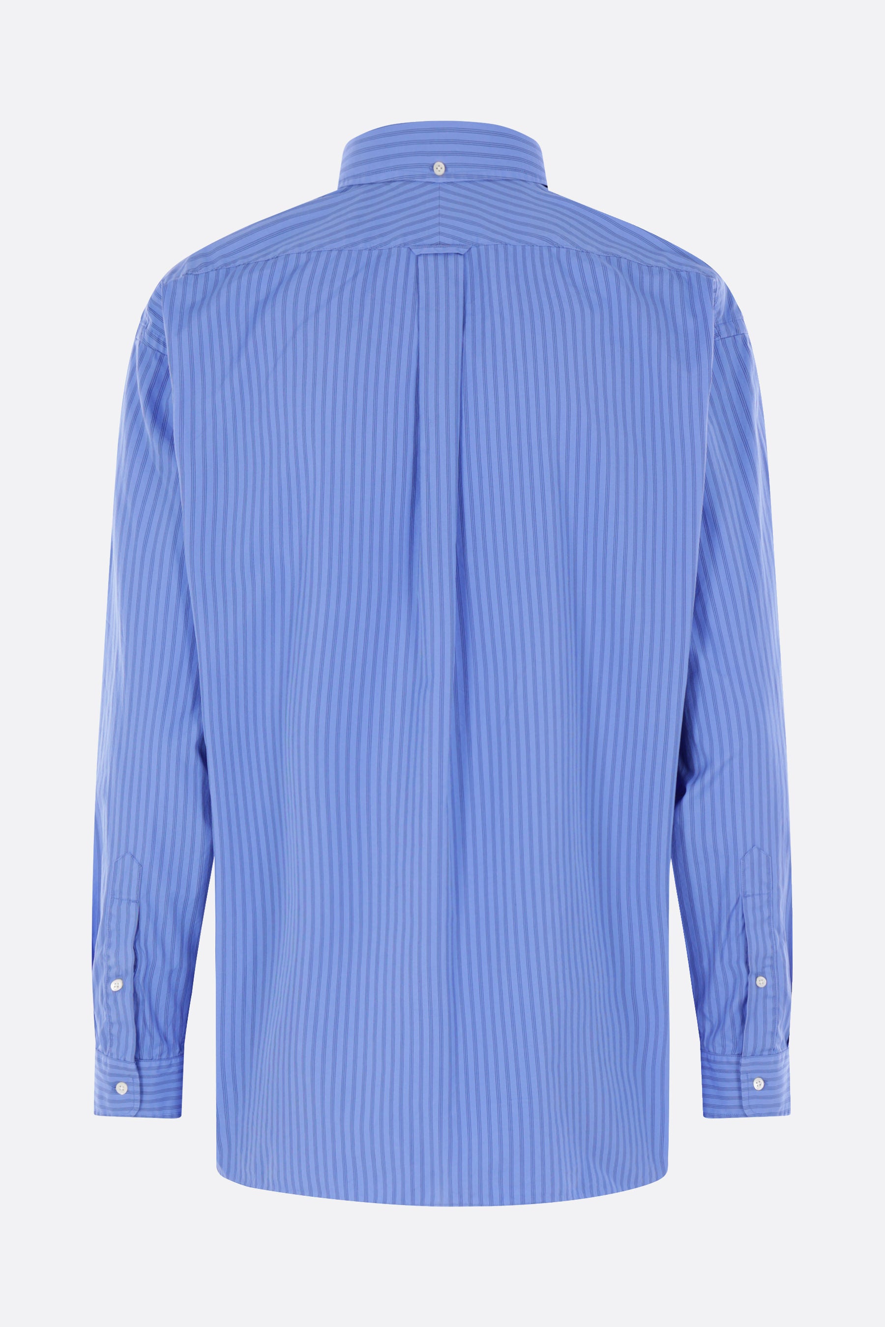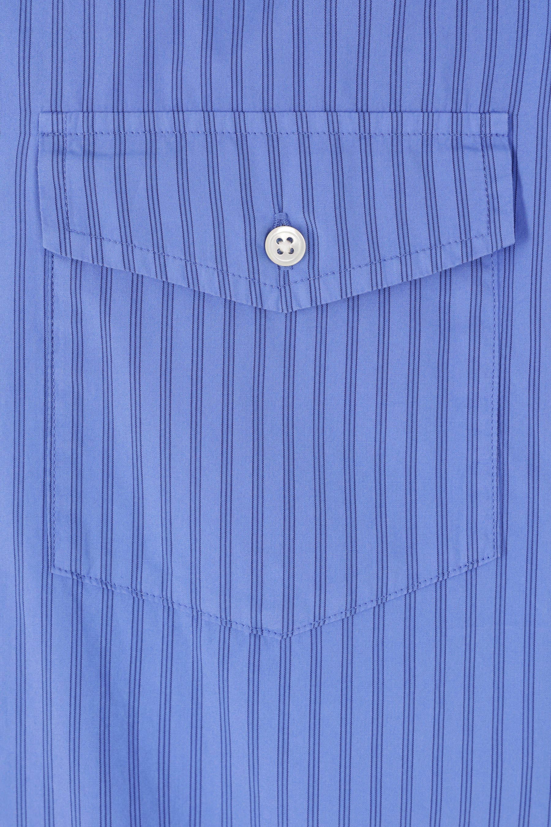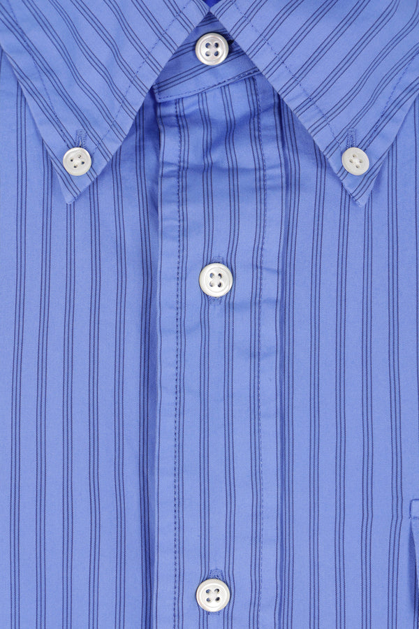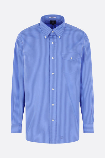 Camicia di J. Press realizzata in popeline di cotone color blu con motivo a righe. Caratterizzata da colletto button-down, chiusura frontale con bottoni, tasca con patta sul petto, maniche lunghe con polsini abbottonati e fondo arrotondato con stampa logo frontale.