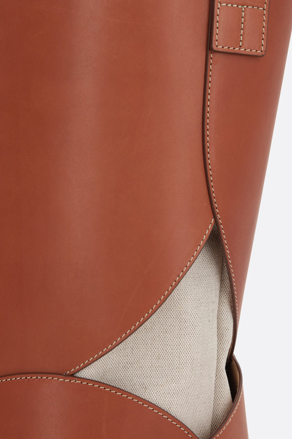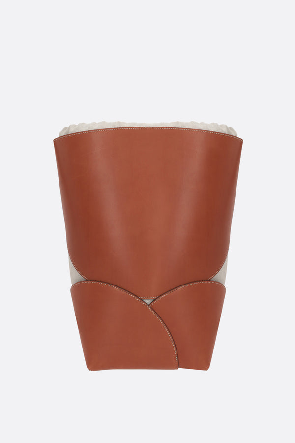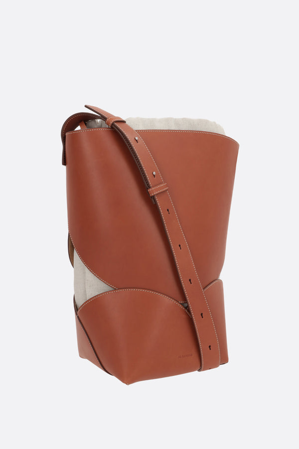 Borsa a secchiello di Jil Sander realizzata in pelle liscia color cuoio con pochette estraibile in canvas color naturale. Caratterizzata da metalleria color oro, chiusura con coulisse e tracolla regolabile. Interno foderato in suede color beige. Completa il design l'inconfondibile logo impresso frontalmente.