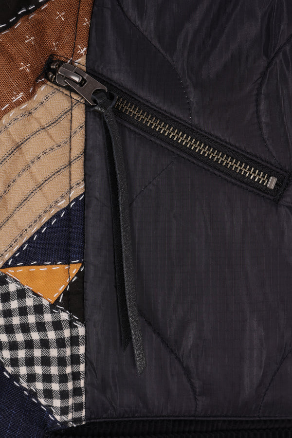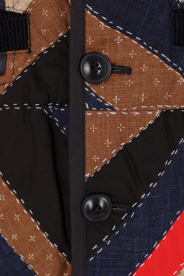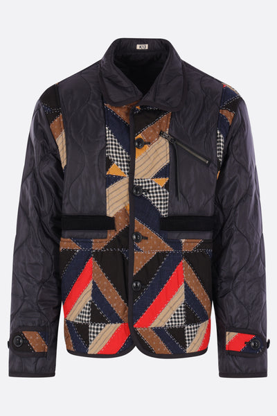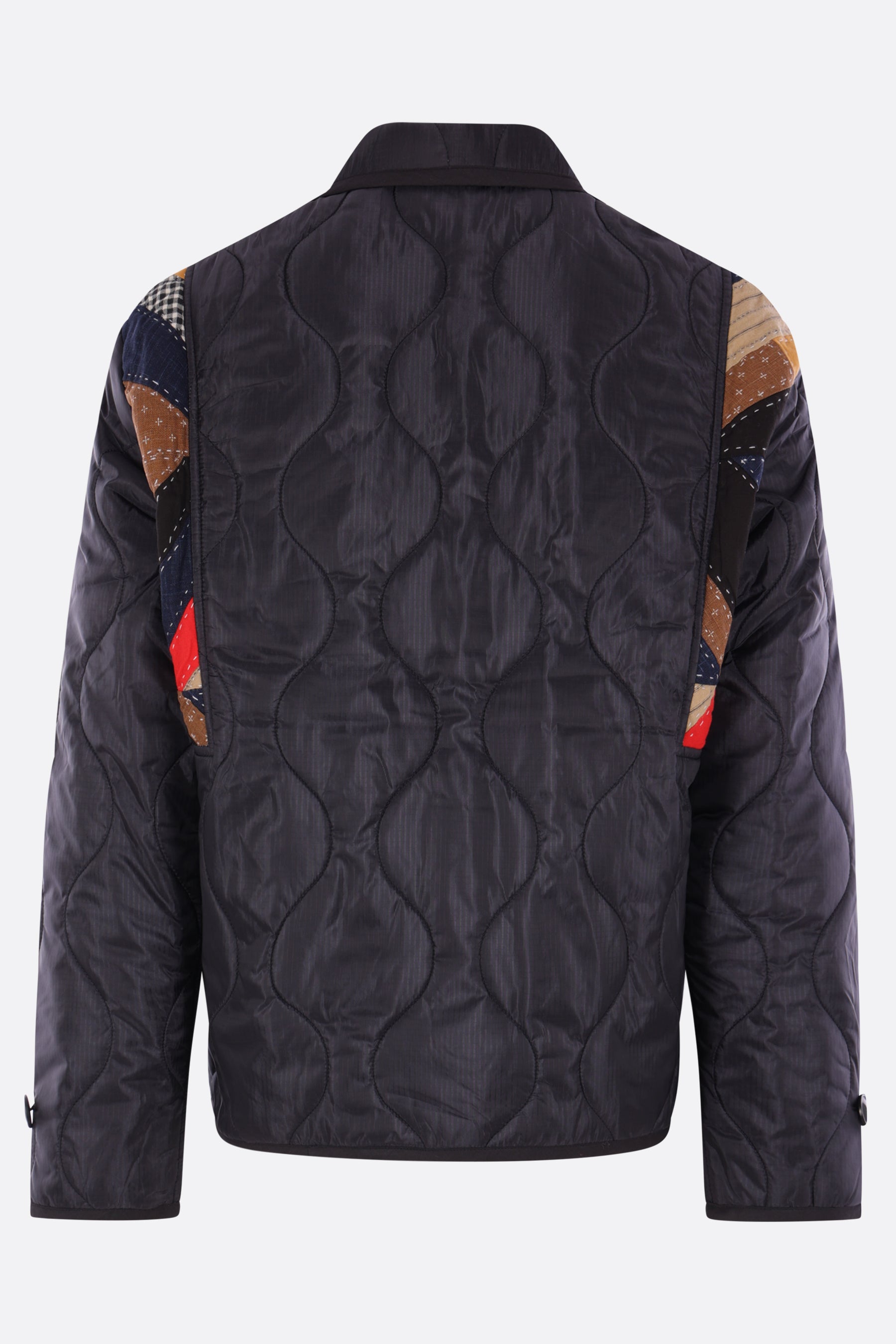 Giacca trapuntata di Khoki realizzata in nylon color blu con inserti patchwork. Caratterizzata da colletto arrotondato, chiusura frontale con bottoni, tasche multiple, maniche lunghe con linguette regolabili sui polsi e fondo dritto. Ogni prodotto è un pezzo unico: eventuali irregolarità o leggere variazioni di stampa sono caratteristiche intrinseche del tessuto.