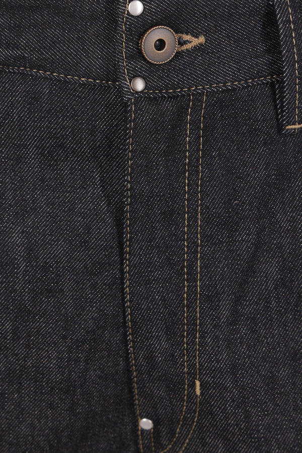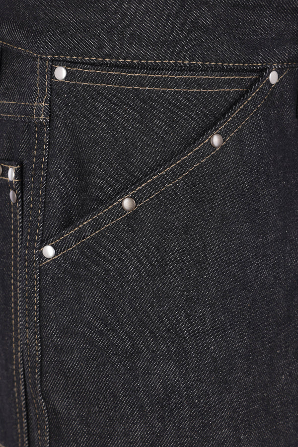 Jeans a gamba ampia di Lemaire realizzato in denim di cotone color grigio scuro con cuciture a contrasto e borchie metalliche. Caratterizzato da chiusura frontale con bottone metallico / zip, passanti per cintura, tasche multiple e patch logo in pelle sul retro.