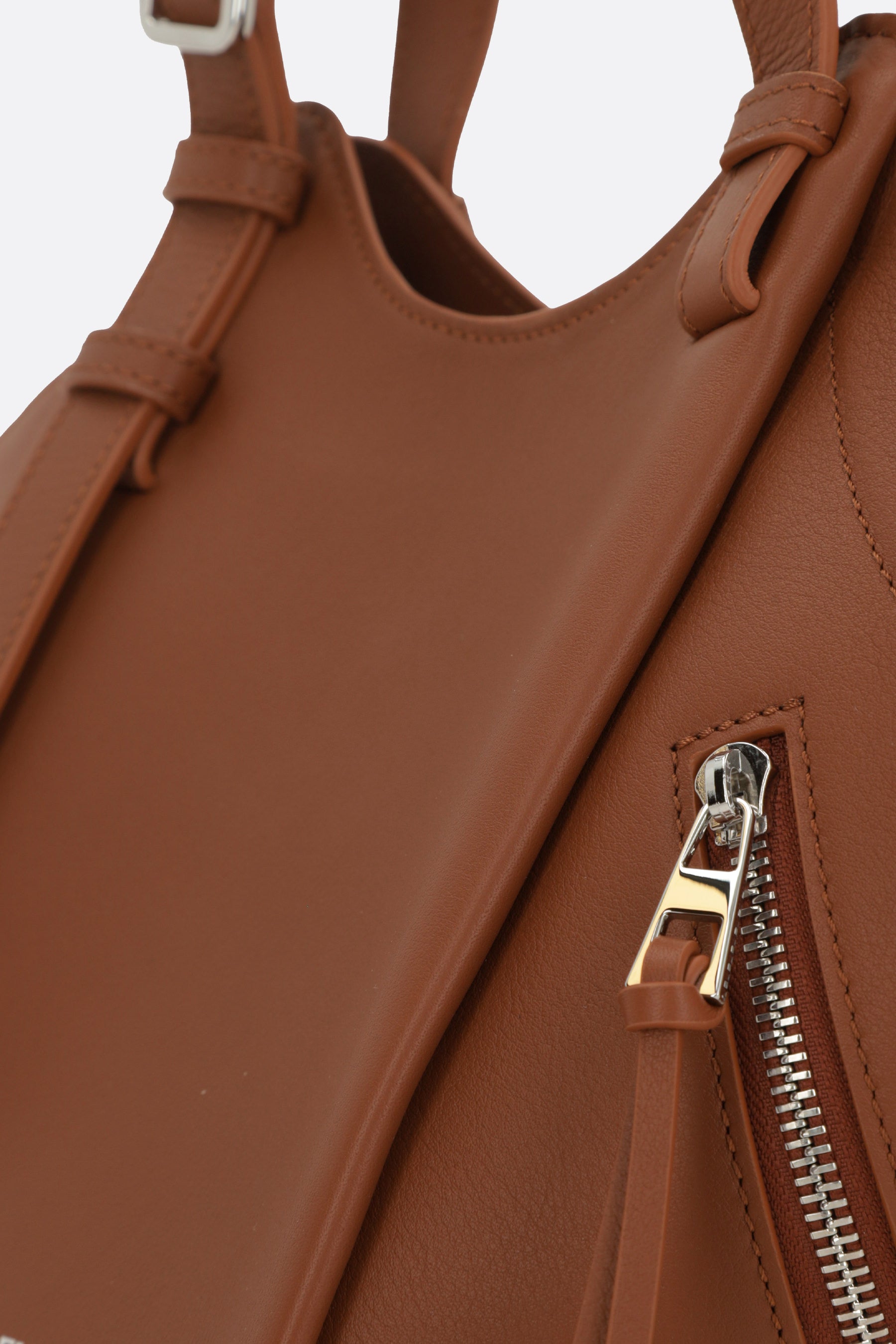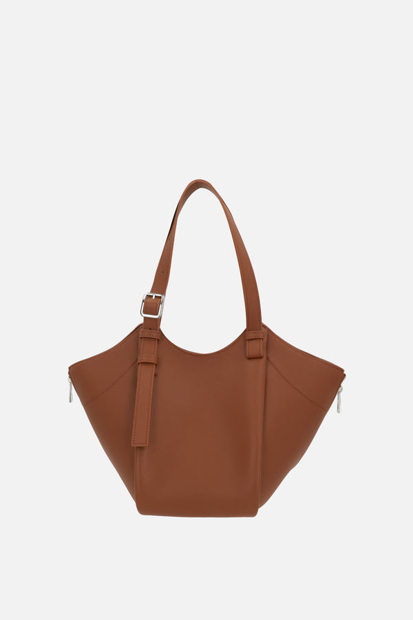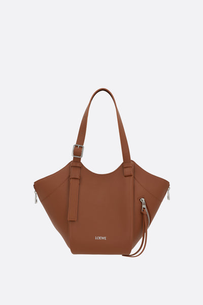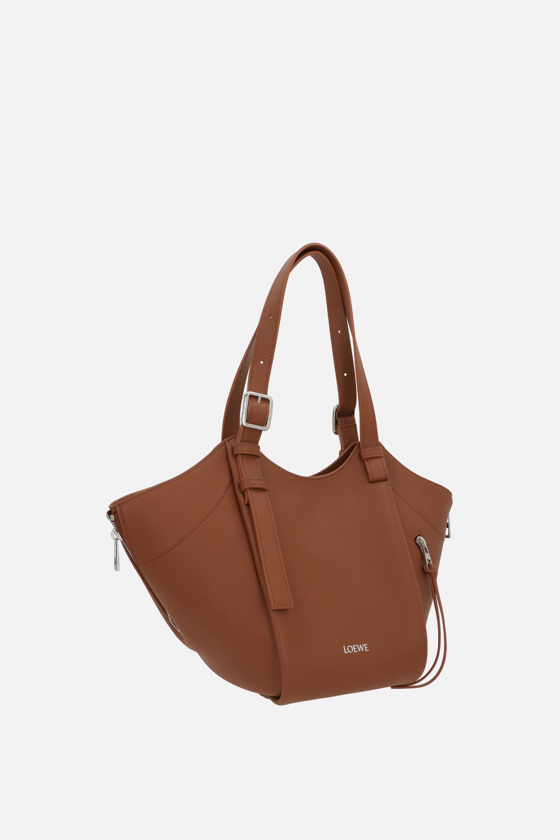 Borsa a mano di Loewe realizzata in pelle liscia color cuoio con logo lettering impresso frontalmente. Caratterizzata da metalleria color argento, chiusura interna con bottone magnetico, manici regolabili e spallaccio regolabile / removibile. L'interno foderato in tela tono su tono a motivo spigato è dotato di due tasche piatte. Completano il design le due zip laterali e la tasca con zip.