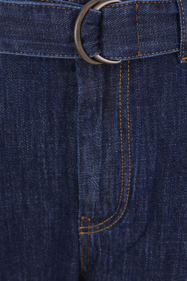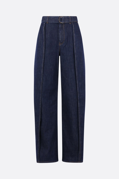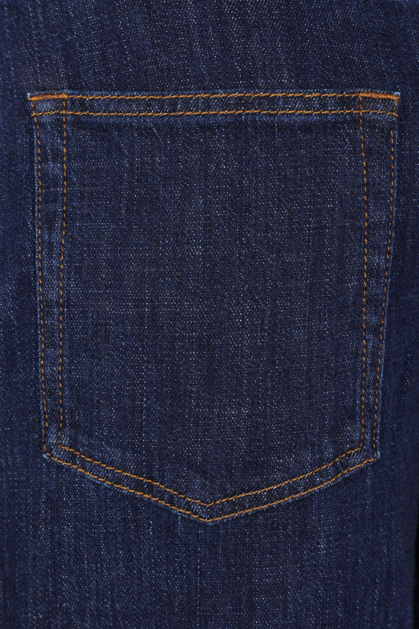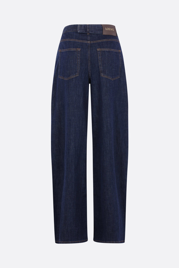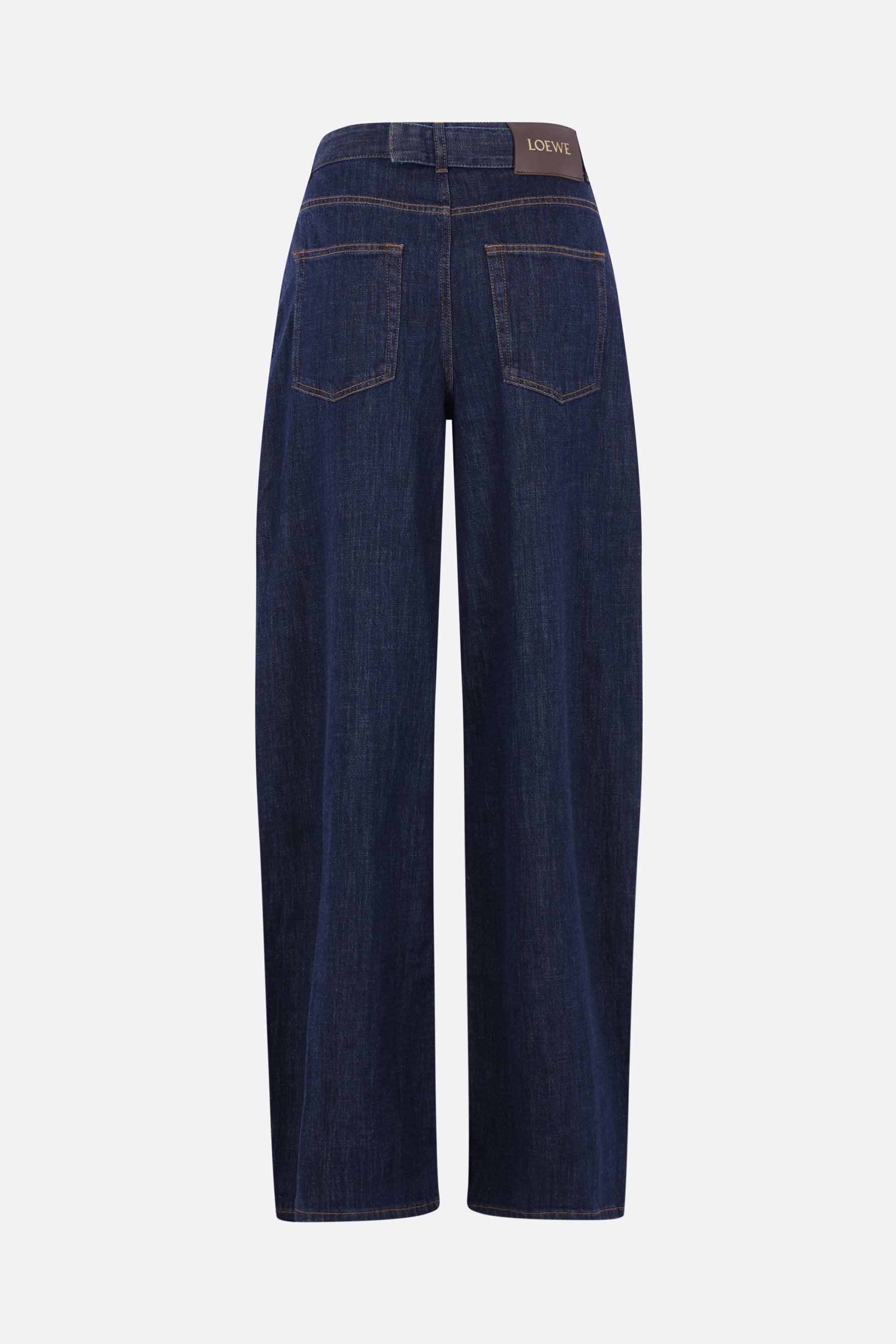 Jeans di Loewe realizzato in denim di cotone color blu indaco con cuciture a contrasto. Caratterizzato da chiusura frontale con ganci / bottone / zip, passanti con cintura integrata, pieghe frontali e tasche multiple. Completa il design la patch logo in pelle sul retro.