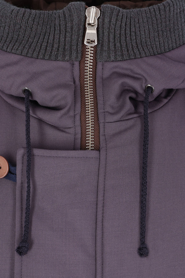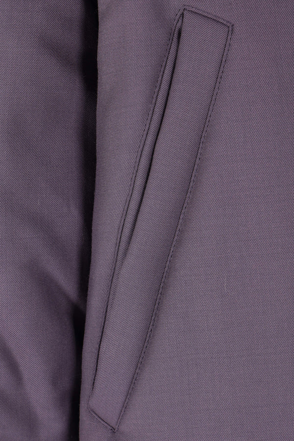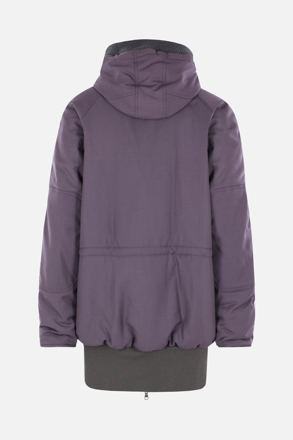 Parka imbottito dalla linea oversize di Magliano realizzato in lana color melanzana. Caratterizzato da collo alto, cappuccio con coulisse, chiusura con zip a doppio cursore / bottoni, tasche multiple, maniche lunghe, coulisse in vita e sul fondo e bordi in maglia a costine.