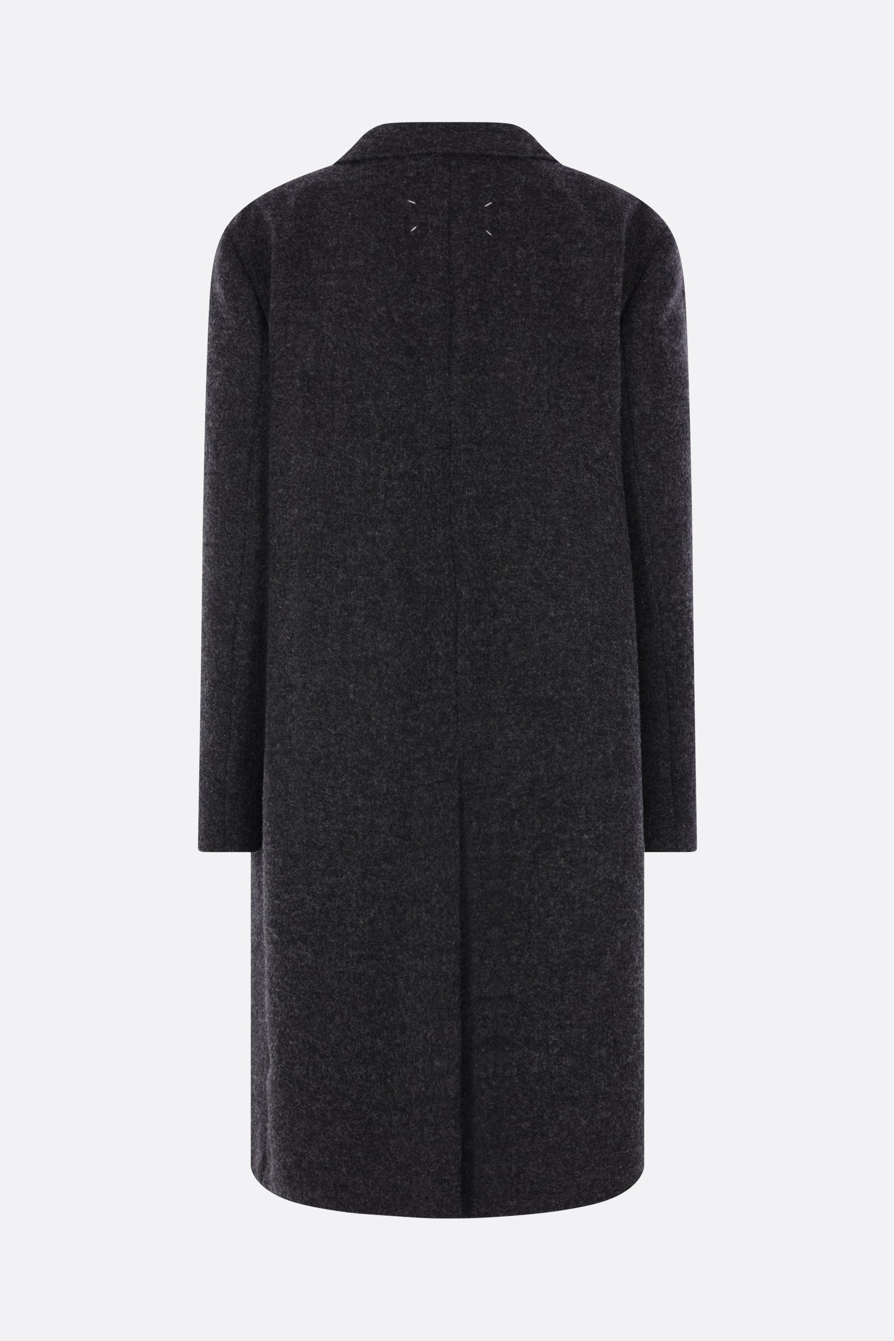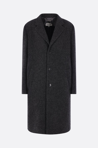 Cappotto oversize di Maison Margiela realizzato in misto lana color grigio scuro. Caratterizzato da rever classico, chiusura monopetto con bottoni, tasche a filetto, maniche lunghe, spacco centrale sul retro e interno semifoderato. Completano il design le quattro cuciture tipiche della Maison sul retro.