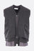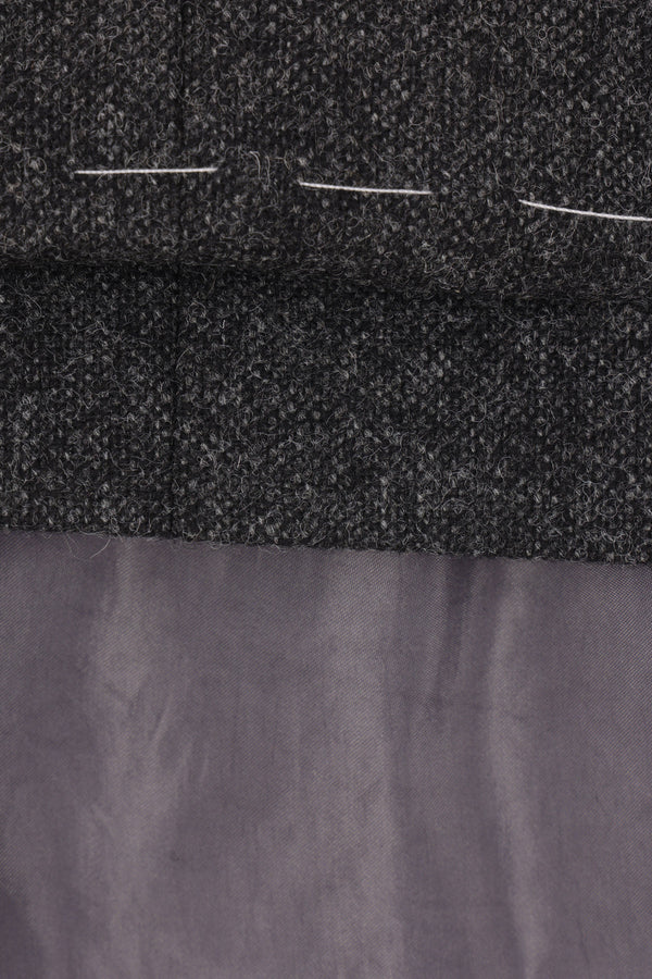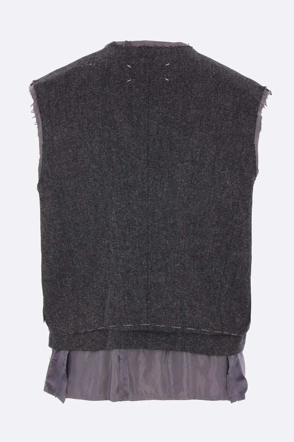 Gilet destrutturato di Maison Margiela realizzato in puntinato di lana color grigio scuro. Caratterizzato da scollatura a V, chiusura frontale con zip, tasche con patta, bordi tagliati a vivo e fodera a vista. Completano il design le quattro cuciture tipiche della Maison sul retro.
