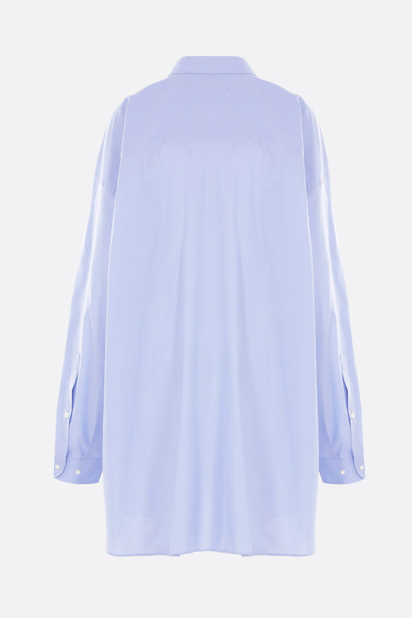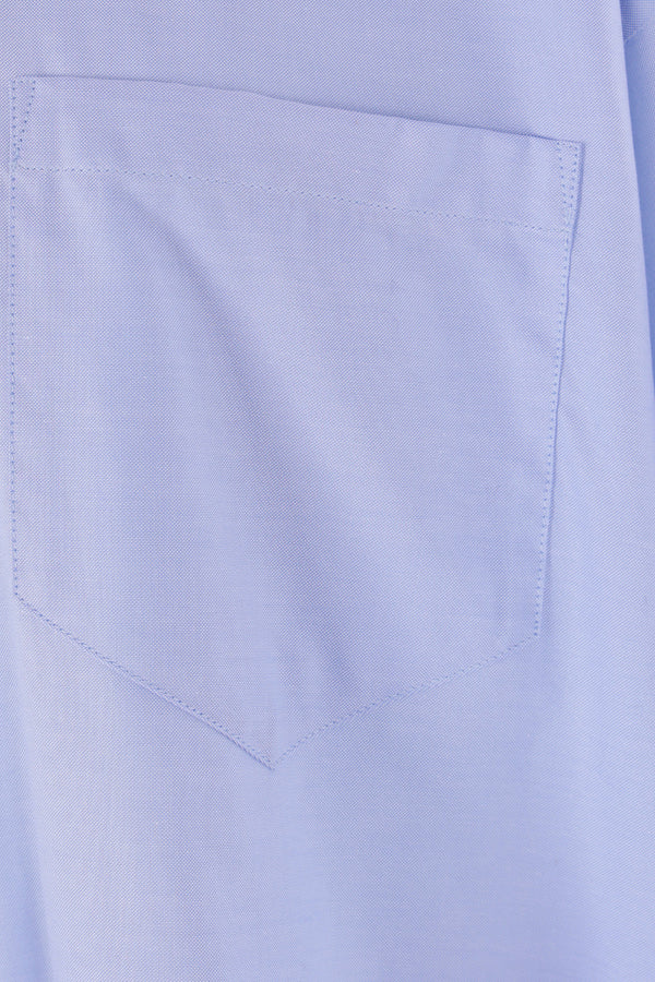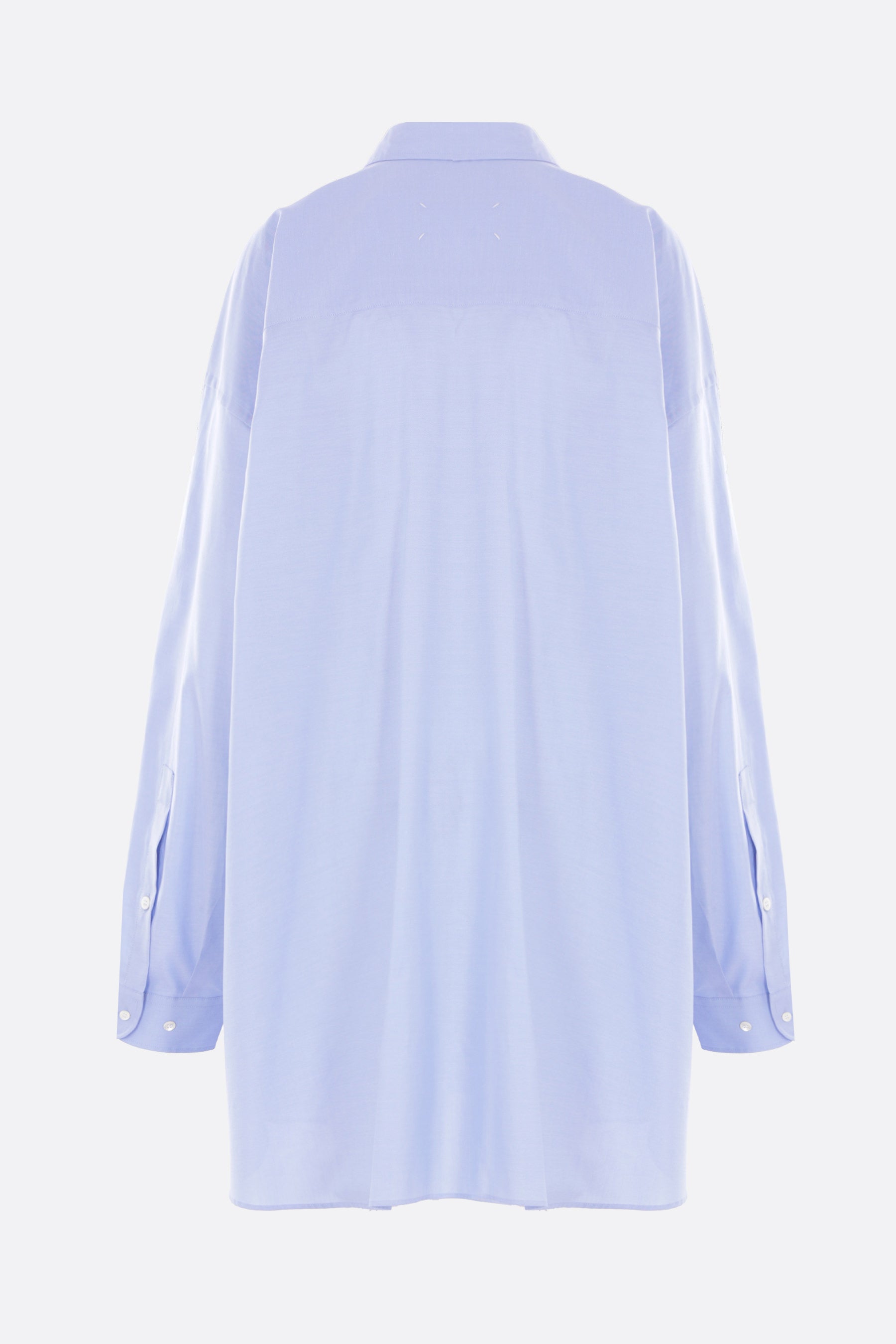 Camicia oversize di Maison Margiela realizzata in cotone Oxford color azzurro. Caratterizzata da colletto classico, chiusura frontale con bottoni, tasca applicata sul petto, maniche lunghe con polsini abbottonati e fondo arrotondato. Completano il design le quattro cuciture tipiche della Maison sul retro.