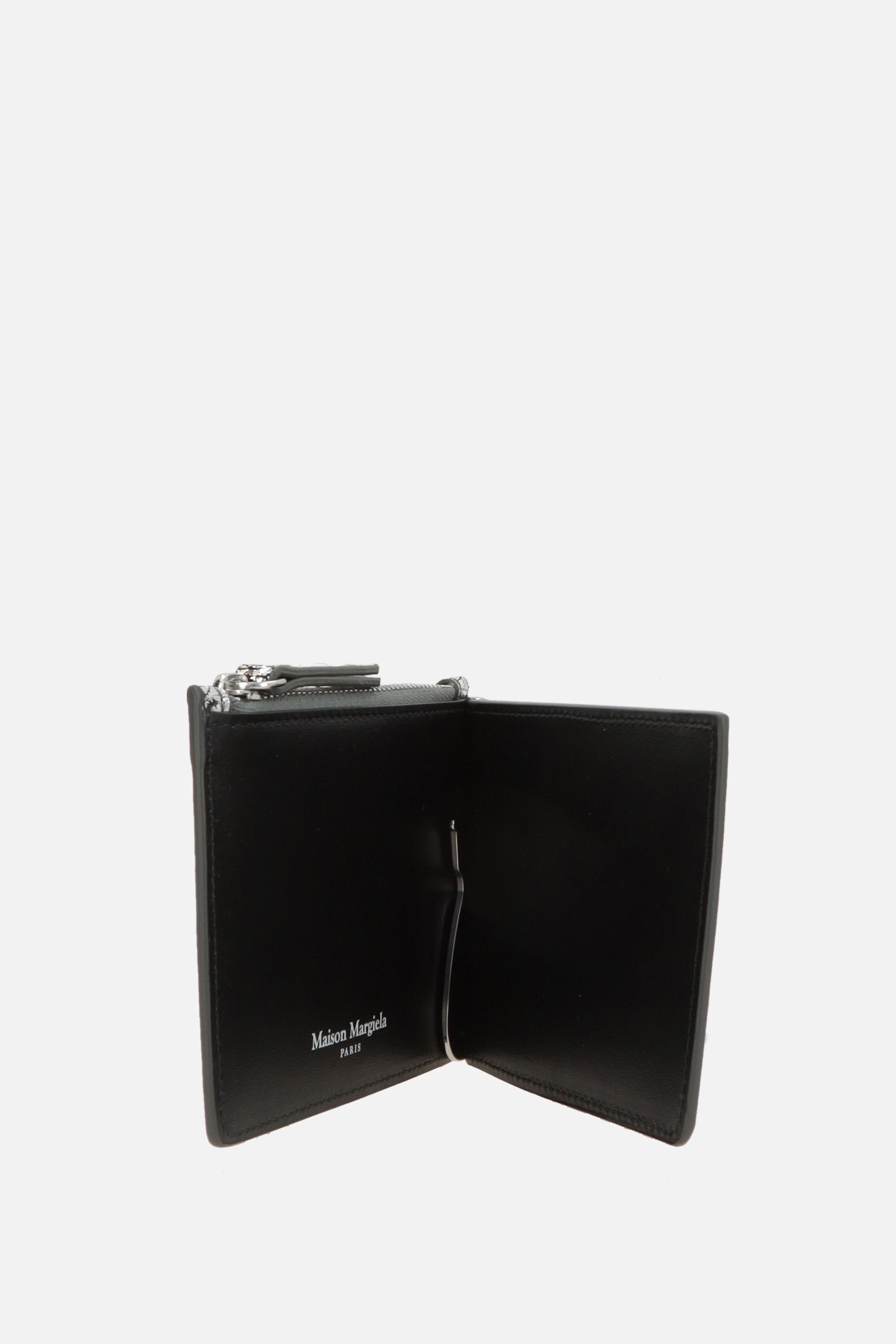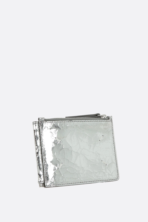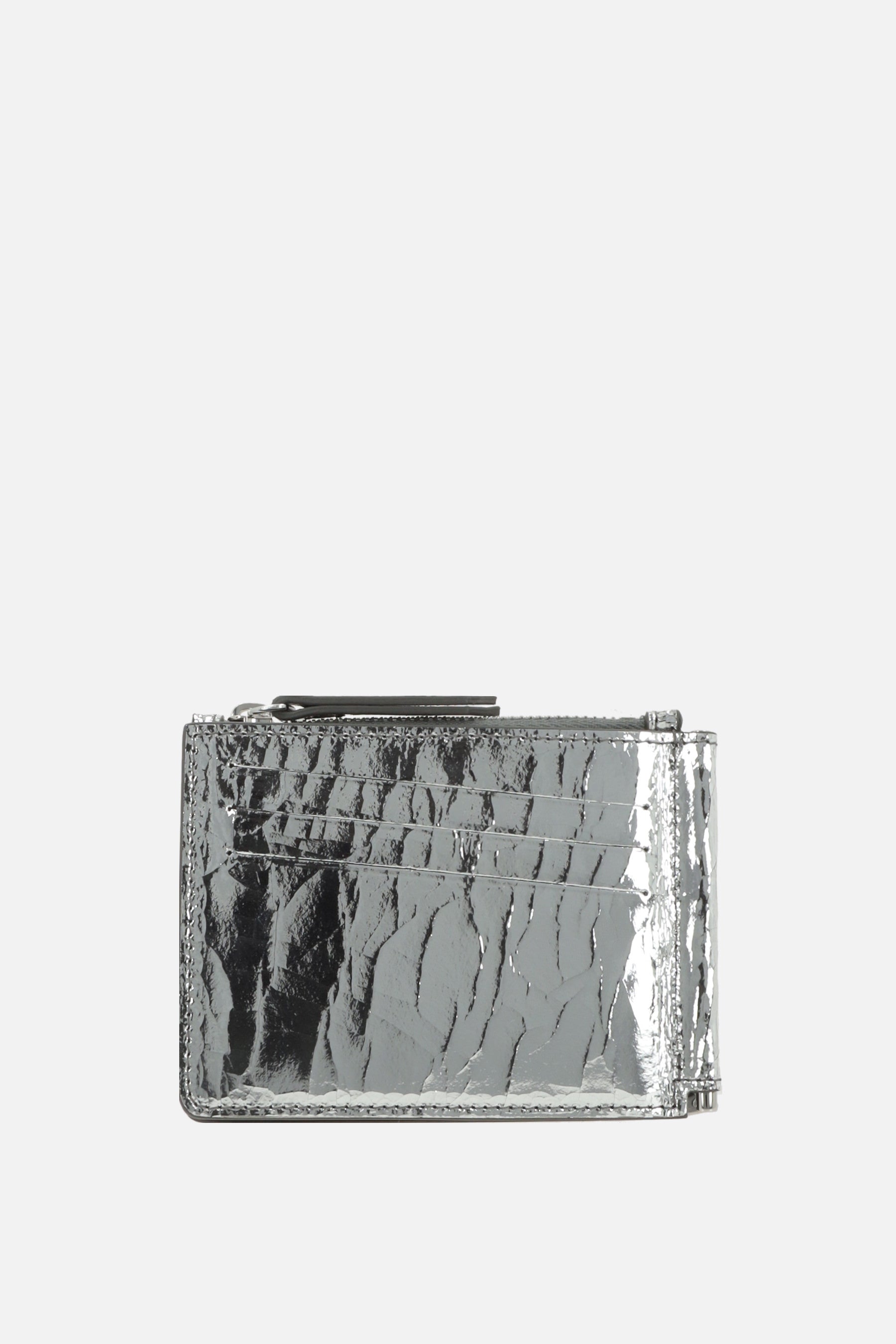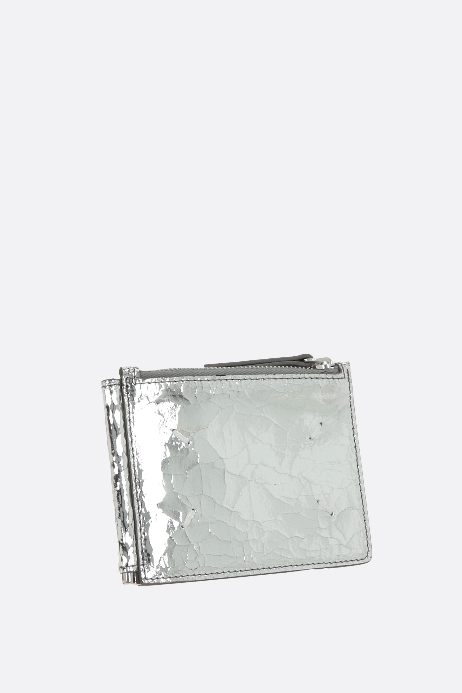 Portafogli di Maison Margiela realizzato in pelle Broken Mirror e caratterizzato da gancio fermasoldi, tasca portamonete con zip e tre fessure per carte. Completano il design le inconfondibile quattro cuciture simbolo del brand.