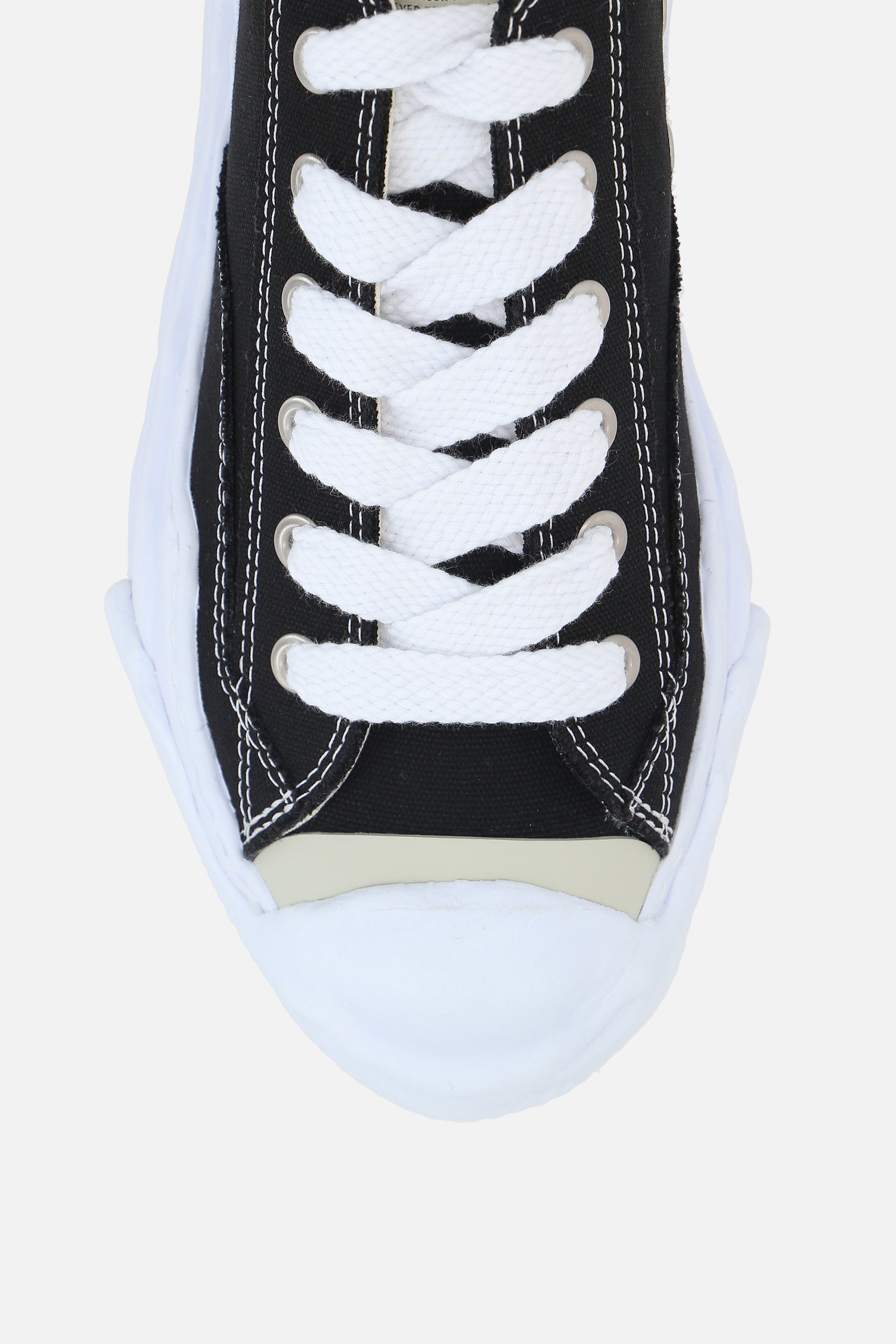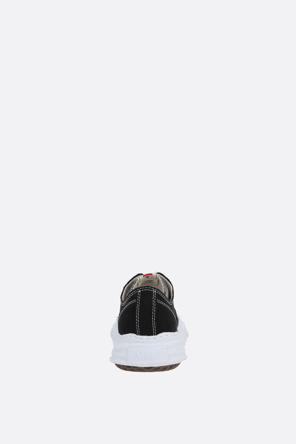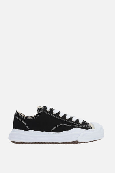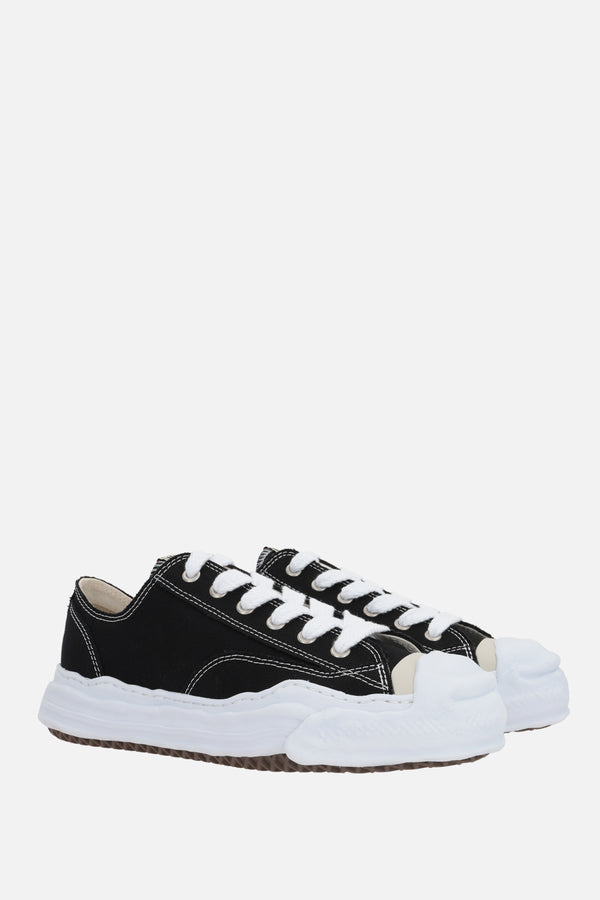 Sneaker low-top di Maison Mihara Yasuhiro realizzata in canvas color nero con puntale in gomma a contrasto. Caratterizzata da chiusura con lacci, punta tonda, fodere in tessuto e suola irregolare in gomma. Completa il design l'etichetta MMY sulla linguetta.