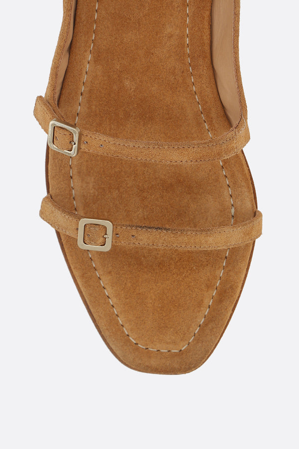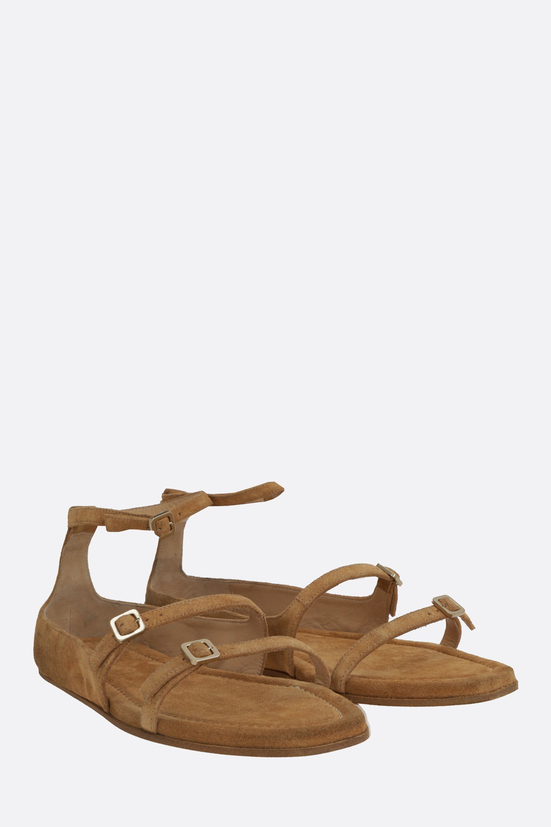 Sandalo flat di Marsèll realizzato in suede color marrone chiaro. Caratterizzato da punta leggermente squadrata, cinturino alla caviglia regolabile con fibbia metallica, fodere in pelle e suola in cuoio / gomma.