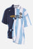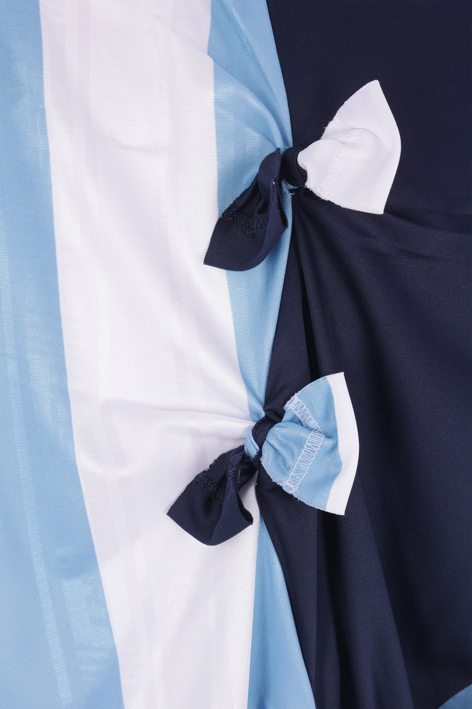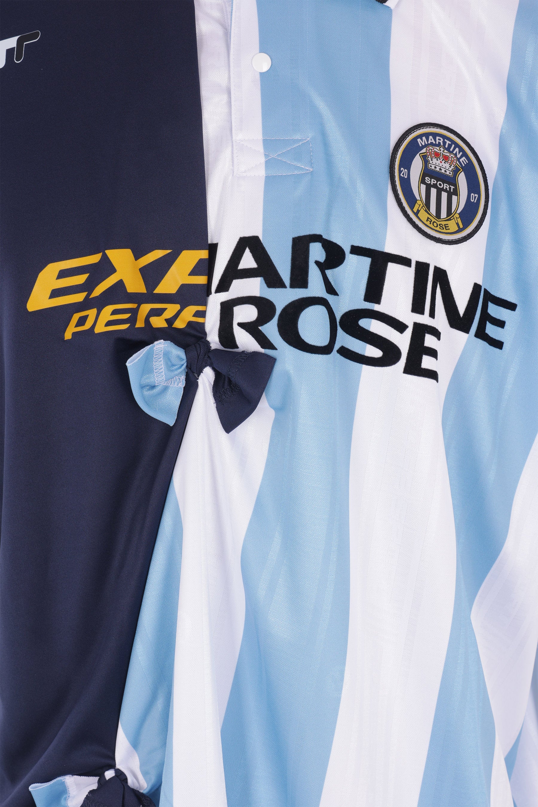 T-shirt oversize di Martine Rose realizzata in jersey tecnico a righe nei toni del blu, azzurro e bianco con stampe e patch a motivo Collage Football. Caratterizzata da scollatura destrutturata con colletto a polo da un lato, maniche corte, fiocchi su entrambi i lati che creano un drappeggio e fondo asimmetrico.