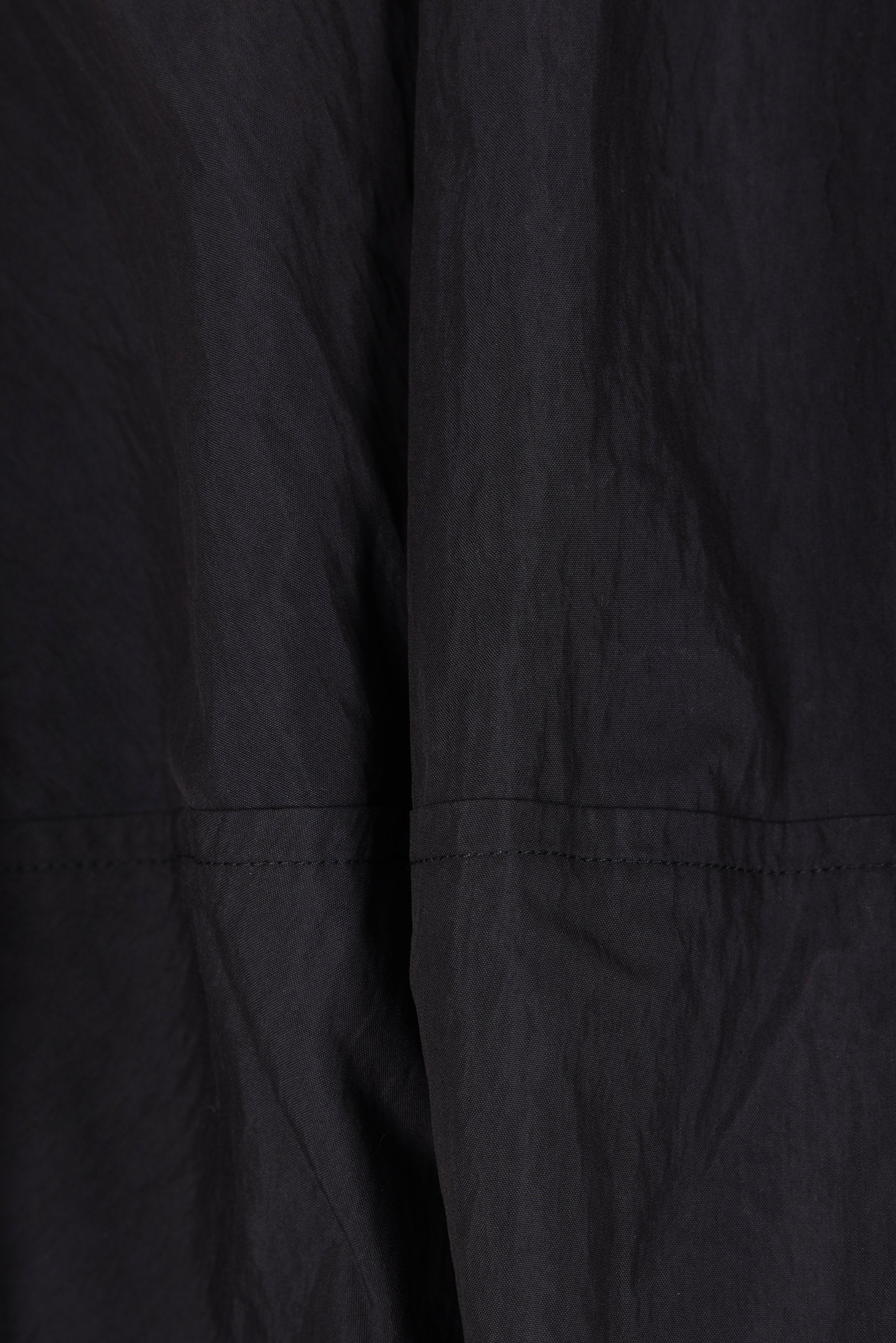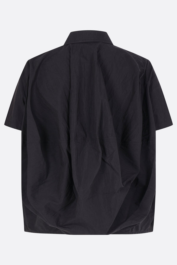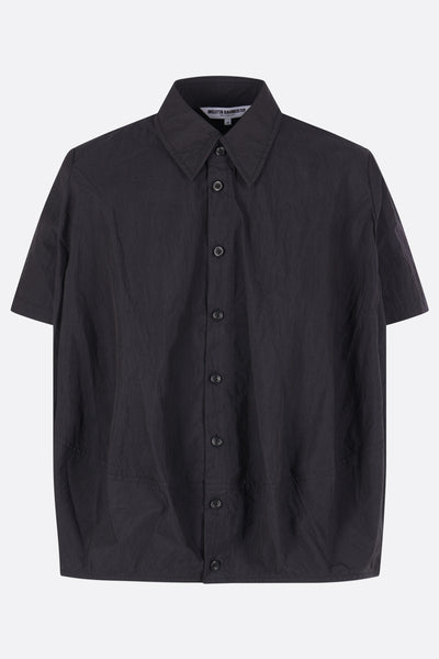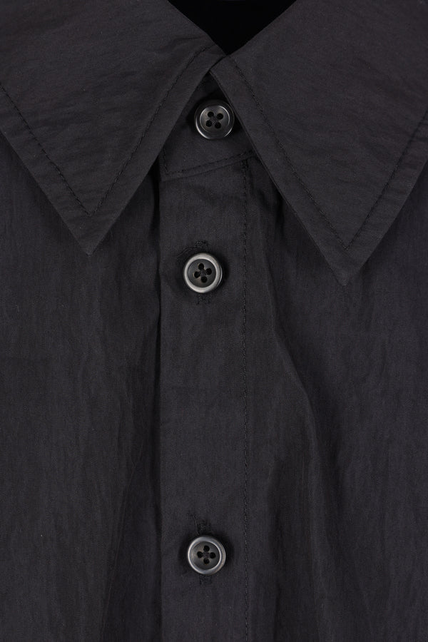 Camicia di Melitta Baumeister realizzata in cotone tecnico color nero con effetto stropicciato. Caratterizzata da colletto classico, chiusura frontale con bottoni, maniche corte e fondo a palloncino.