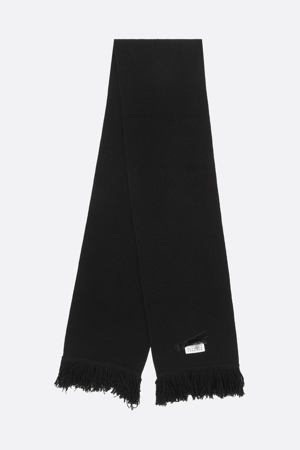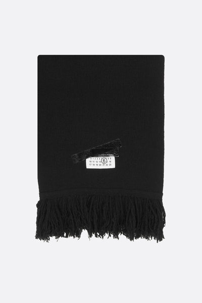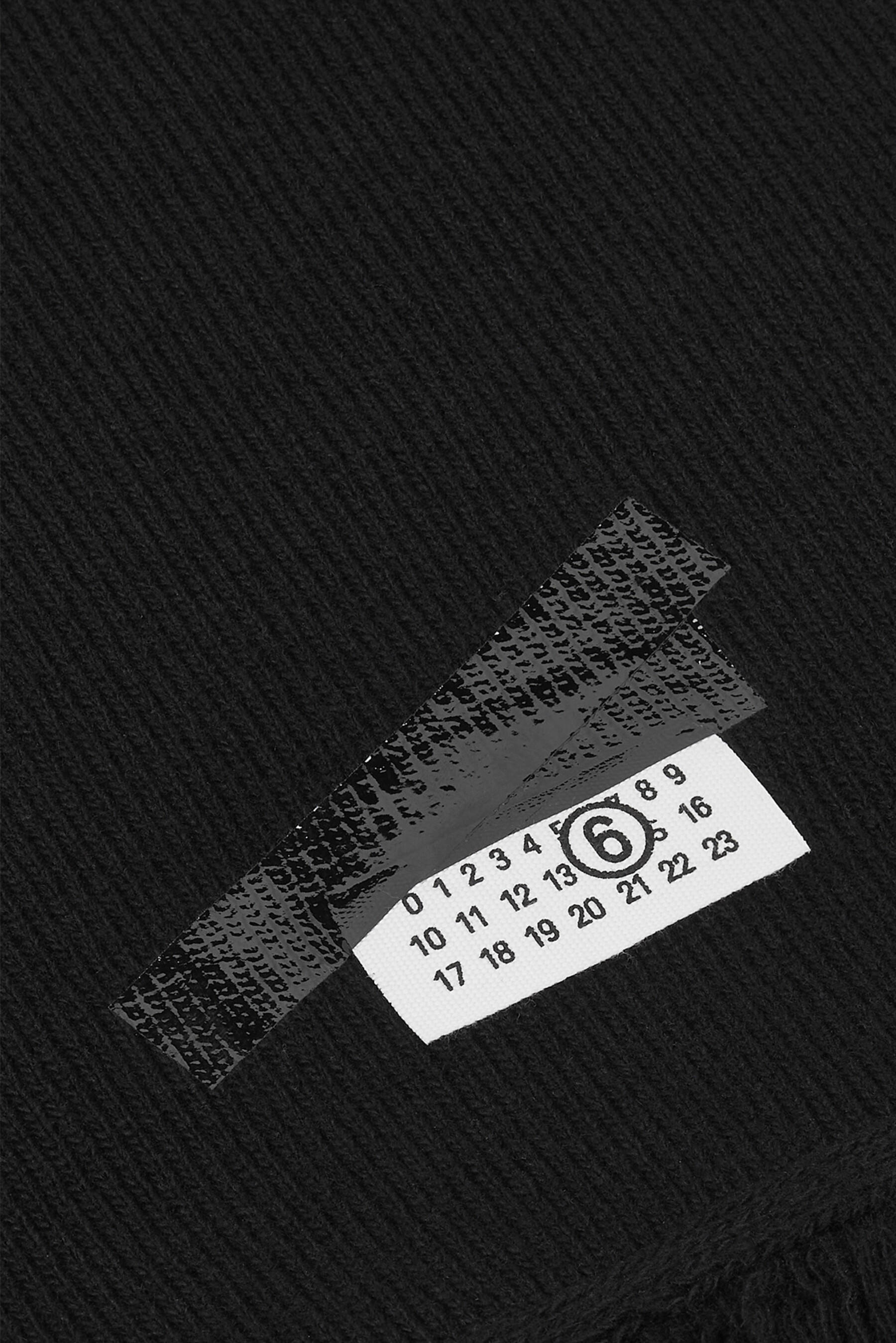 Sciarpa di MM6 realizzata in maglia di misto lana color nero con etichetta logo numerico sigillato sotto strati di nastro nero. Caratterizzata da frange su entrambe le estremità.