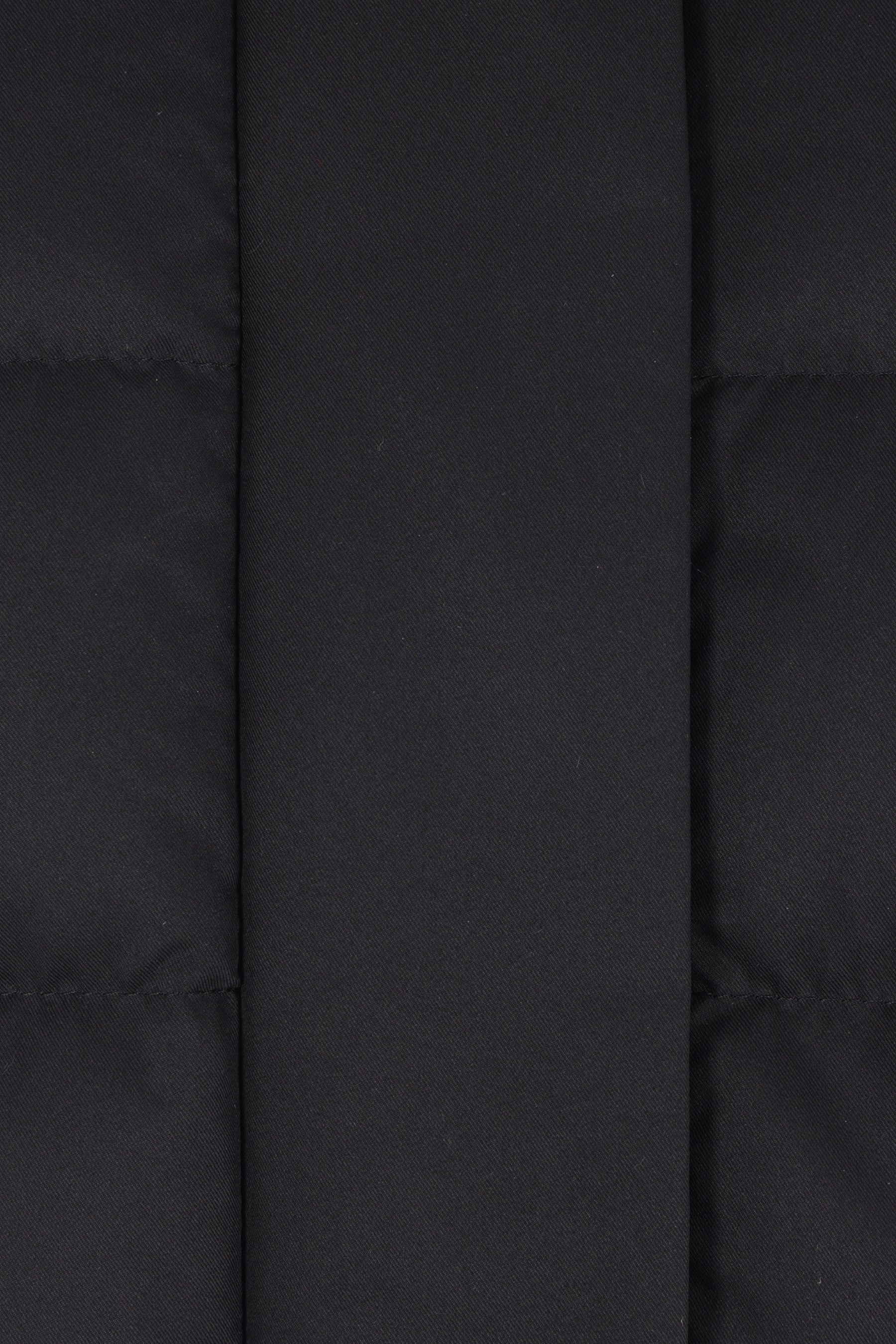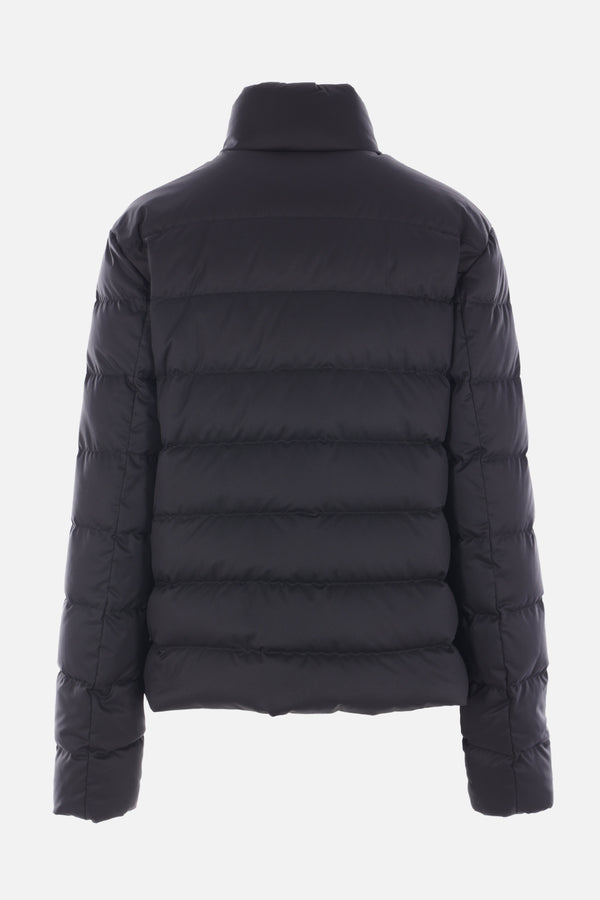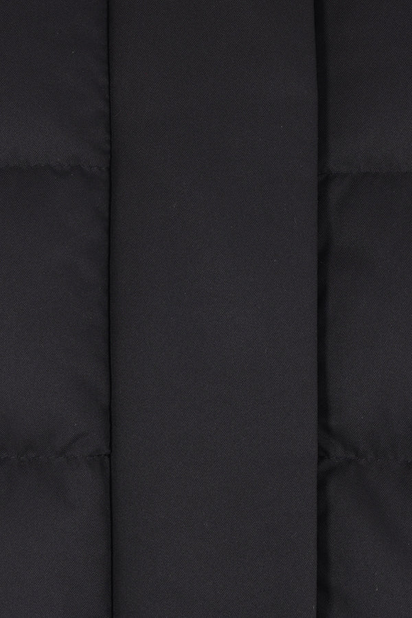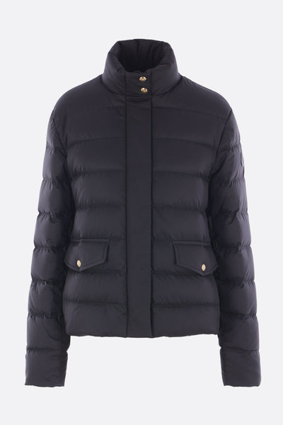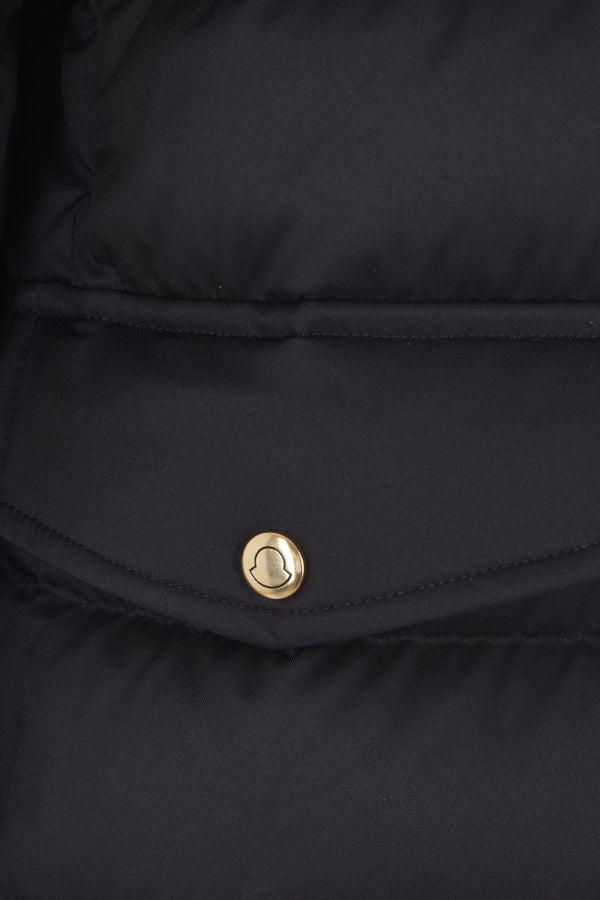 Piumino di Moncler realizzato in nylon color nero. Caratterizzato da collo alto, chiusura frontale con zip a doppio cursore / bottoni automatici, tasche frontali con patta, maniche lunghe e fondo dritto. Completa il design l'inconfondibile patch logo in pelle applicata sulla manica sinistra.