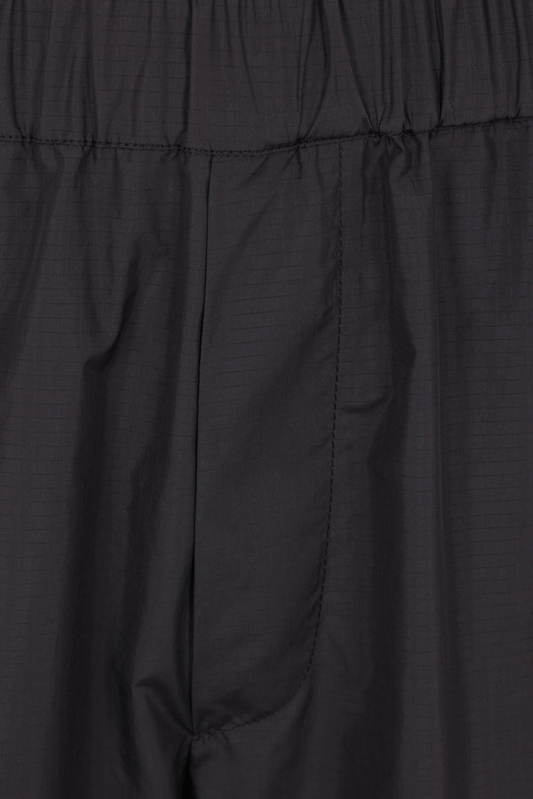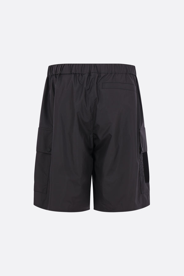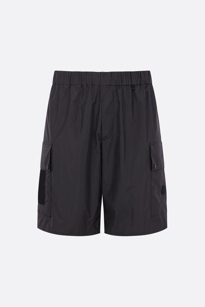 Pantalone corto cargo di Moncler realizzato in nylon ripstop color nero. Caratterizzato da fascia elasticizzata in vita con coulisse, tasche multiple e interno foderato in rete. Completa il design la patch logo in gomma applicata sulla tasca laterale.