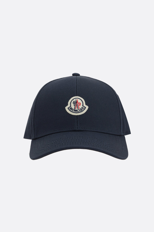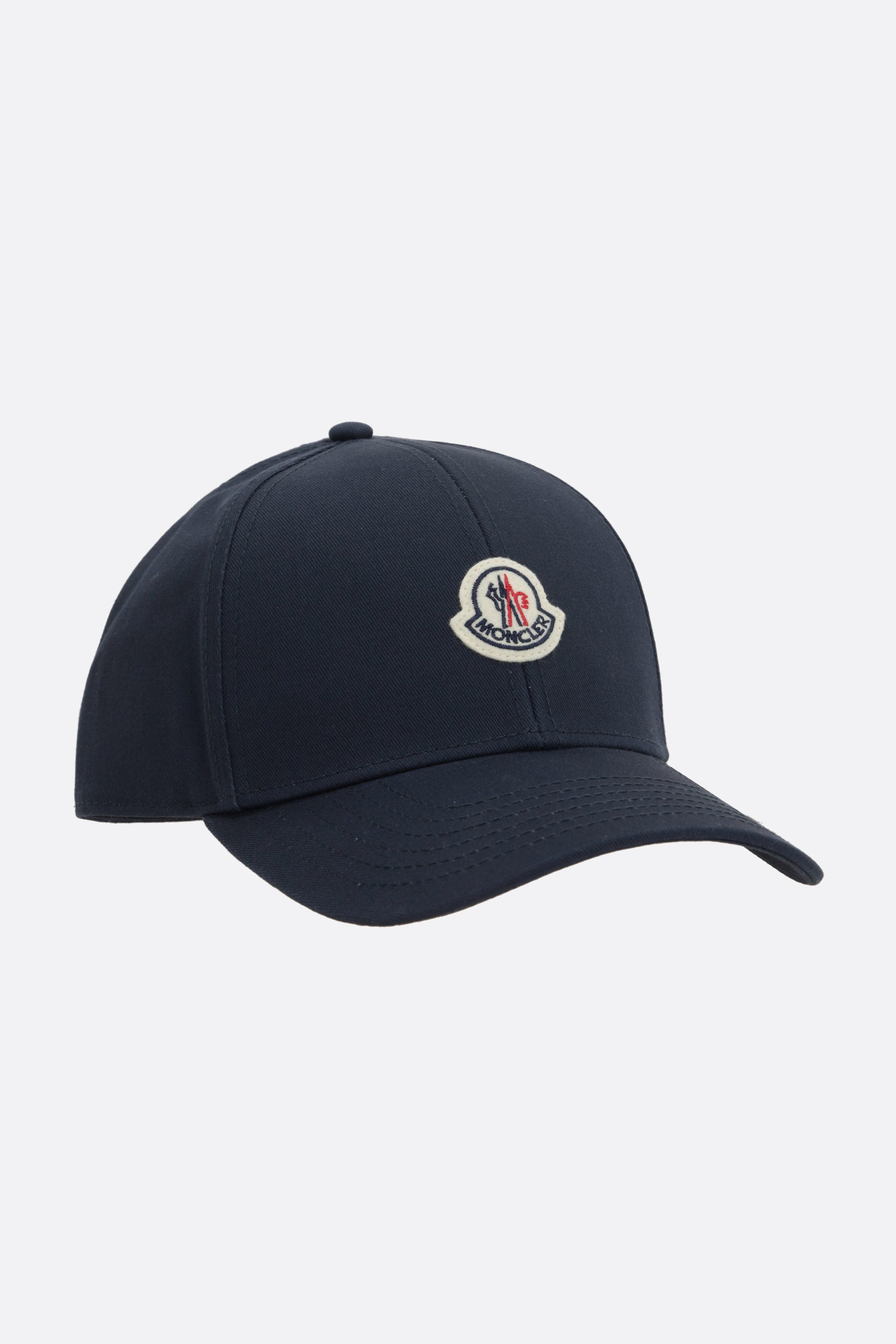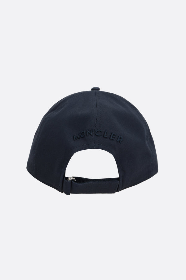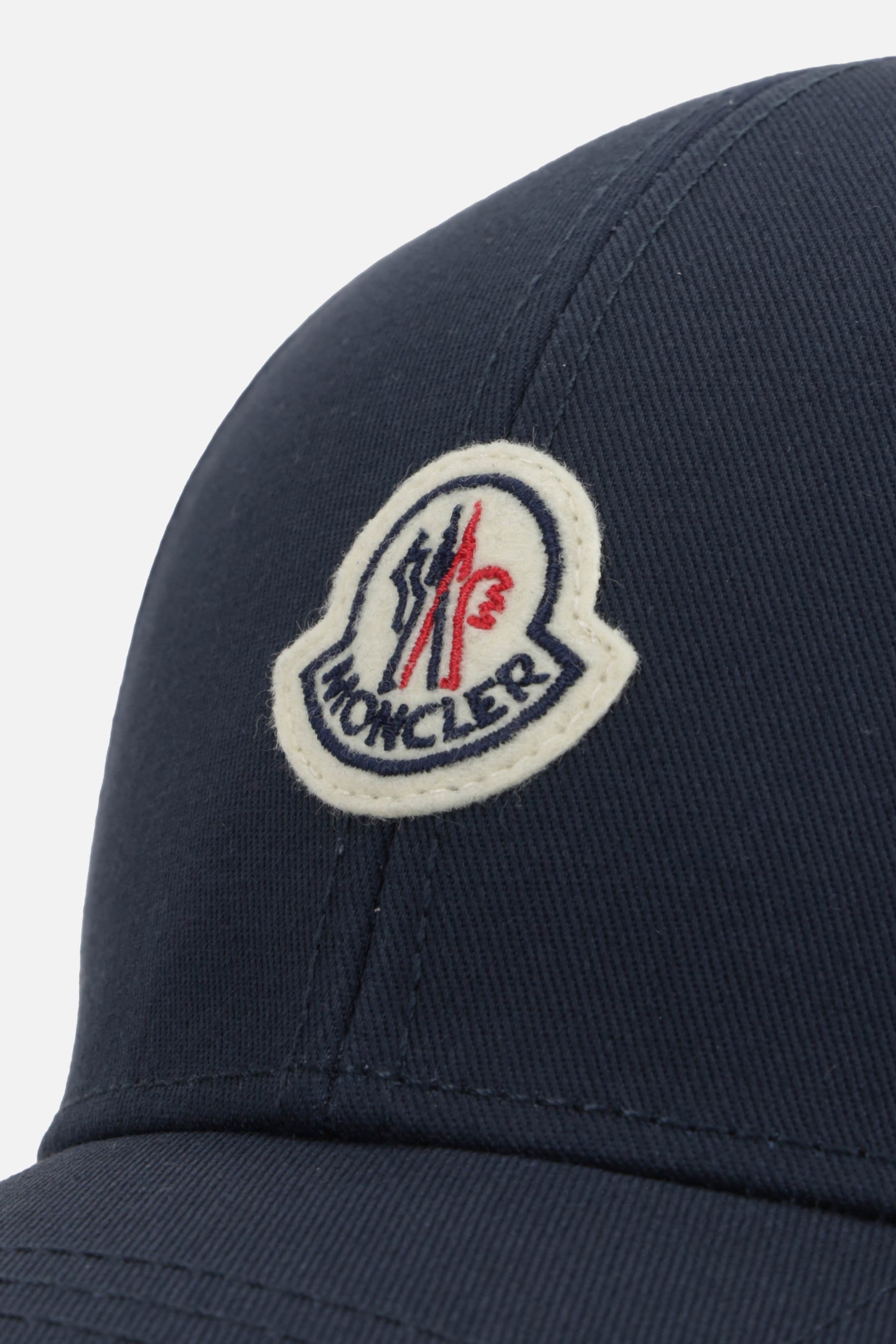 Cappello baseball di Moncler realizzato in gabardine di cotone color blu con patch logo applicata frontalmente e ricamo logo lettering tono su tono sul retro. Caratterizzato da cinturino regolabile con strappo in velcro e interno foderato.