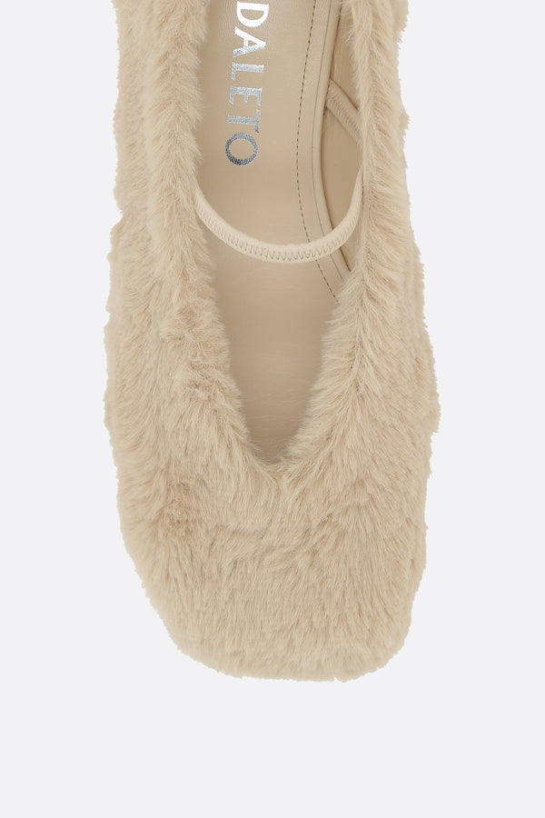Ballerina di Nodaleto realizzata in ecopelliccia color beige. Caratterizzata da cinturino frontale elasticizzato, punta squadrata con angoli smussati, fodere in pelle e suola in cuoio / gomma.