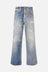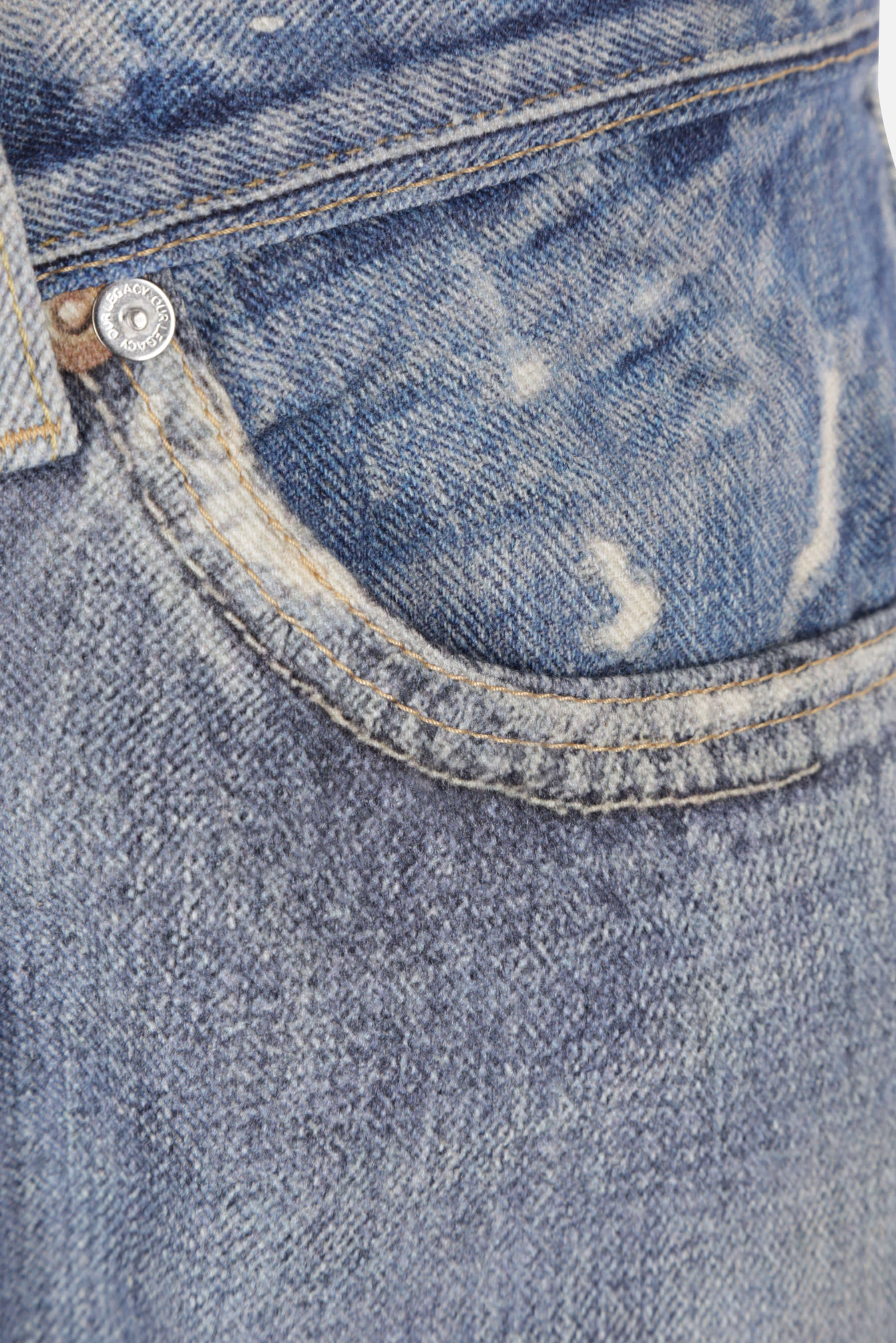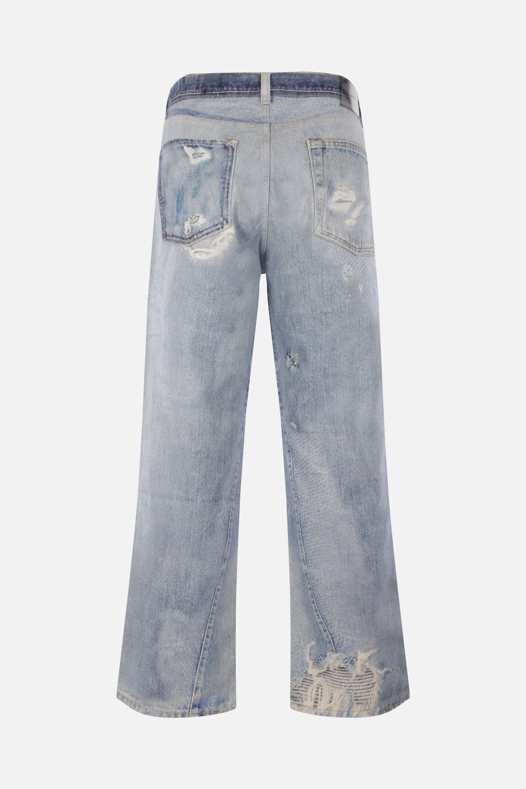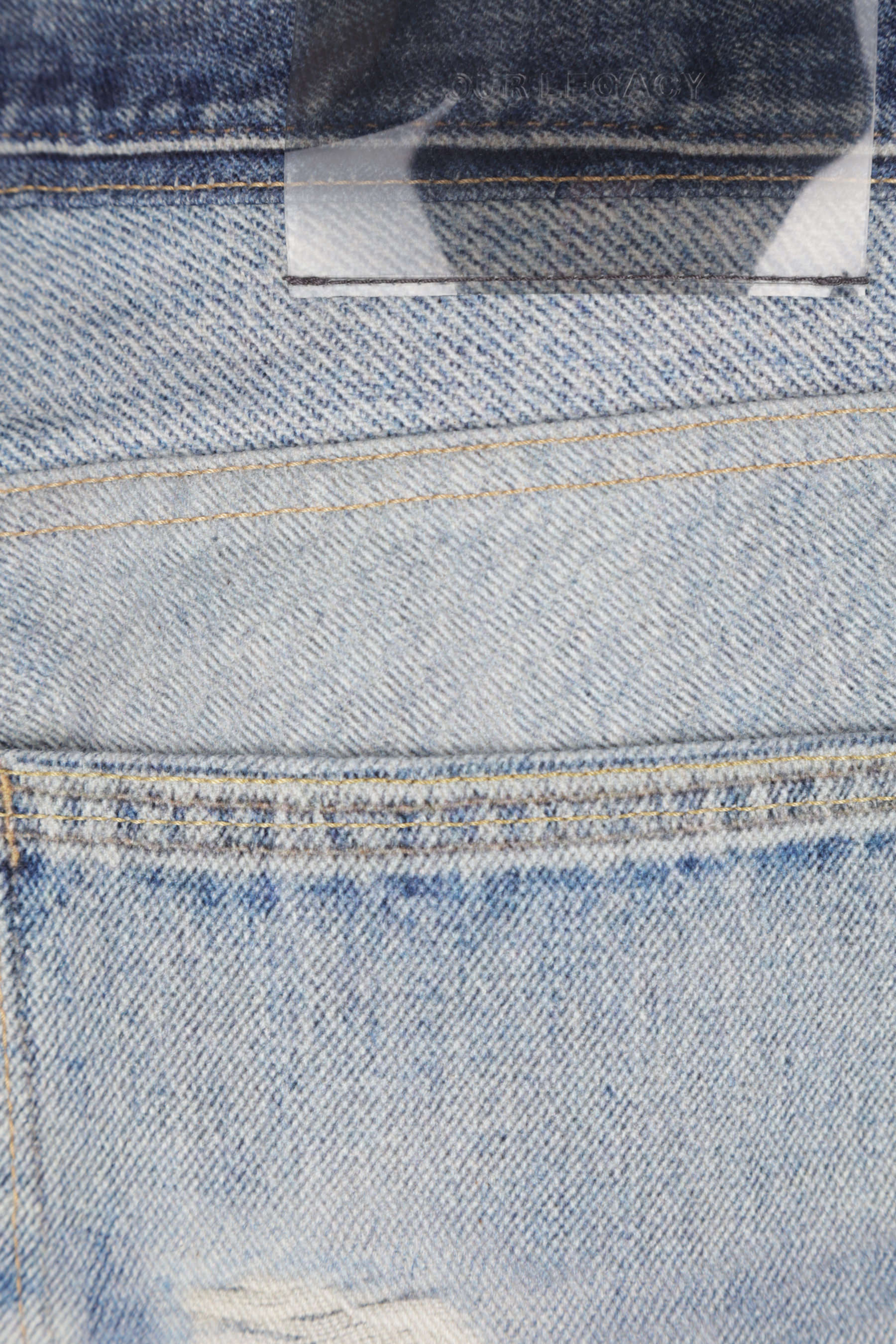 Jeans oversize di Our Legacy realizzato in denim di cotone con stampa trompe l'oeil a effetto sdrucito color blu slavato. Caratterizzato da chiusura con bottone / zip, passanti per cintura e cinque tasche classiche. Completa il design la patch logo sul retro.