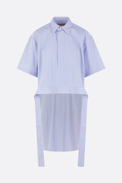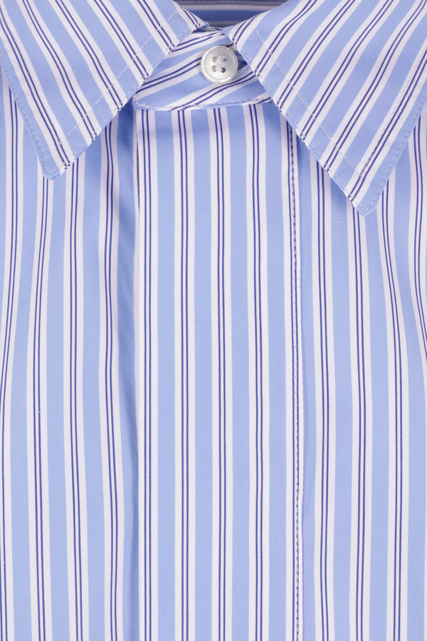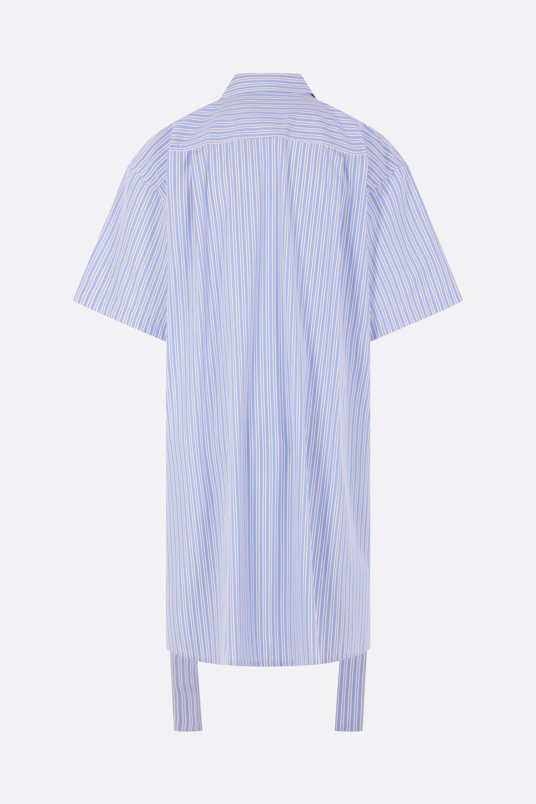 Camicia oversize di Plan C realizzata in popeline di cotone a righe color bianco e azzurro. Caratterizzata da colletto classico, chiusura frontale nascosta con bottoni, maniche corte e fondo dritto da annodare sulla schiena con orlo più lungo sul retro.