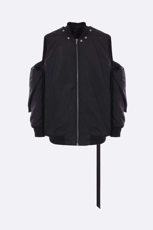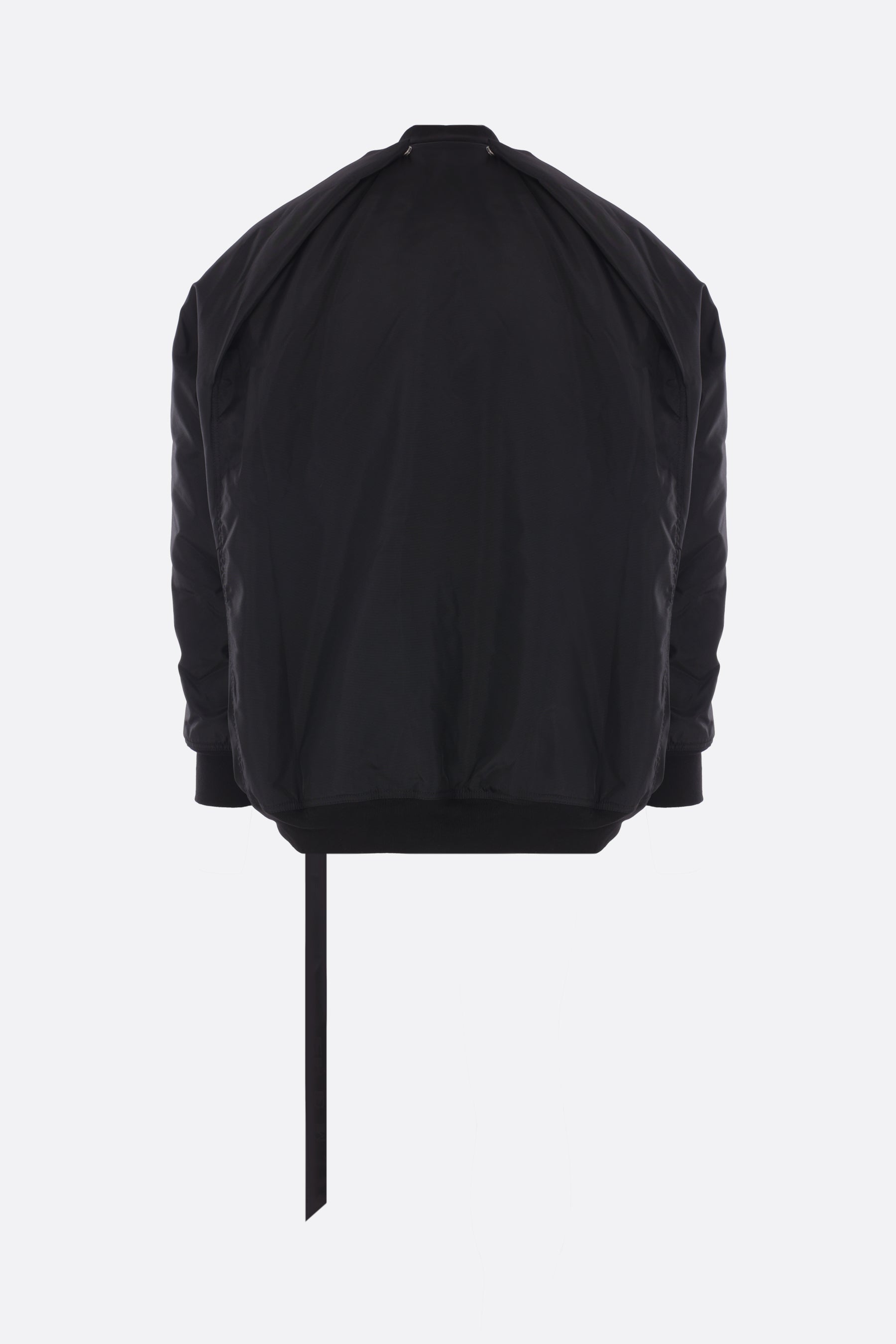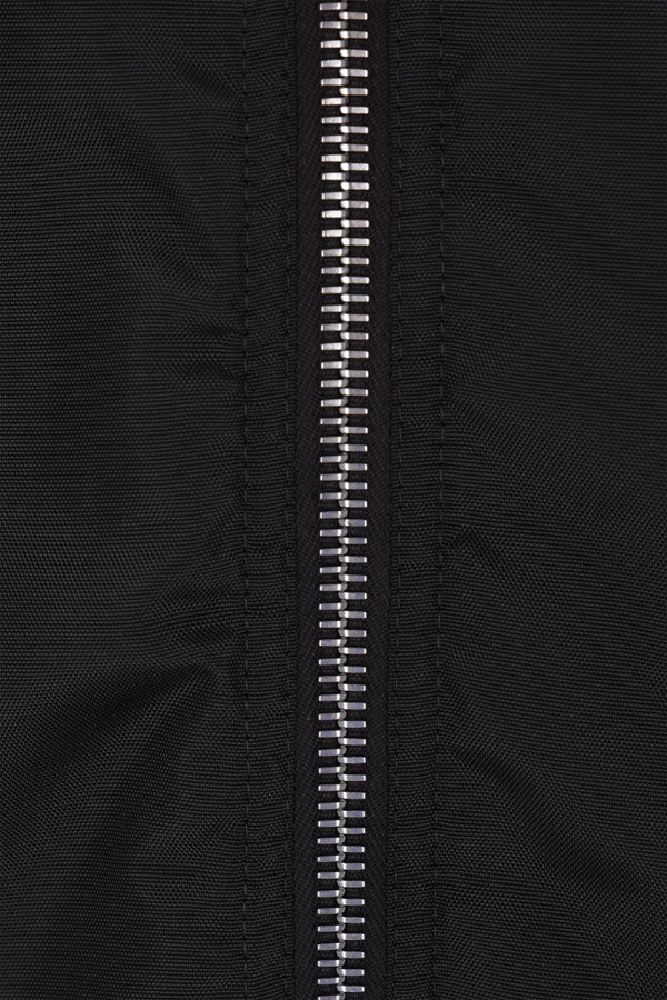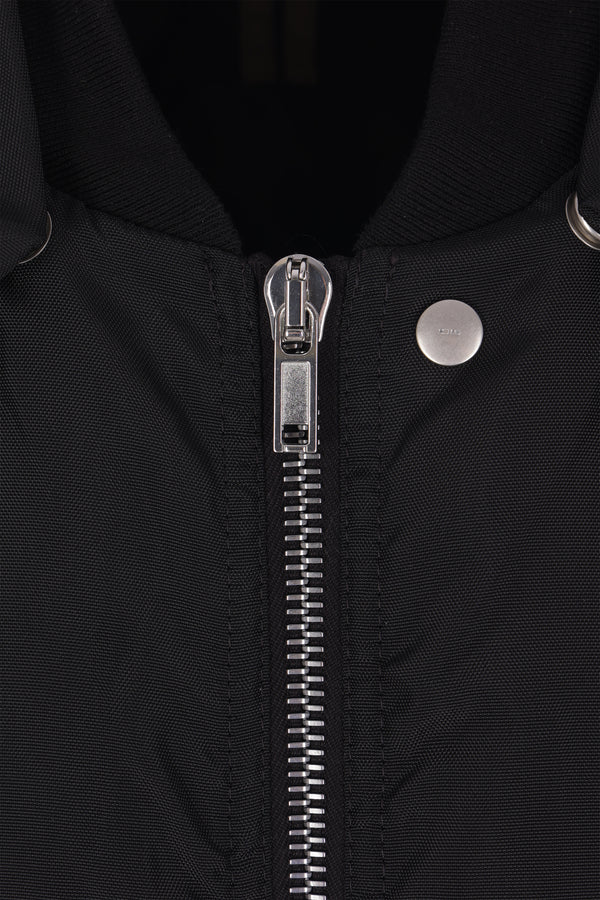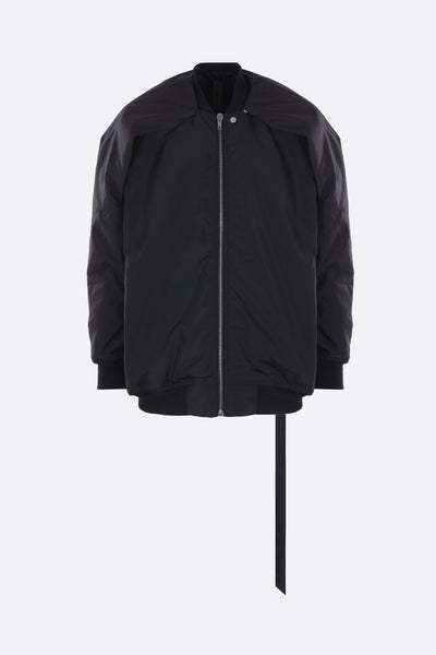 Bomber imbottito dalla linea oversize di Rick Owens DRKSHDW realizzato in nylon color nero. Caratterizzato da collo bomber, chiusura frontale con zip, tasche laterali, maniche lunghe e bordi in maglia a costine. Completano il design i bottoni a pressione sulle spalle che consentono di modicare la vestibilità.