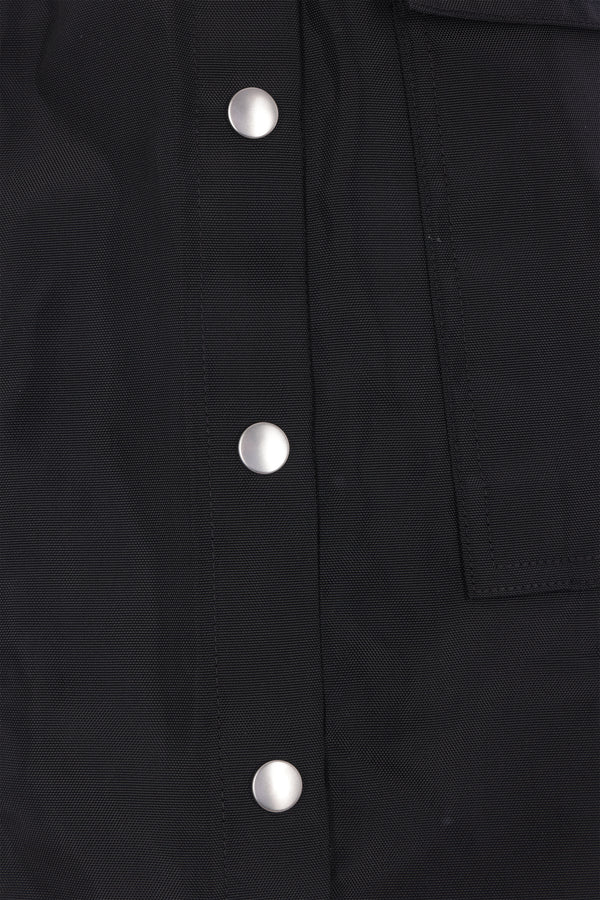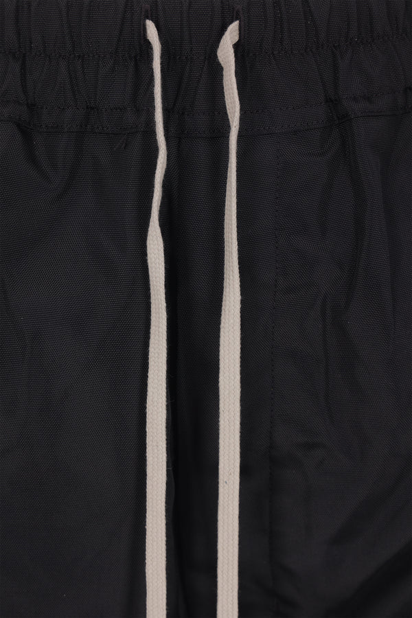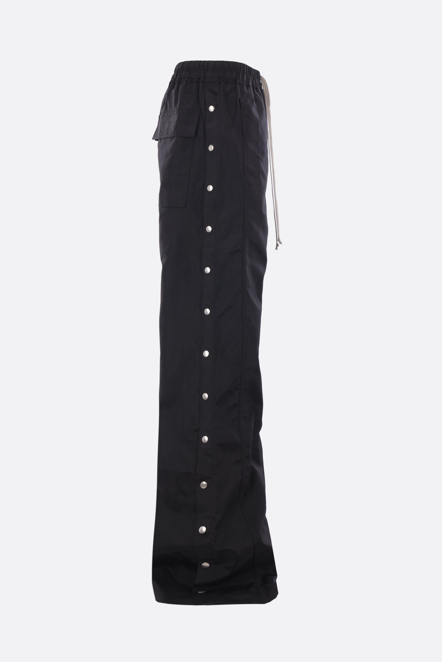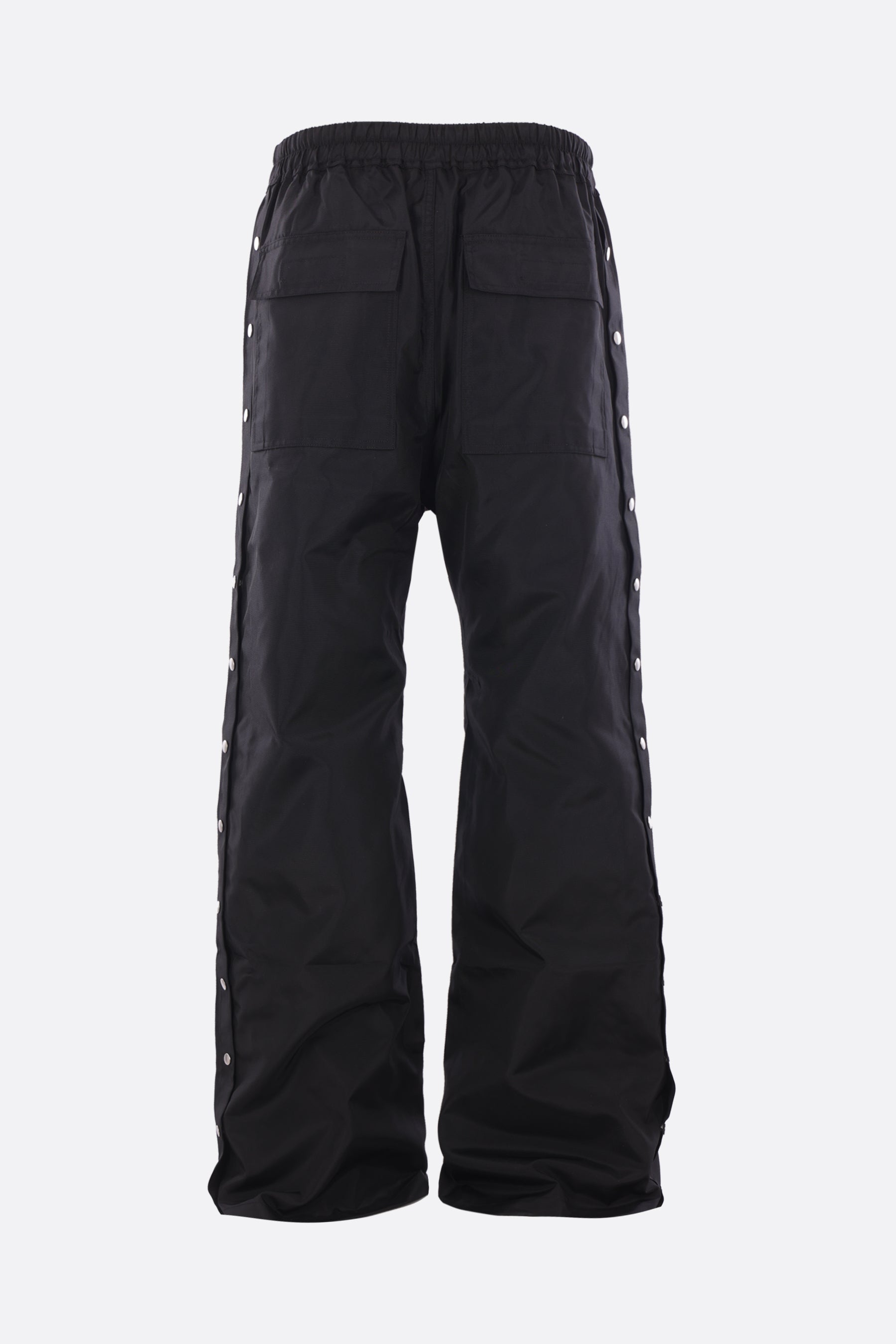 Pantalone a gamba ampia di Rick Owens DRKSHDW realizzato in canvas di nylon color nero. Caratterizzato da fascia elasticizzata in vita con coulisse, apertura frontale con bottoni metallici, tasche multiple e bottoni automatici lungo i lati.