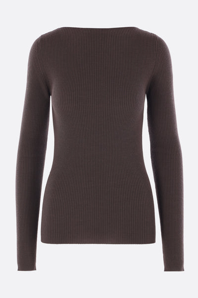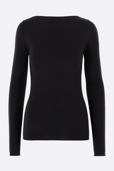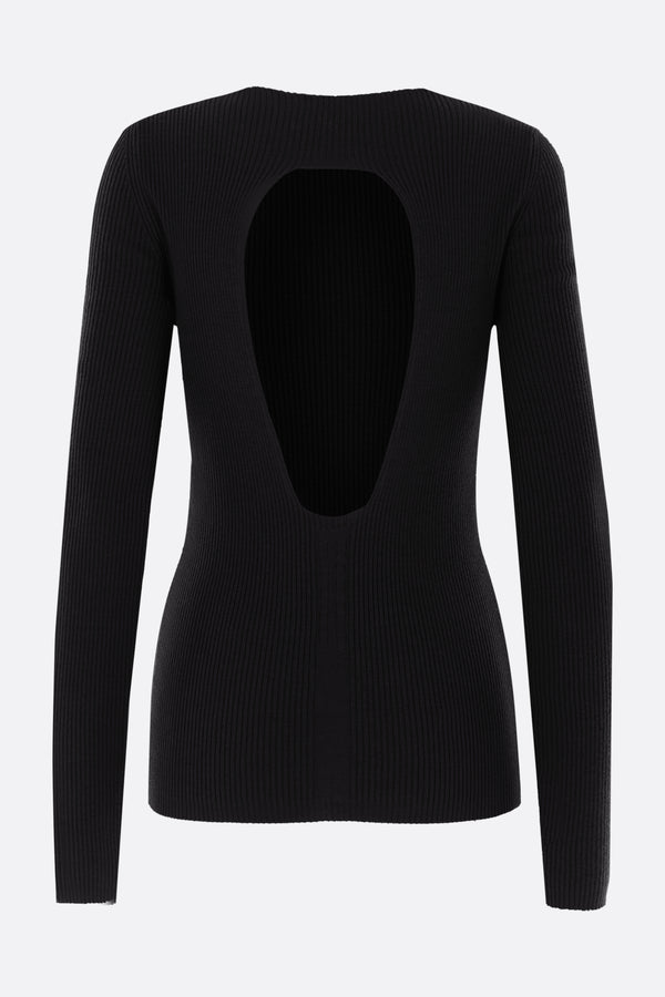 Pullover di Rick Owens realizzato in maglia a coste color nero. Caratterizzato da scollatura a barca, maniche lunghe, fondo dritto e cut-out sul retro.