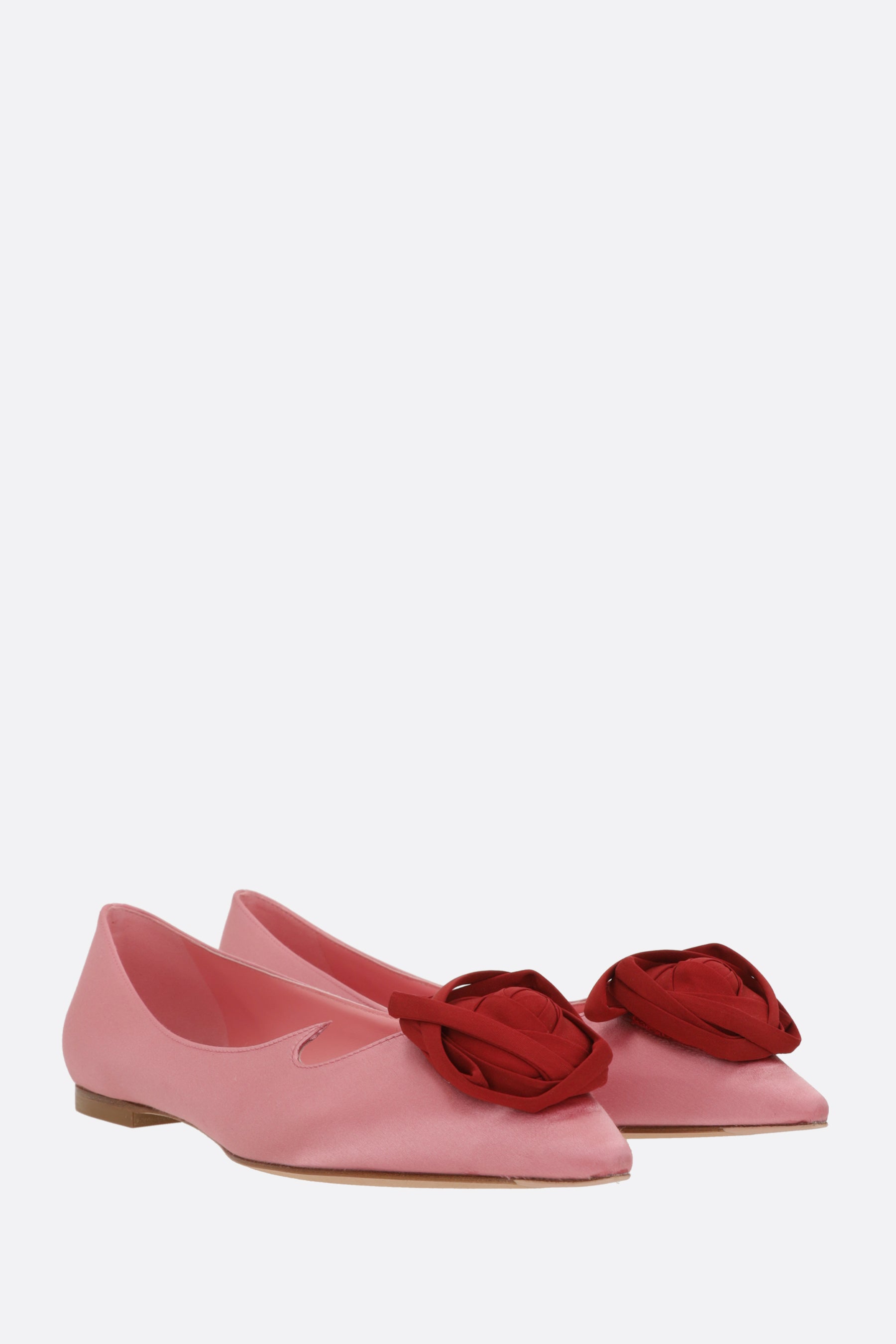 Ballerina di Roger Vivier realizzata in raso con applicazione rosa 3D. Caratterizzata da punta affilata, fodere in pelle e suola in cuoio.