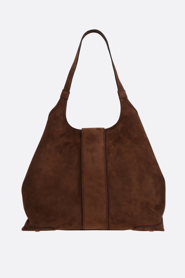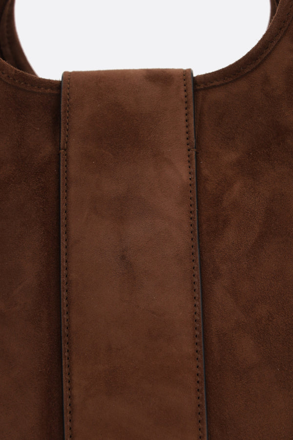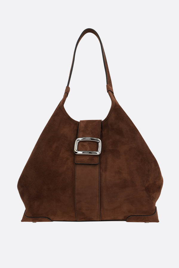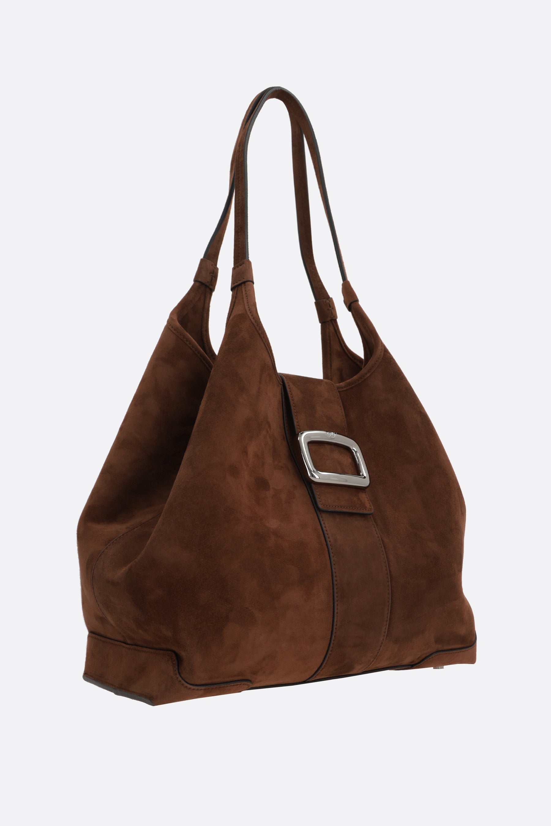 Borsa tote di Roger Vivier realizzata in suede color marrone. Caratterizzata da metalleria color rutenio, chiusura esterna con bottone magnetico, chiusura interna con bottoni automatici, doppio manico e piedini protettivi in metallo. L'interno foderato in tessuto color nero è dotato di tasca piatta.