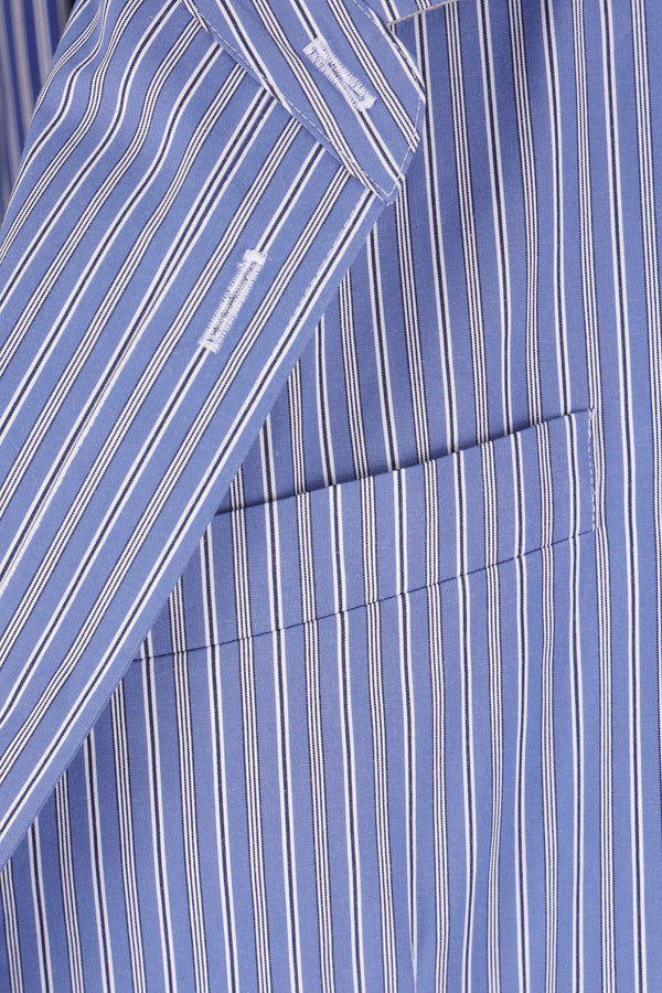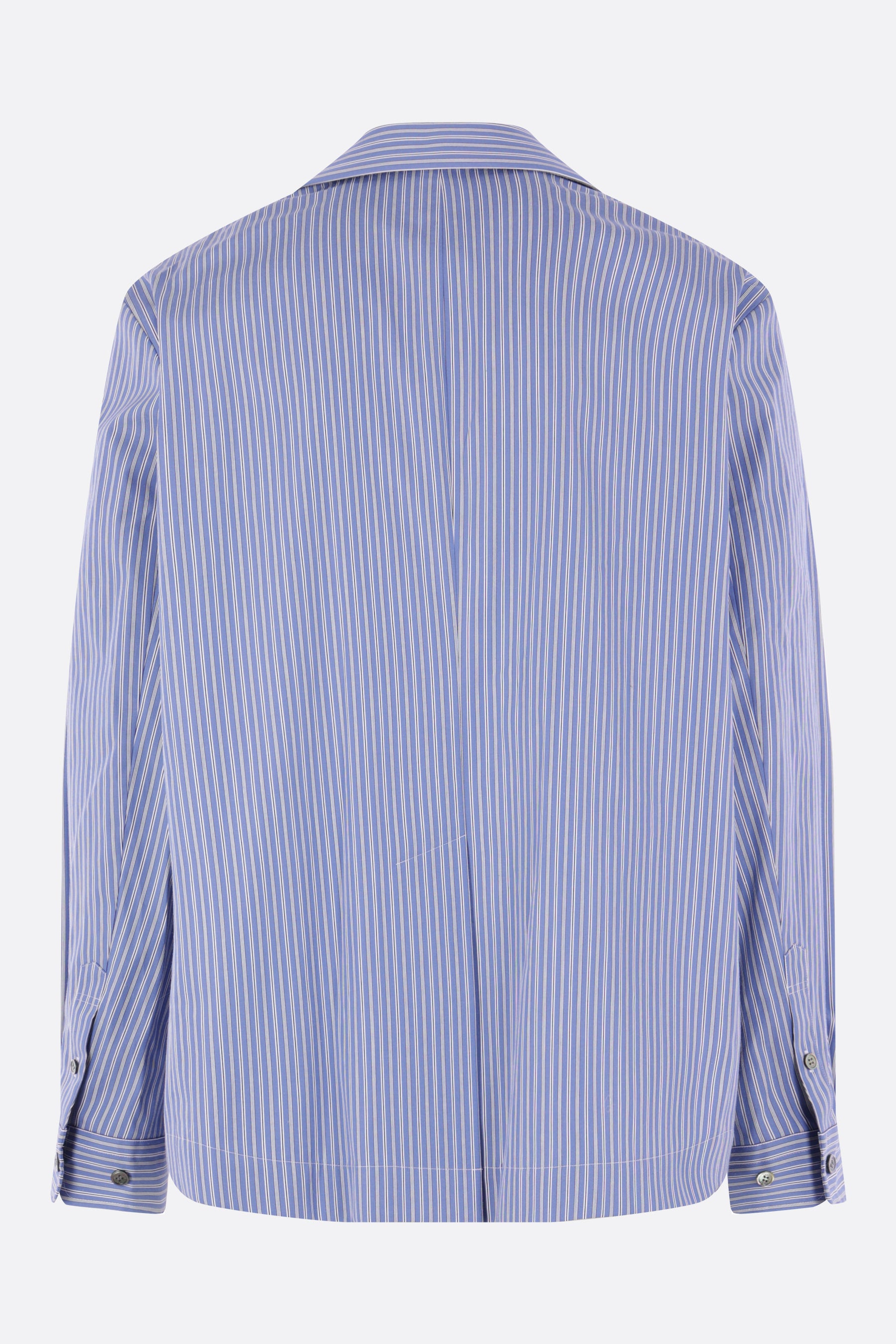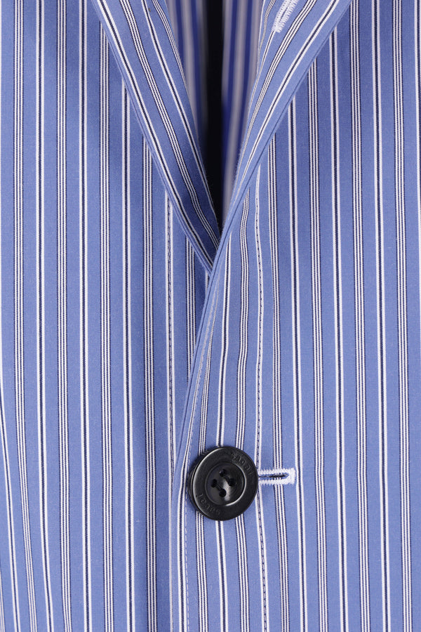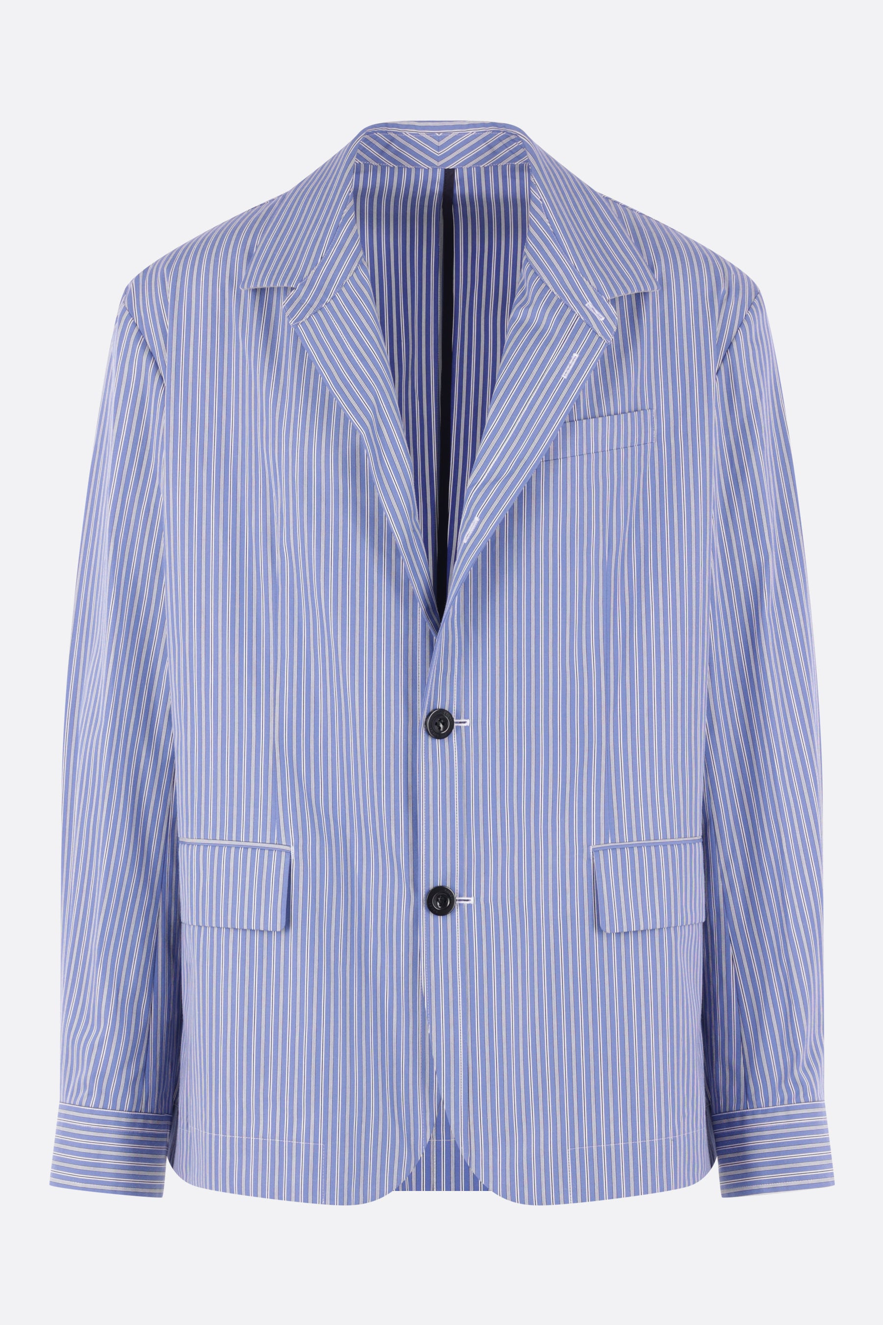 Giacca monopetto di Sacai realizzata in popeline di cotone a righe color blu e bianco. Caratterizzata da rever classico, chiusura frontale con bottoni, tasche multiple, maniche lunghe con polsini abbottonati, spacco centrale sul retro e interno sfoderato.
