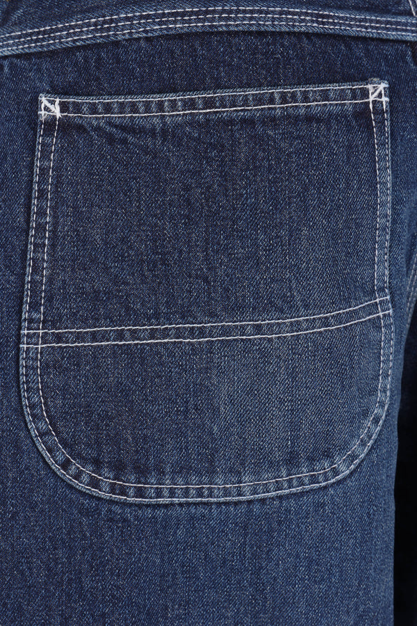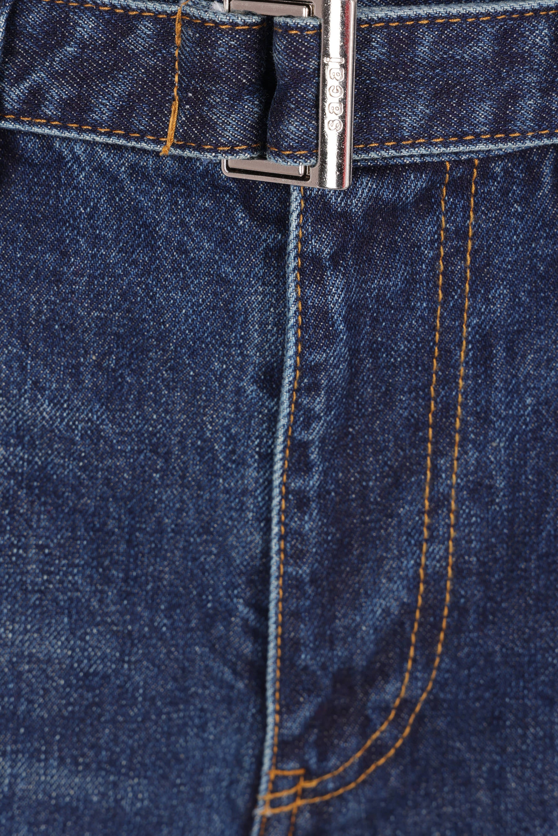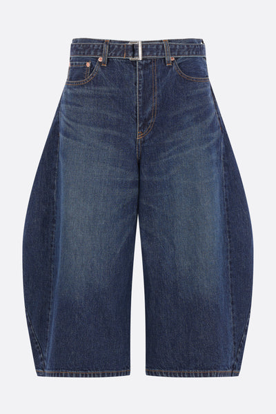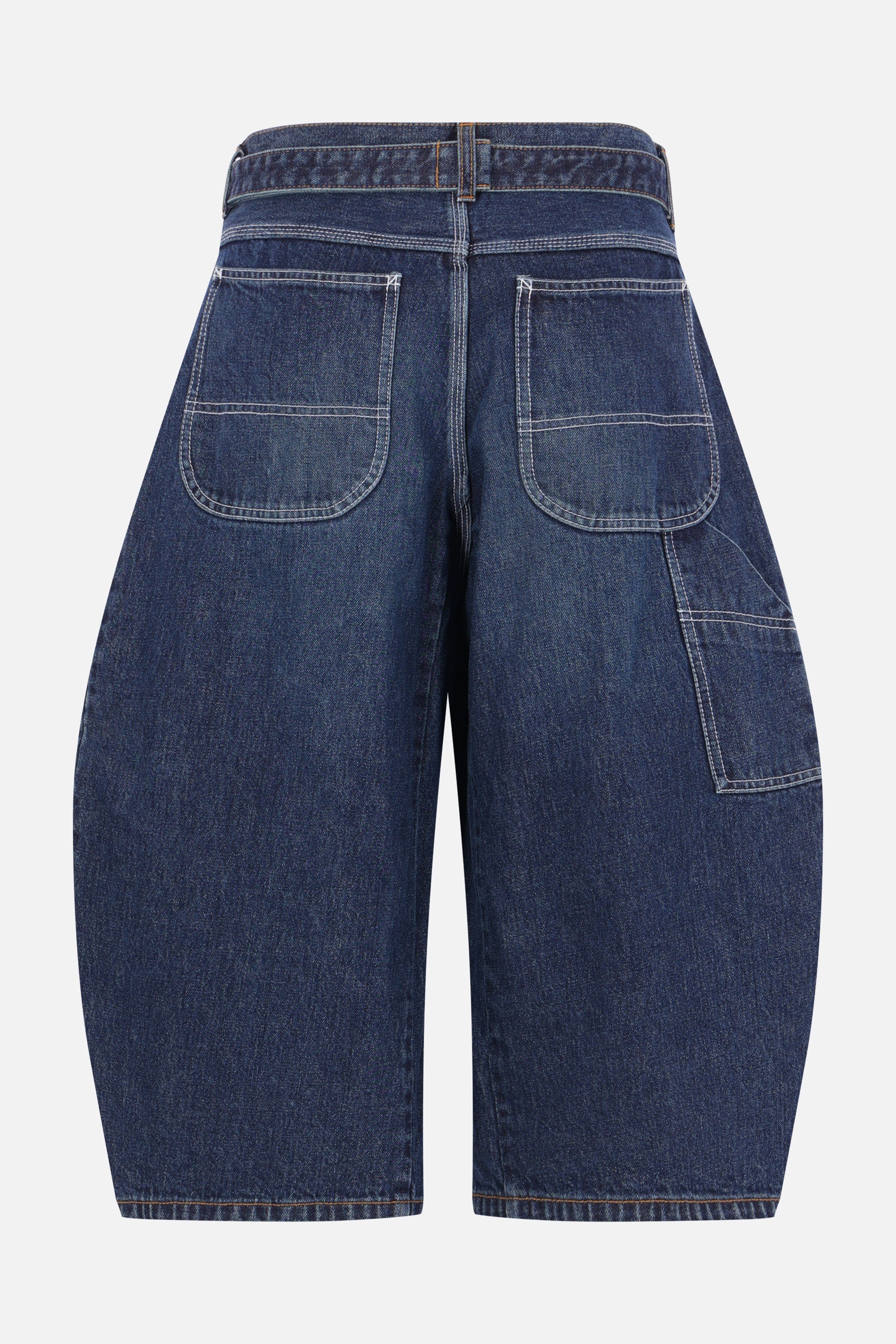 Jeans cropped a gamba curva di Sacai realizzato in denim di cotone color blu. Caratterizzato da chiusura frontale con bottone metallico / zip, passanti con cintura coordinata e tasche multiple.