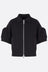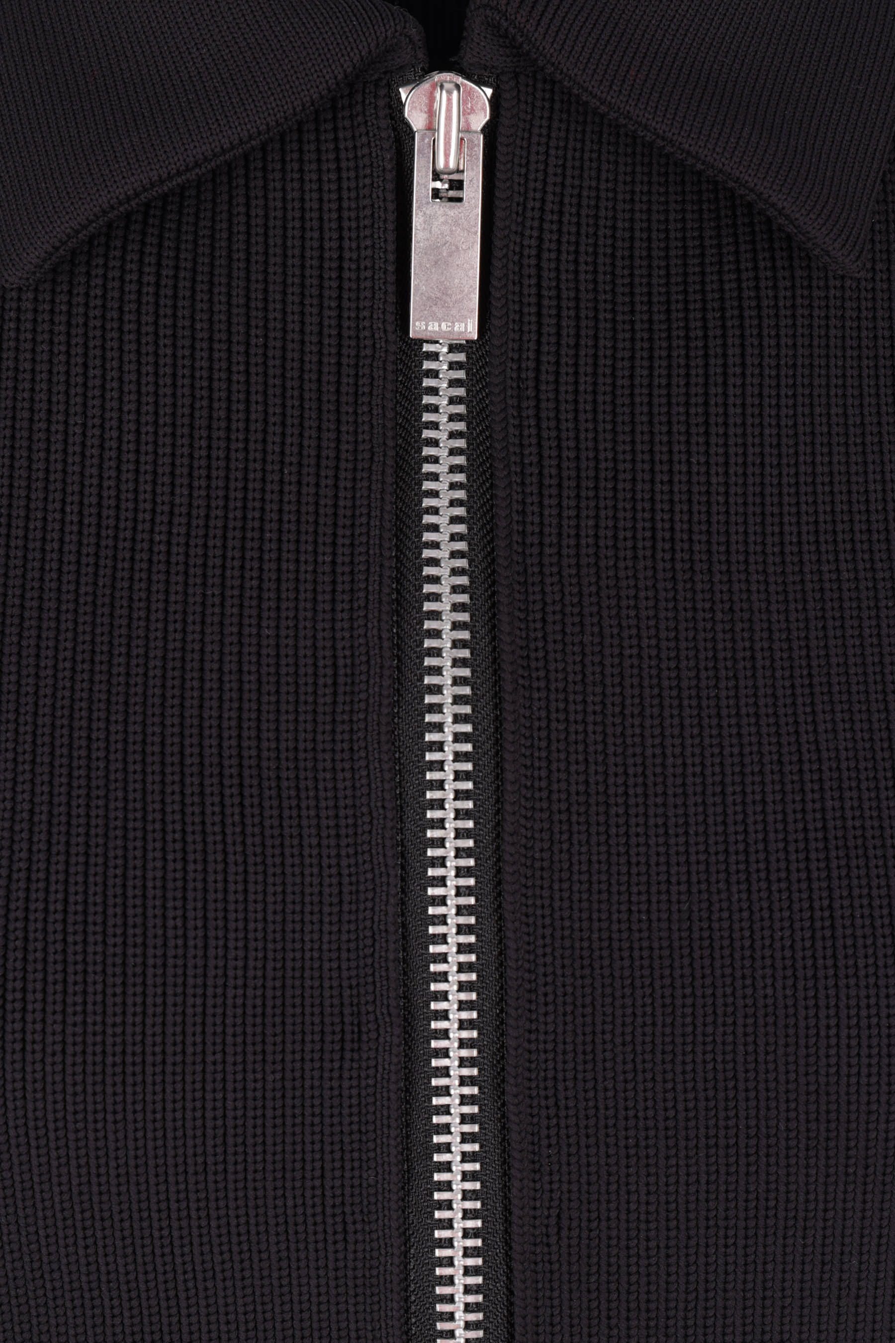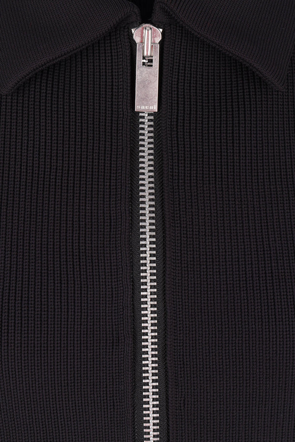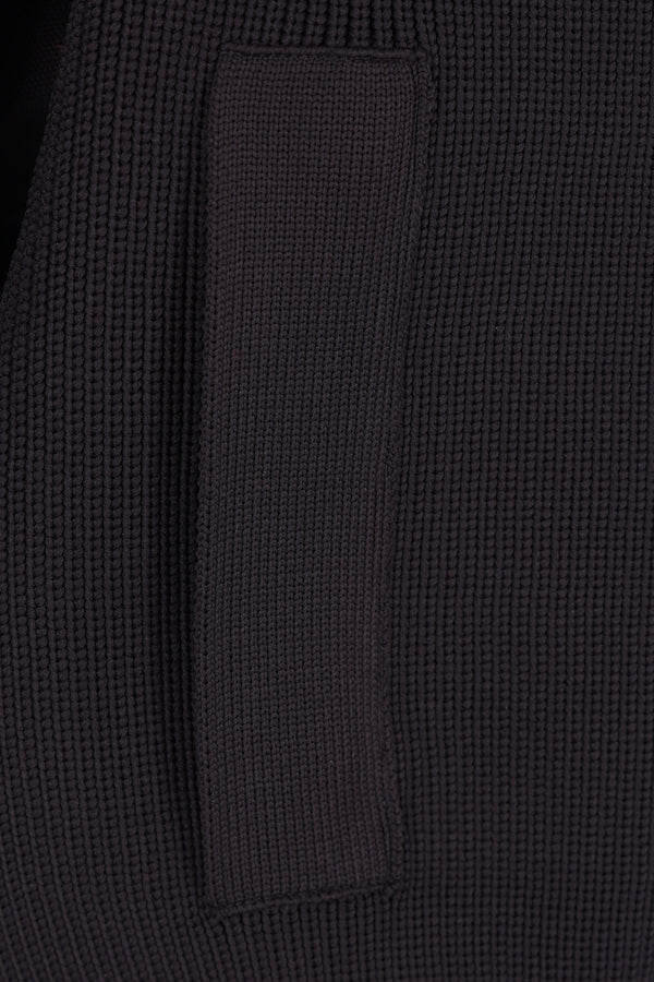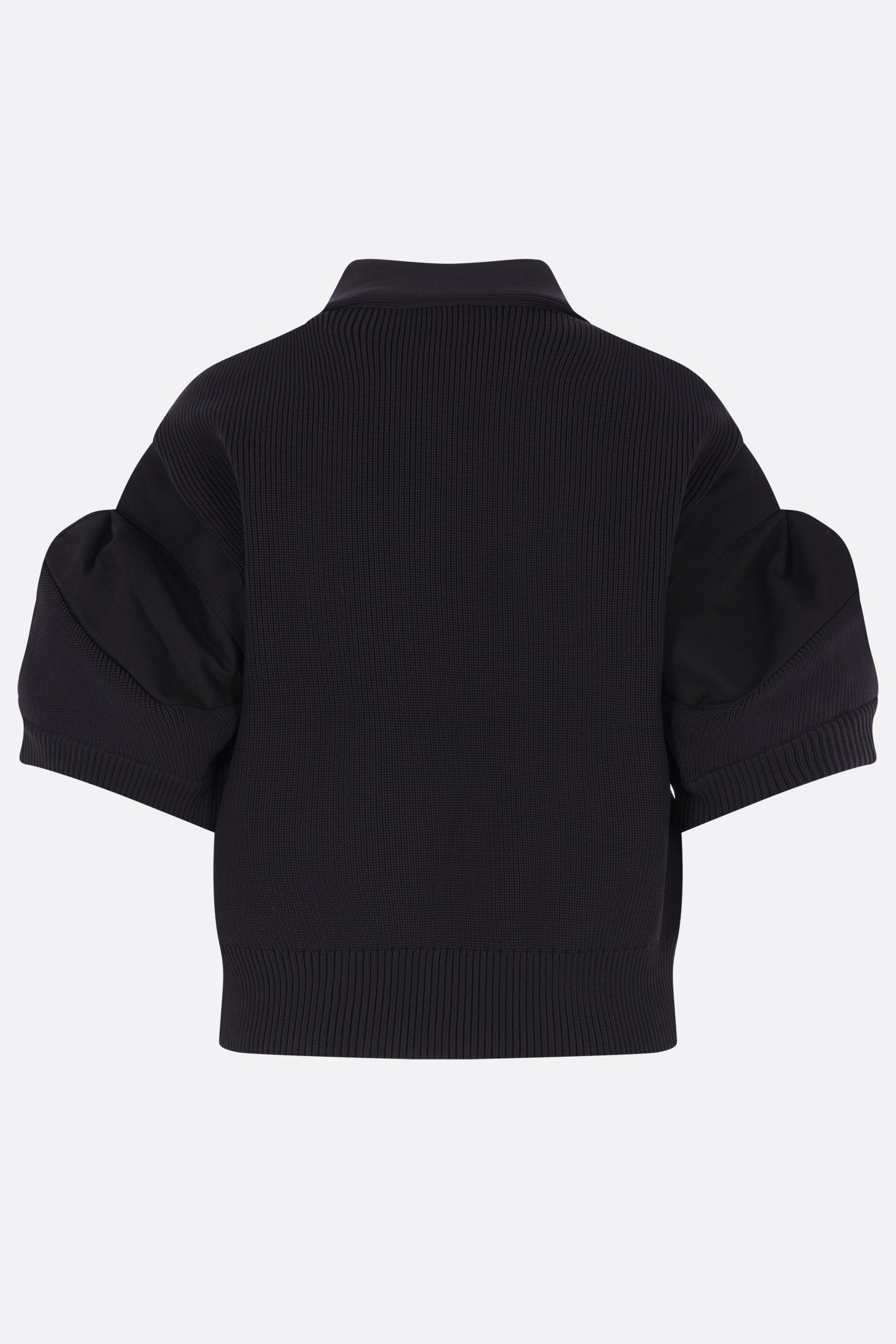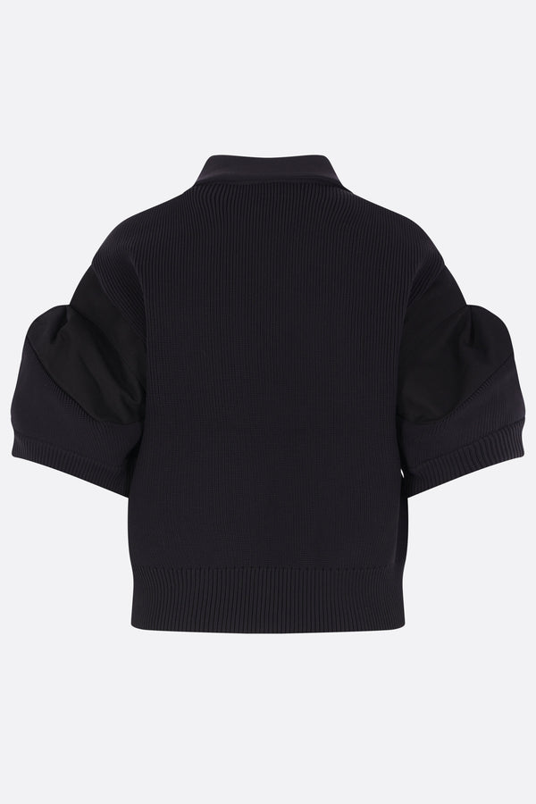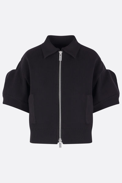 Cardigan di Sacai realizzato in maglia a coste color nero. Caratterizzato da colletto a punta, chiusura frontale con zip a doppio cursore, maniche corte a sbuffo, tasche a filetto e fondo dritto.