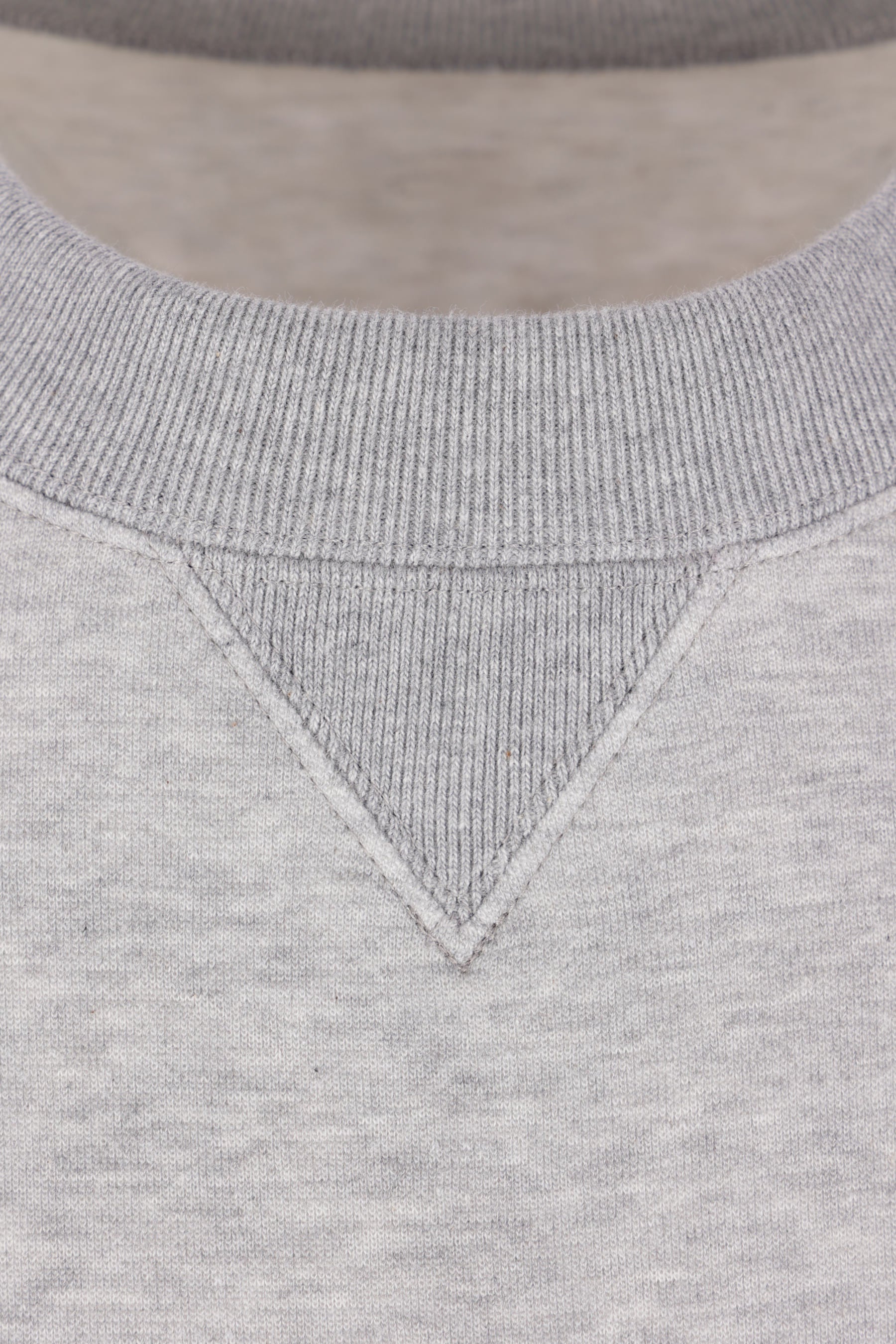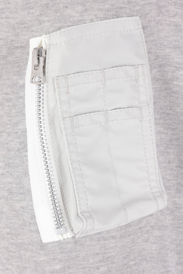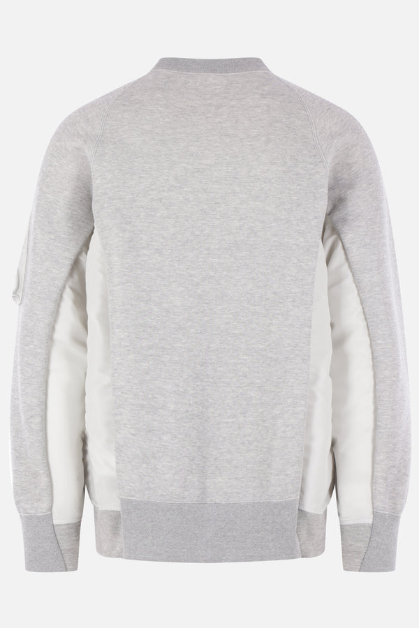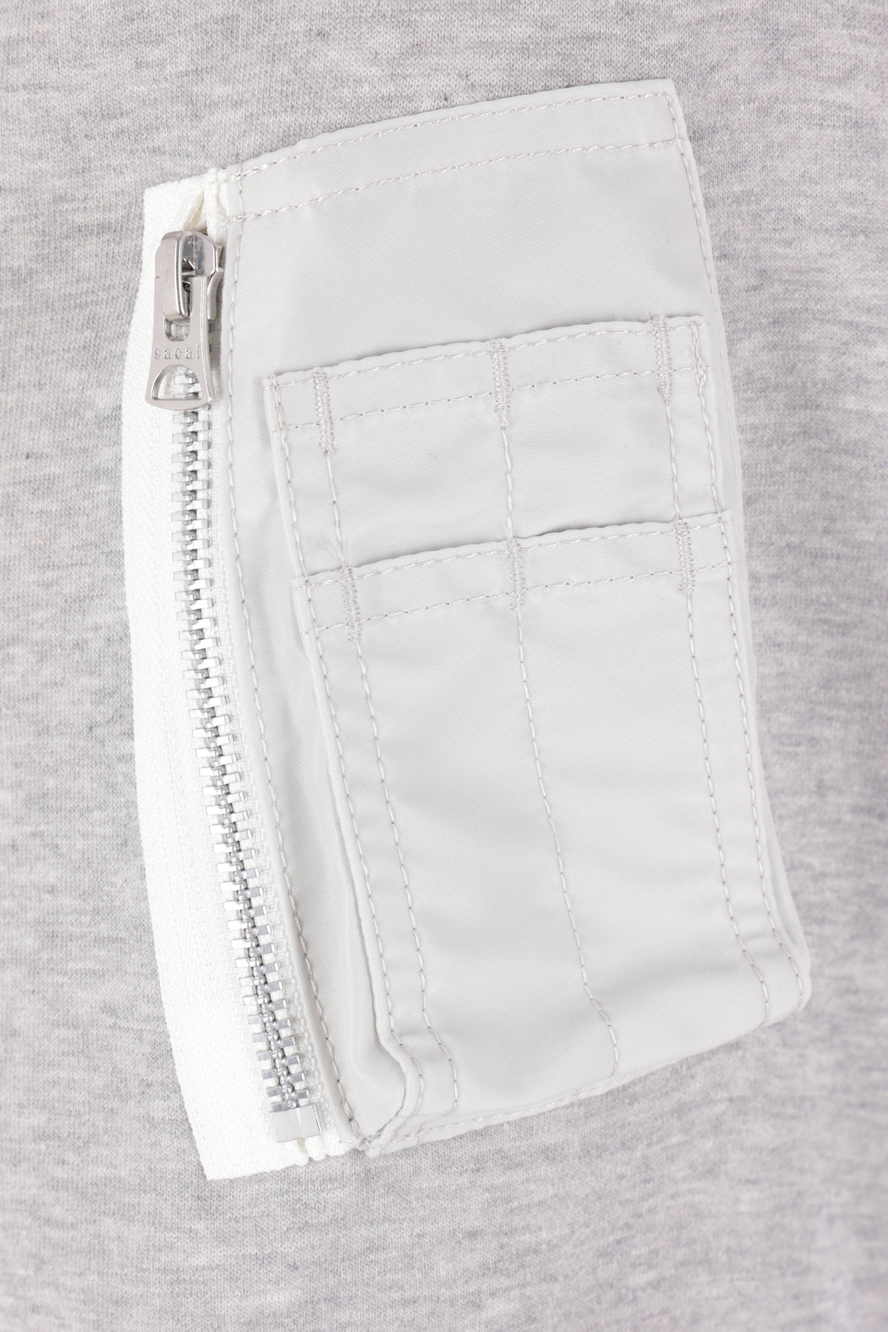 Felpa di Sacai realizzata in jersey di misto cotone color grigio chiaro con inserti laterali stile bomber in twill di nylon tono su tono. Caratterizzata da scollatura a giro, tasche multiple, maniche lunghe e bordi a costine.