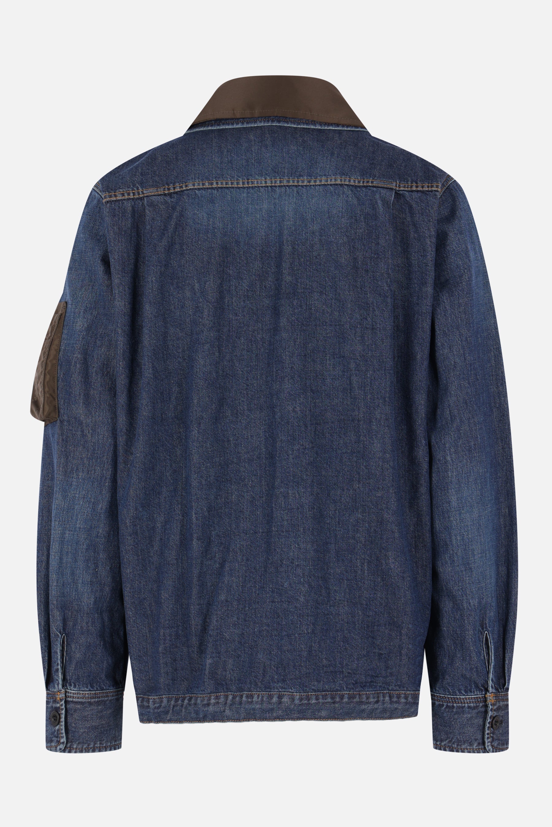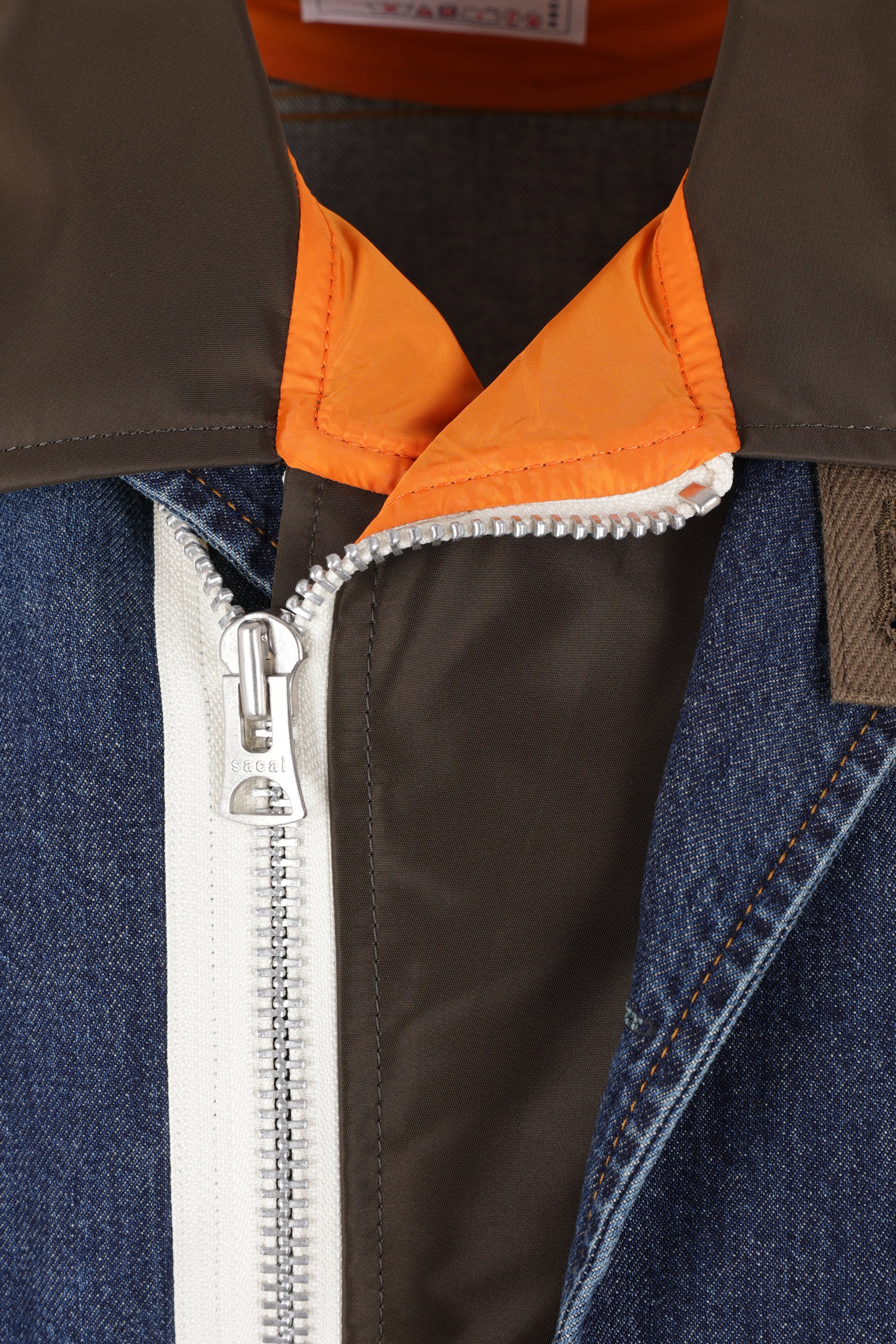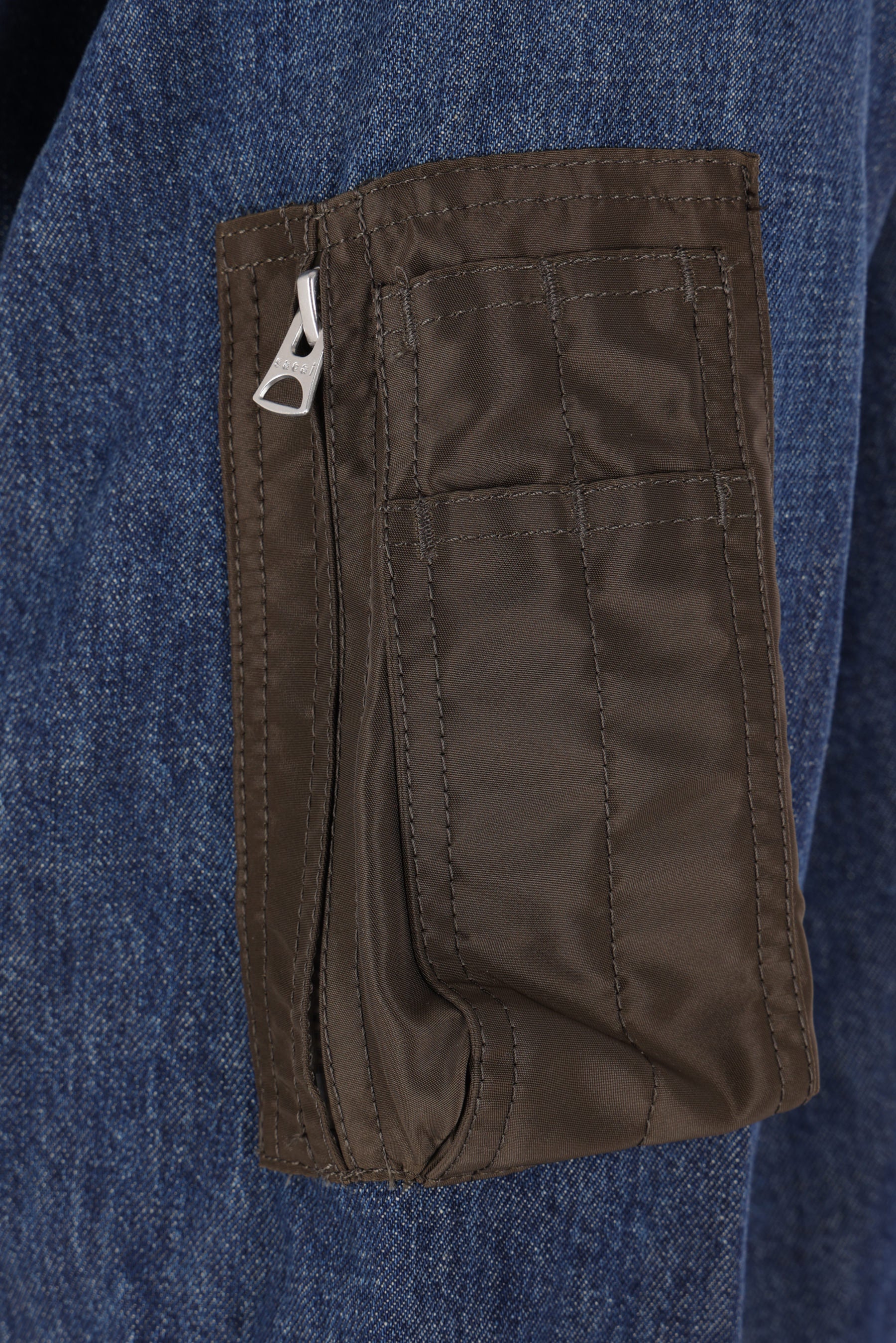 Giubbotto di Sacai realizzato in denim di cotone color blu e nylon color kaki. Caratterizzato da colletto doppio con revers, chiusura decentrata con zip a doppio cursore, tasche multiple, maniche lunghe con polsini abbottonati e fondo dritto con coulisse. Interno parzialmente foderato.