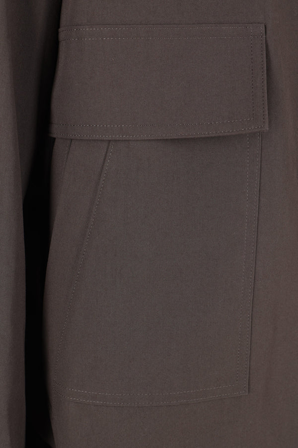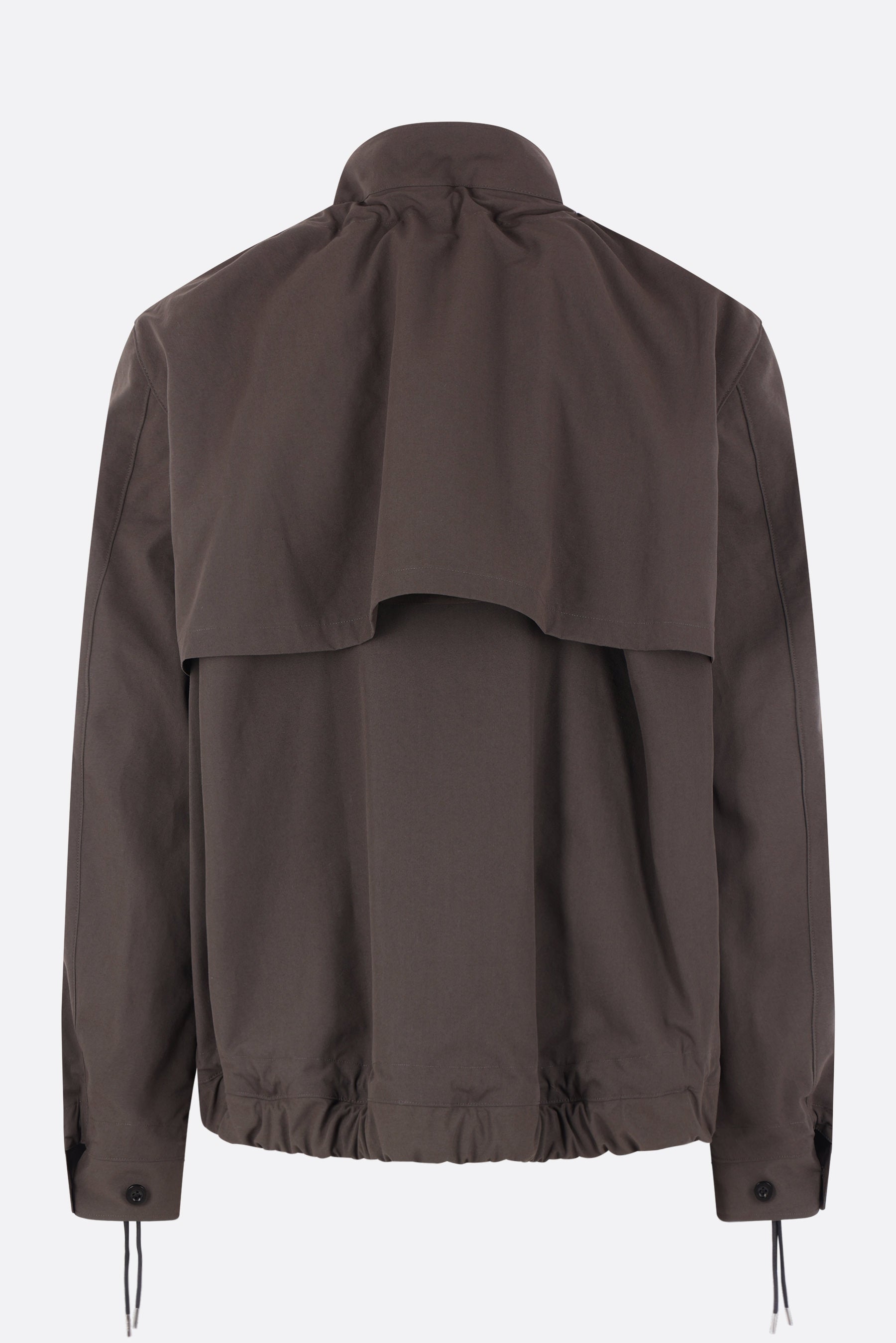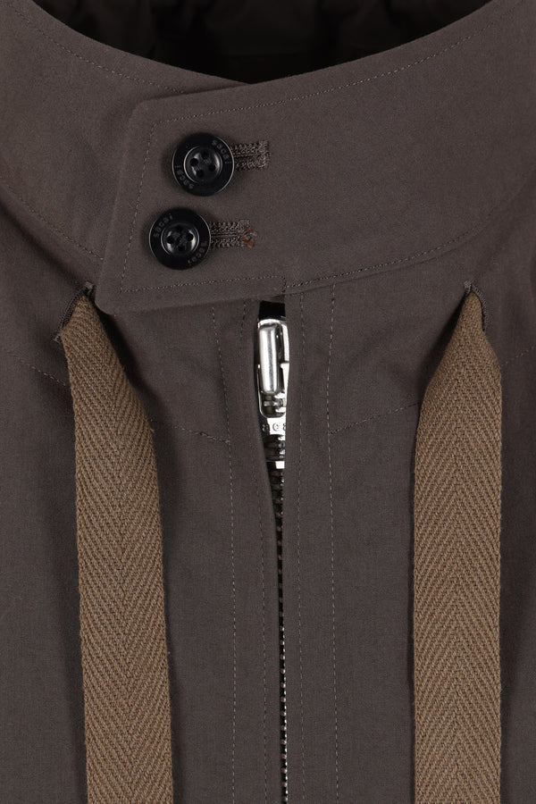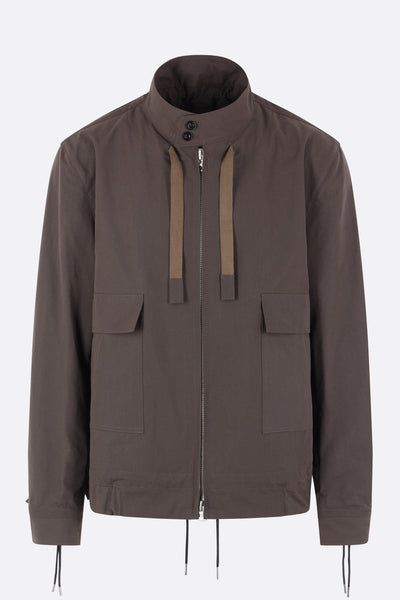 Giubbotto di Sacai realizzato in tessuto tecnico color kaki con coulisse sul collo, sui polsini e sul fondo. Caratterizzato da collo alto, chiusura frontale con zip a doppio cursore, tasche multiple, maniche lunghe con polsini abbottonati e fondo elasticizzato. Interno parzialmente foderato.