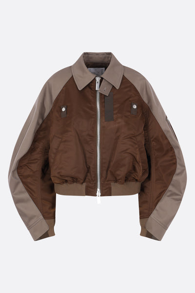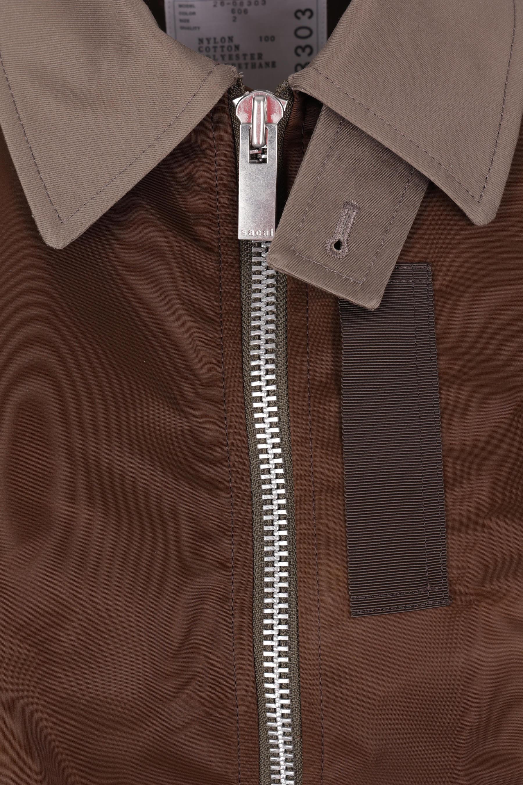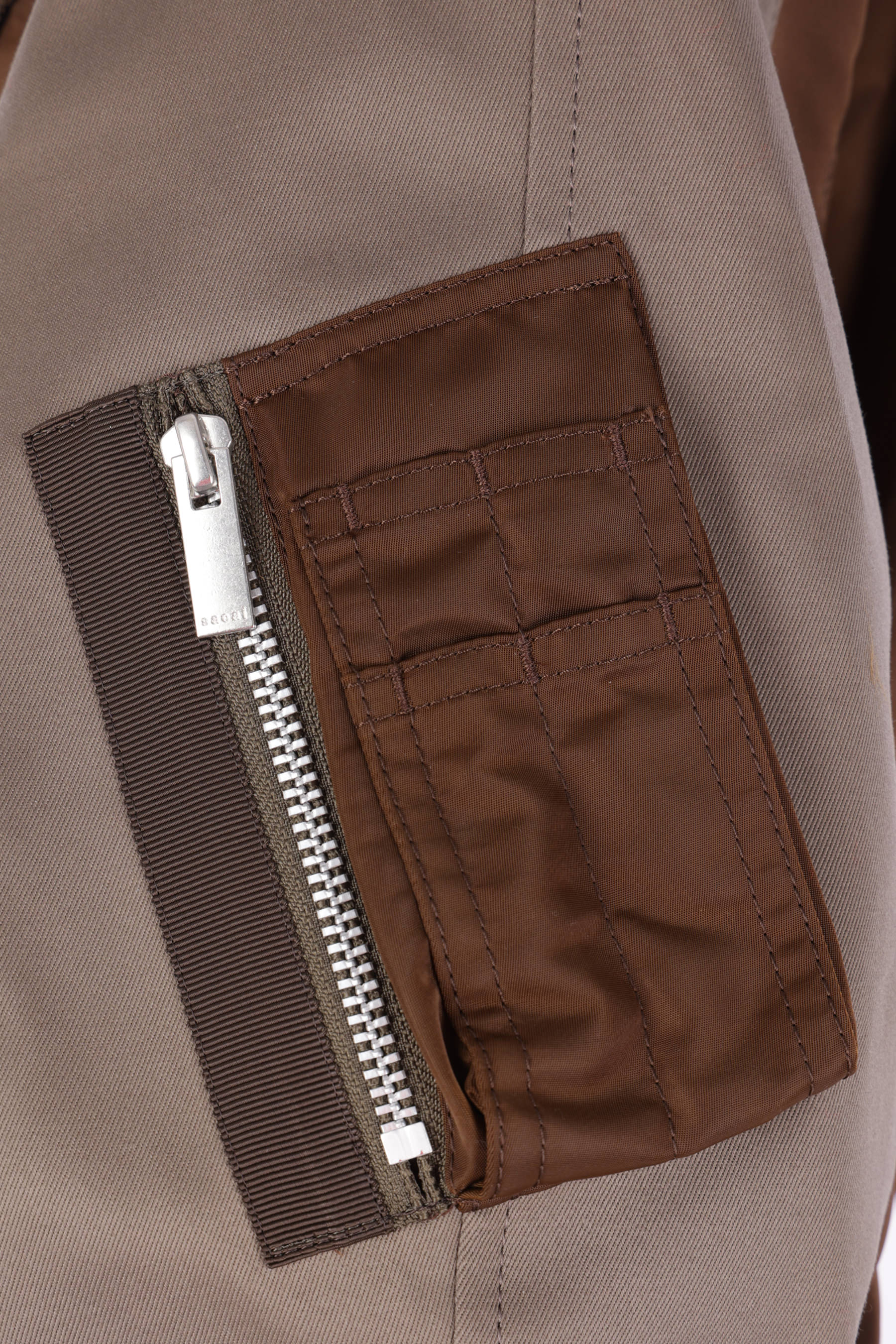 Giubbotto di Sacai realizzato in twill di nylon color marrone e gabardine di cotone color grigio. Caratterizzato da colletto a punta, chiusura frontale con zip a doppio cursore, tasche multiple, maniche lunghe e bordi in maglia a costine. Interno foderato.