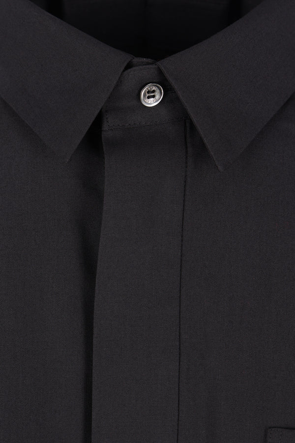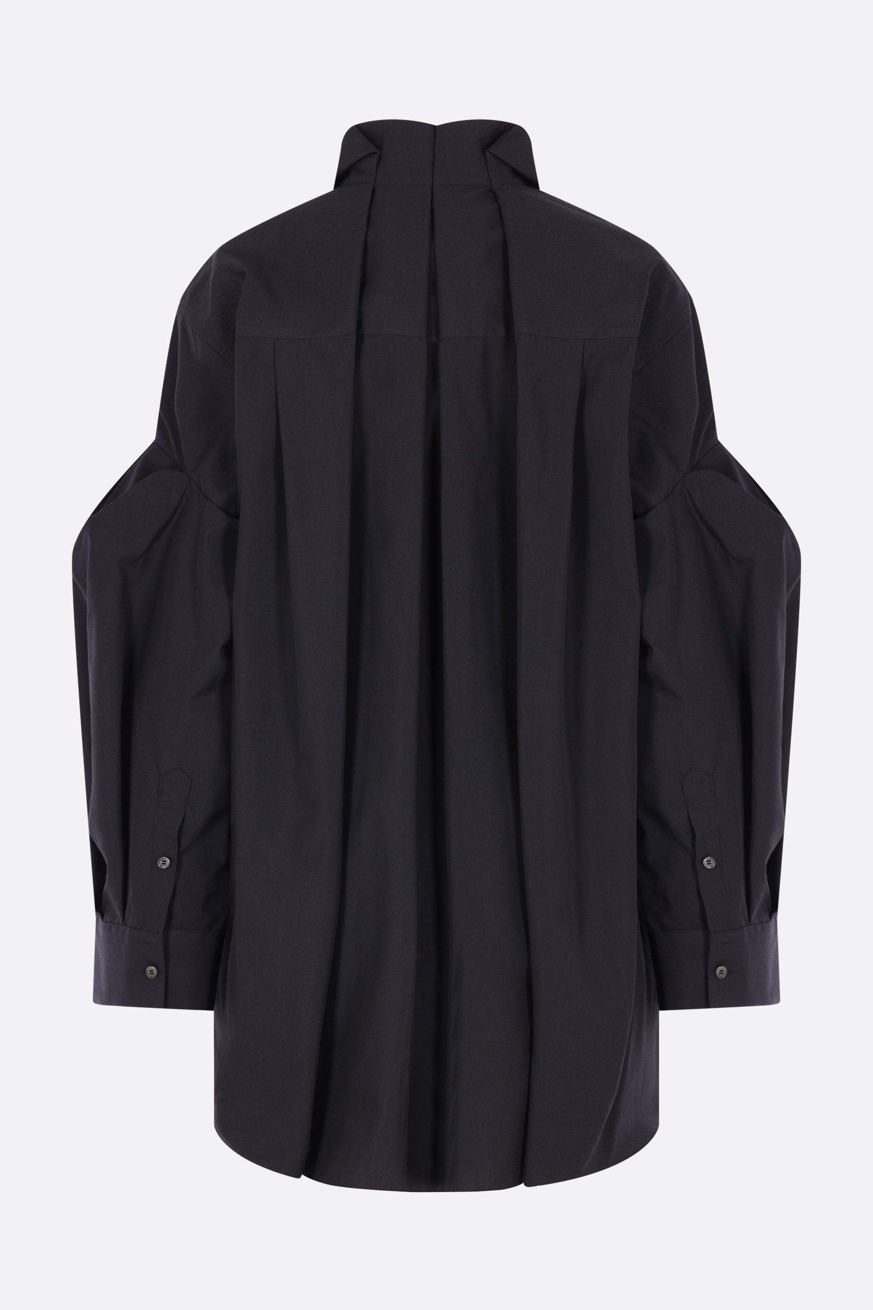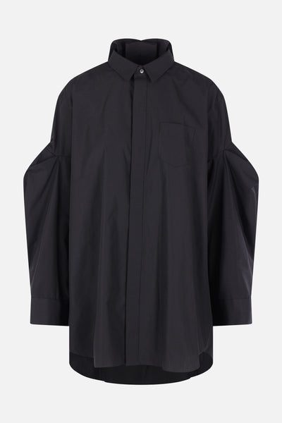 Camicia oversize di Sacai realizzata in popeline di misto cotone color nero. Caratterizzata da colletto classico, chiusura frontale nascosta con bottoni, taschino sul petto, maniche lunghe a sbuffo con polsini abbottonati, pieghe sul retro e fondo arrotondato più lungo sul retro.