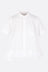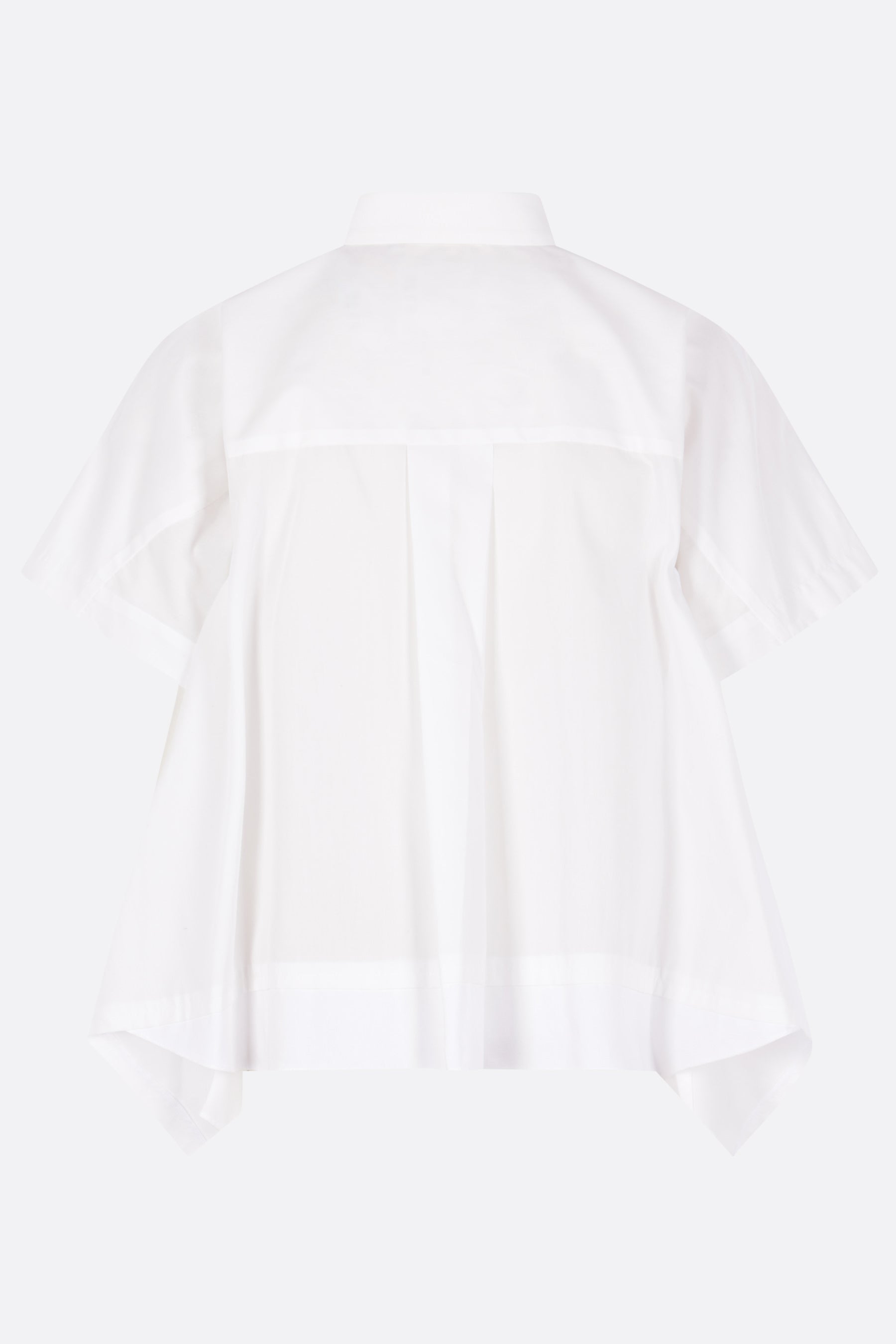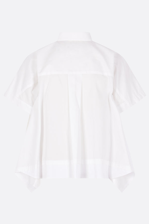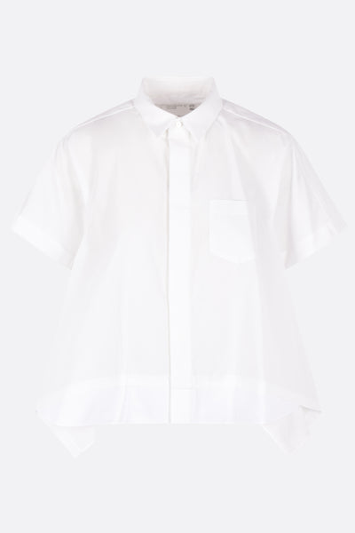 Camicia di Sacai realizzata in popeline di misto cotone color bianco con inserti in Oxford tono su tono. Caratterizzata da colletto classico, chiusura frontale nascosta con bottoni, taschino sul petto, maniche corte e fondo asimmetrico destrutturato.