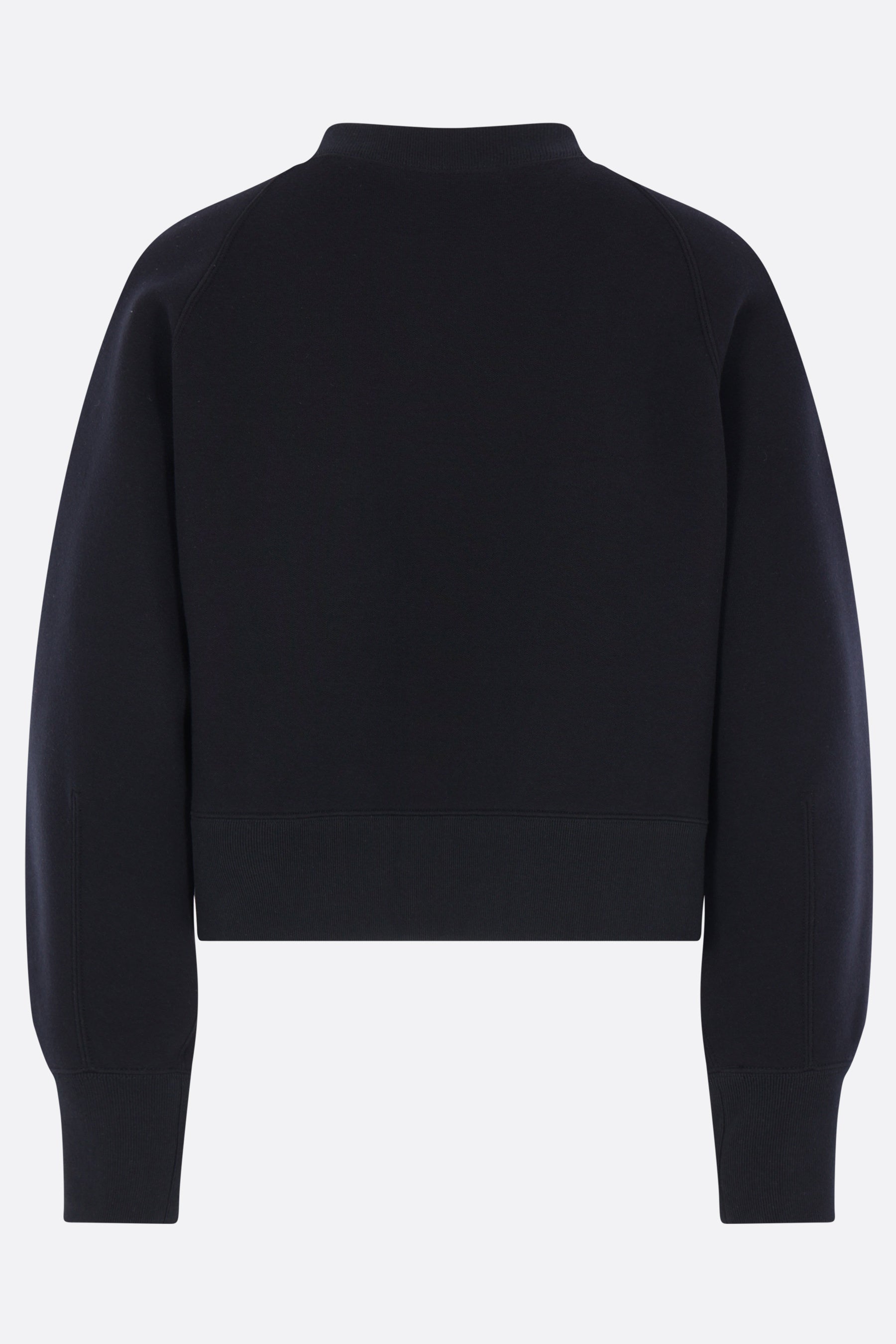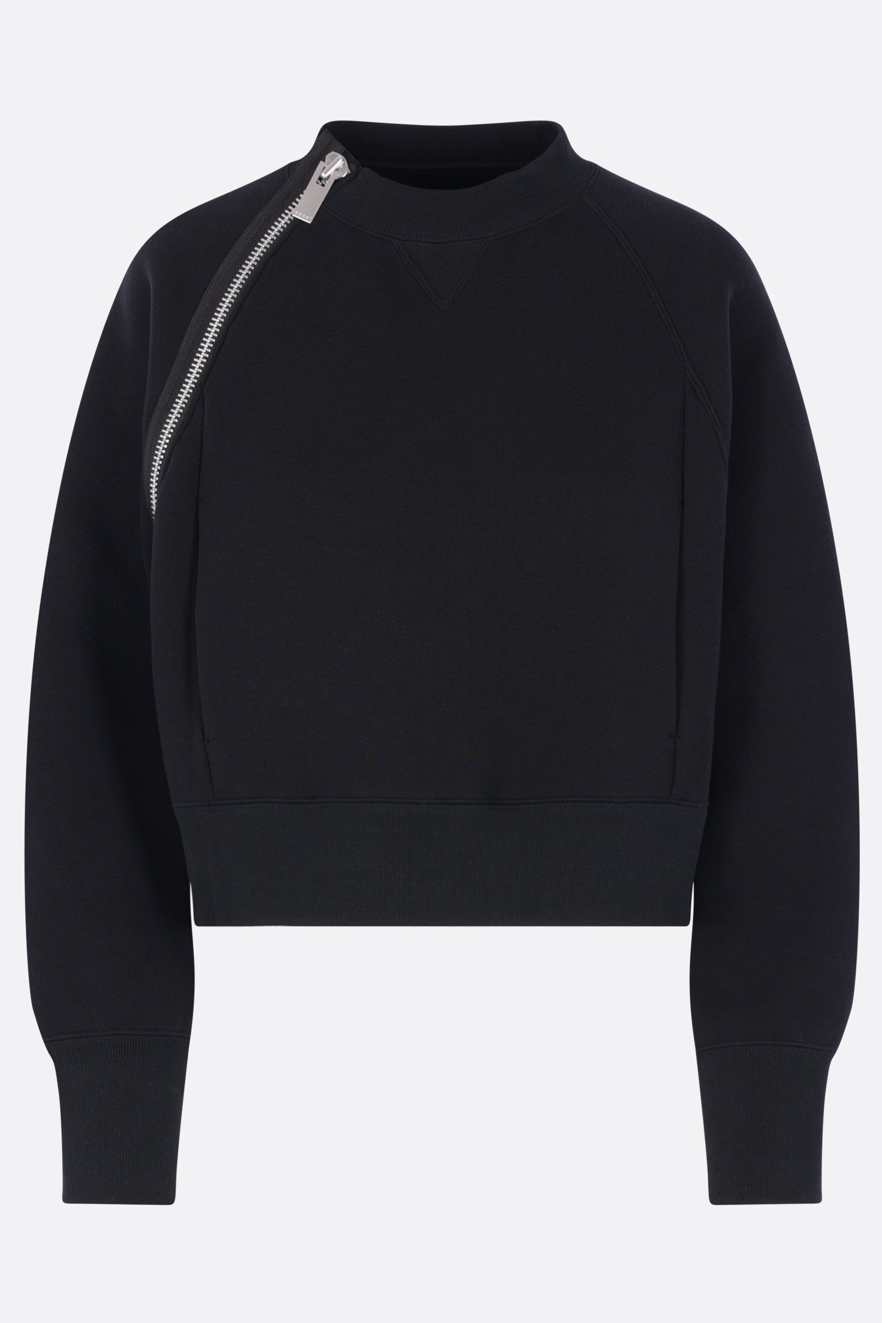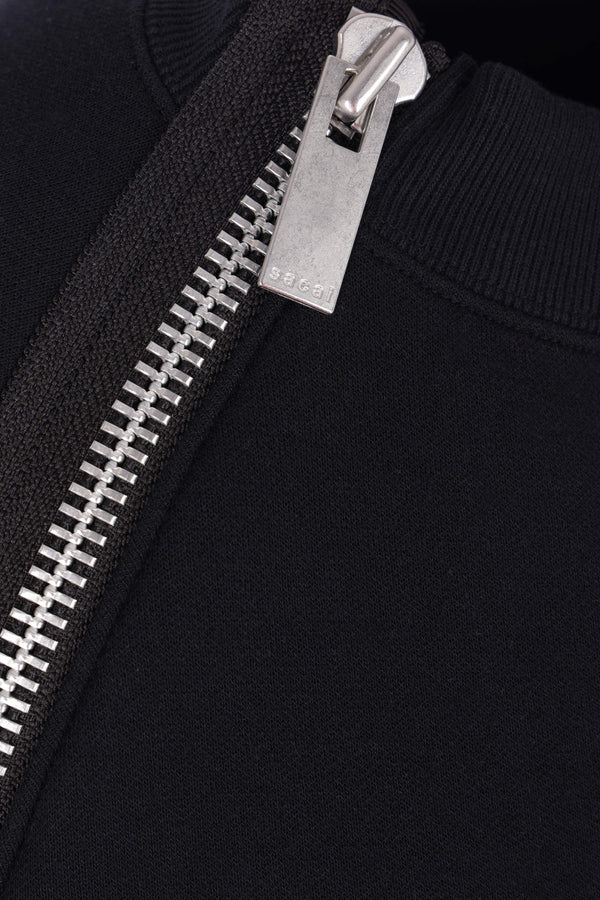 Felpa cropped di Sacai realizzata in jersey di misto cotone color nero. Caratterizzata da scollatura a giro, maniche lunghe, zip obliqua, tasche invisibili, bordi a costine e fondo dritto con spacco laterale. Completa il design il logo S in metallo applicato sul fondo.