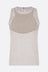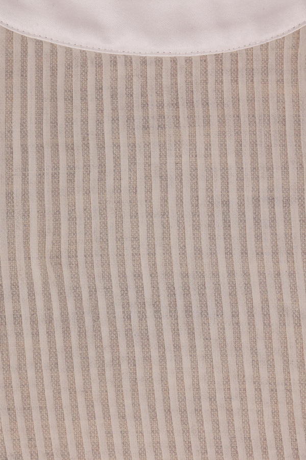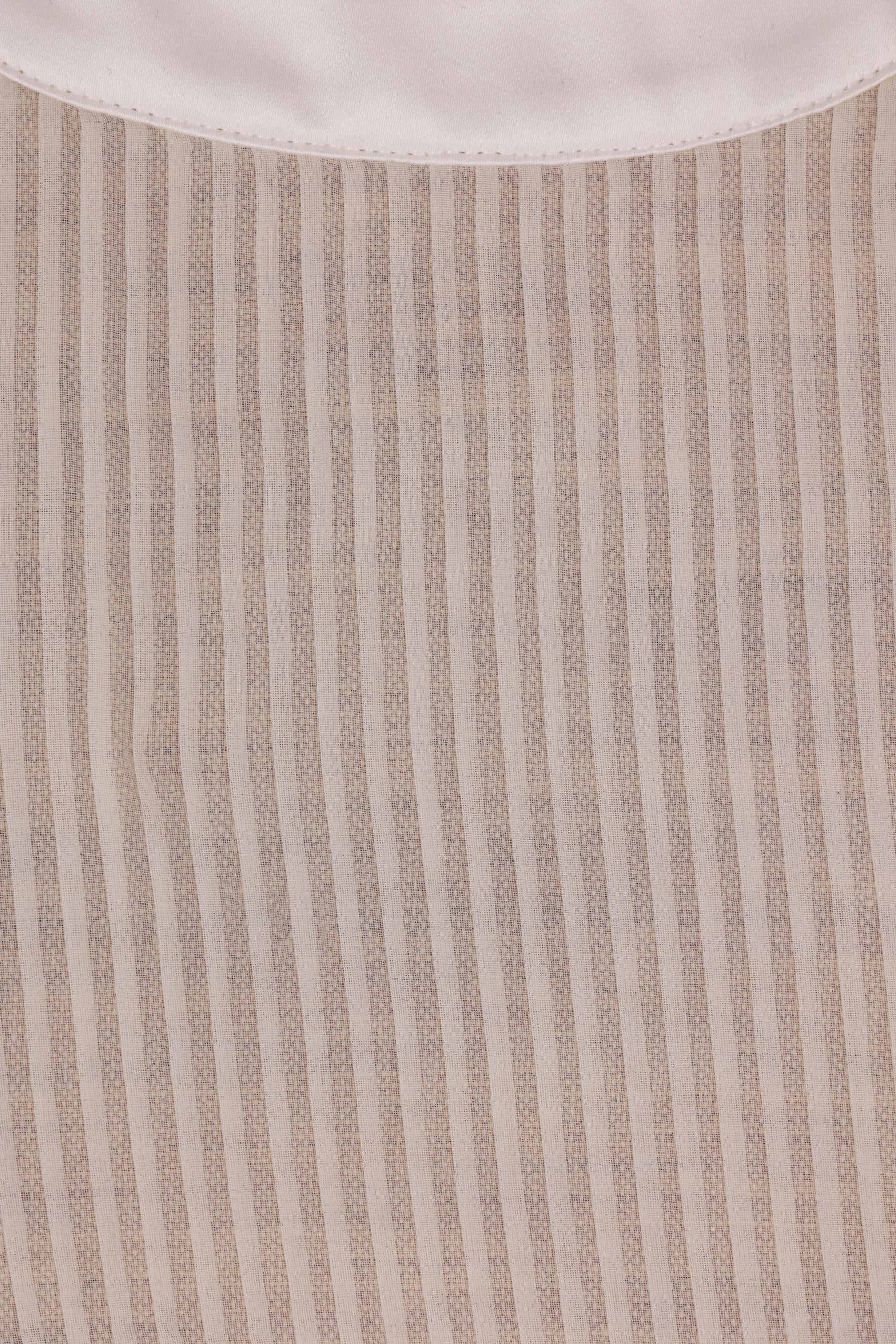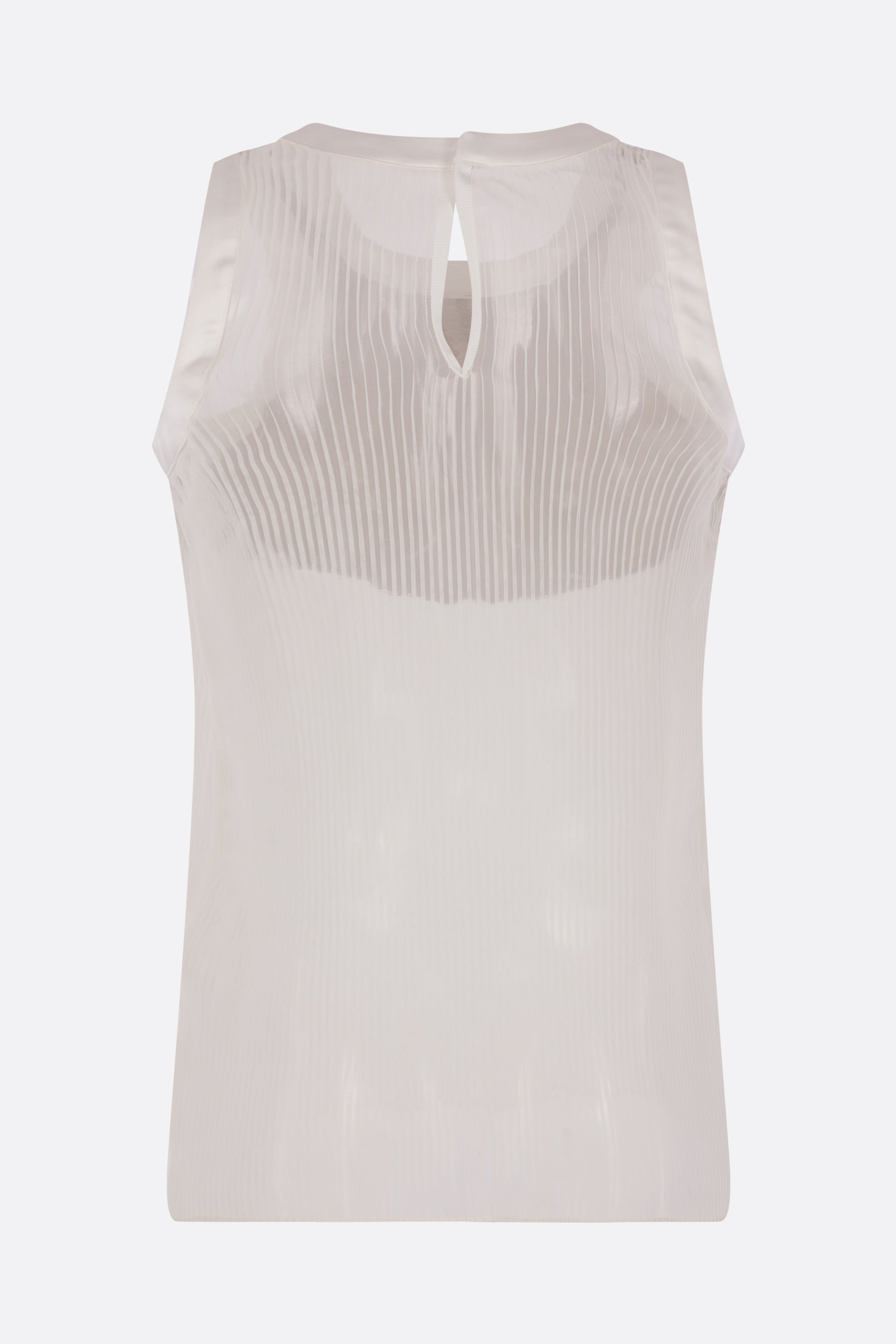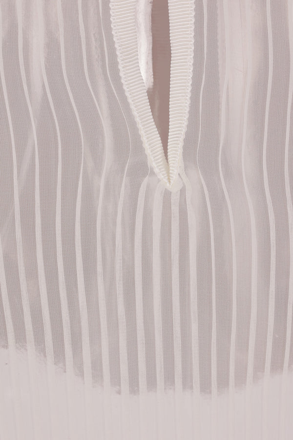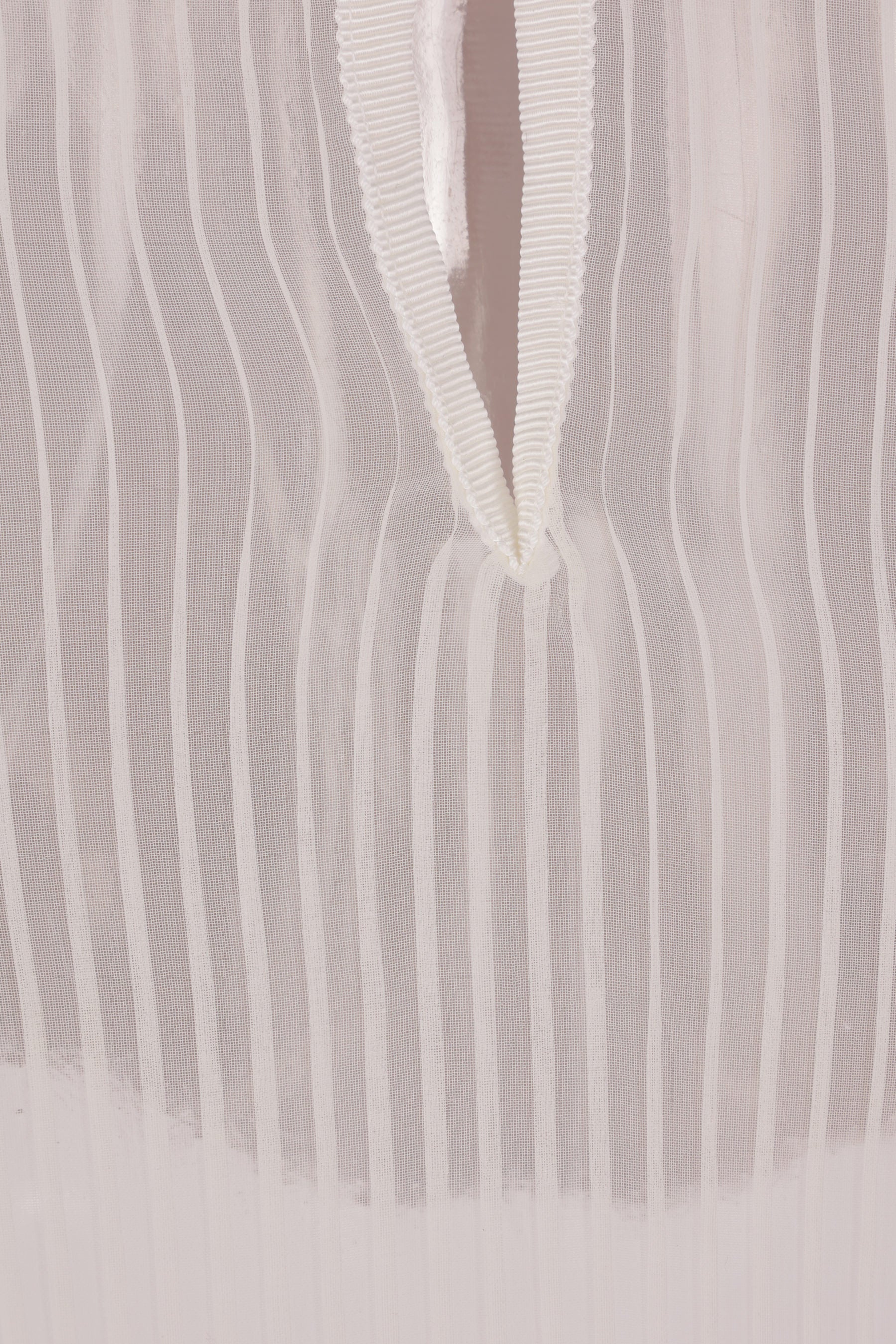 Top smanicato di Sacai realizzato in chiffon plissé color avorio con bordi in raso tono su tono. Caratterizzato da scollatura rotonda, chiusura con bottone automatico sul retro e fondo dritto. Interno foderato sul petto in tela di cotone e lana.