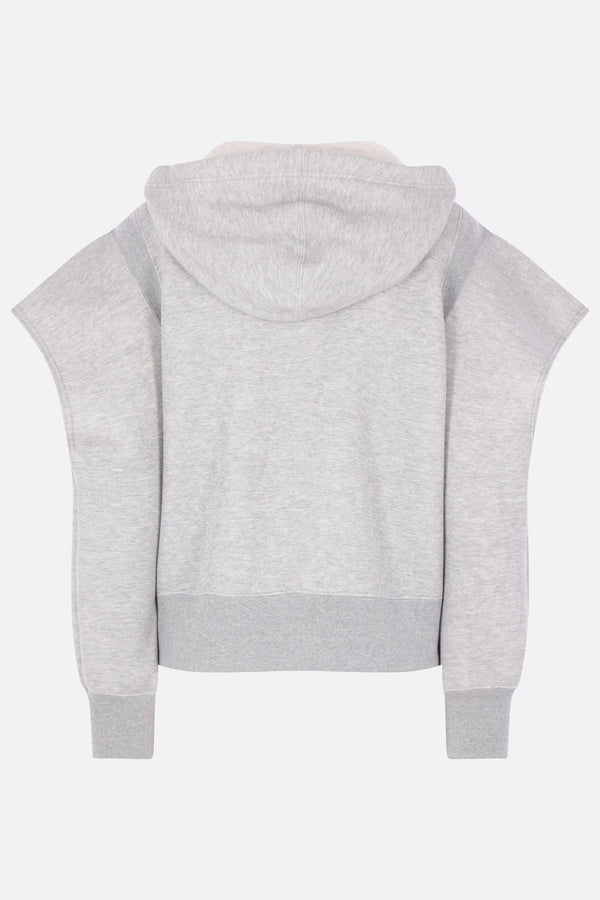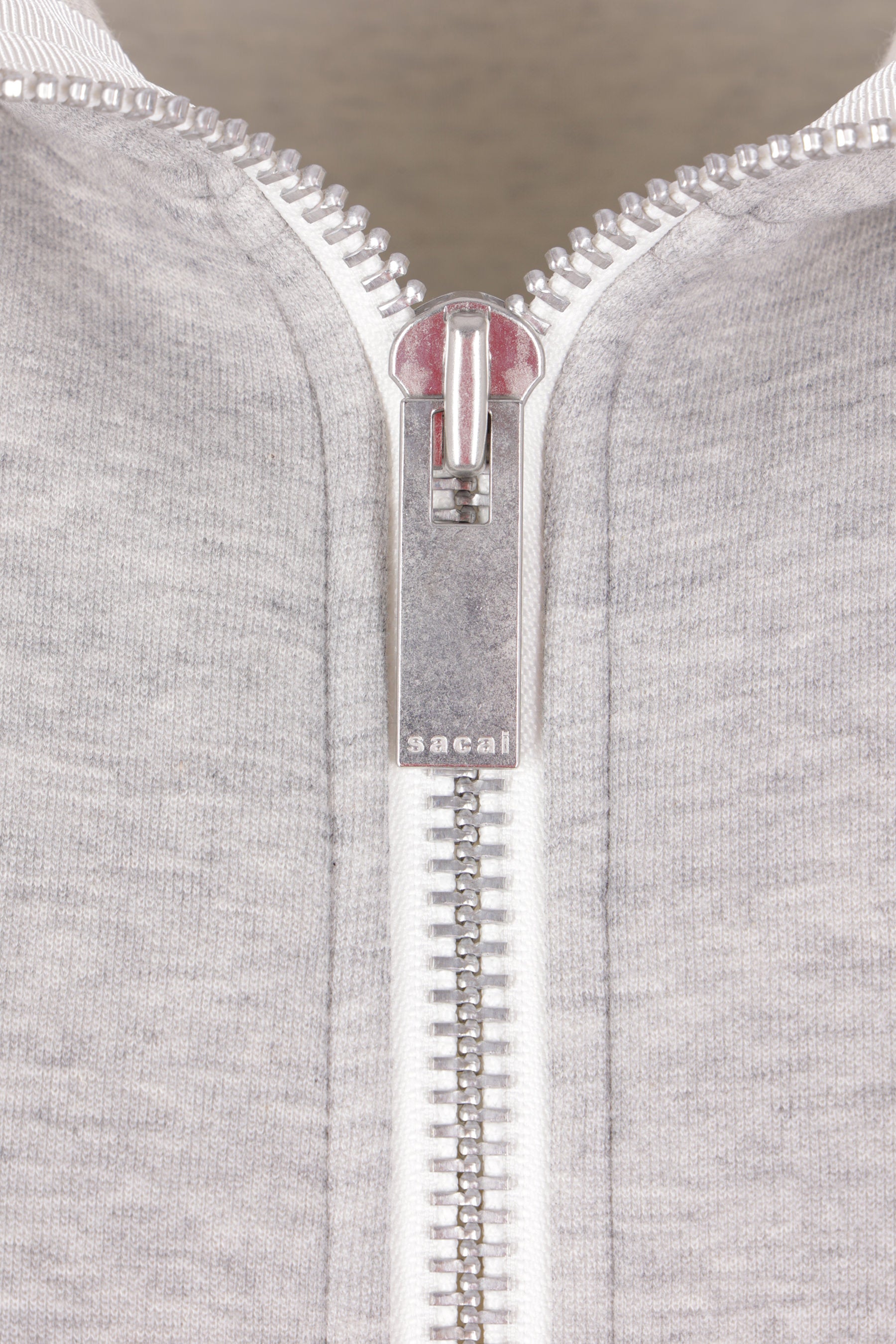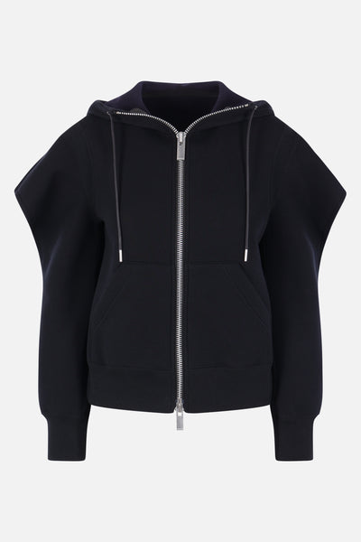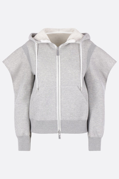 Felpa con cappuccio di Sacai realizzata in jersey di misto cotone color grigio chiaro. Caratterizzata da chiusura frontale con zip a doppio cursore, tasche a marsupio, maniche lunghe con cut-out e bordi a costine.